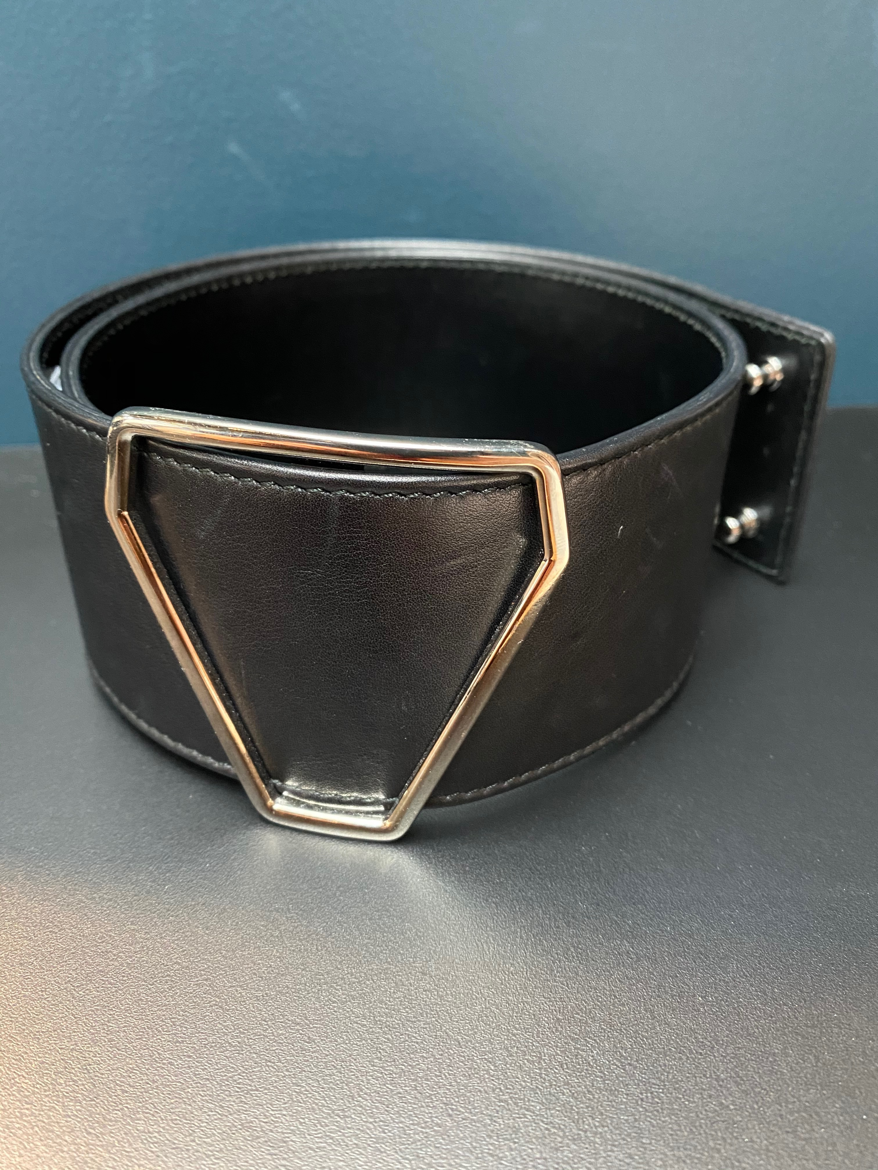 "YSL czarny pasek skórzany gładki z geometrycznym środkiem, roz. S, miejscami porysowany. Wymiary: szerokość 6 cm, długość 70 cm"