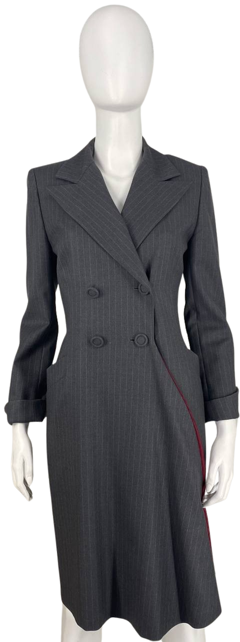 "Długi szary sukienka/płaszcz w biały prążek, zapinany dwurzędowo, na dole wstawka z malinowego materiału, kieszenie po bokach. Rozmiar 38. Posiada kilka dziurek przy zapięciu. Brak metki ze składem.