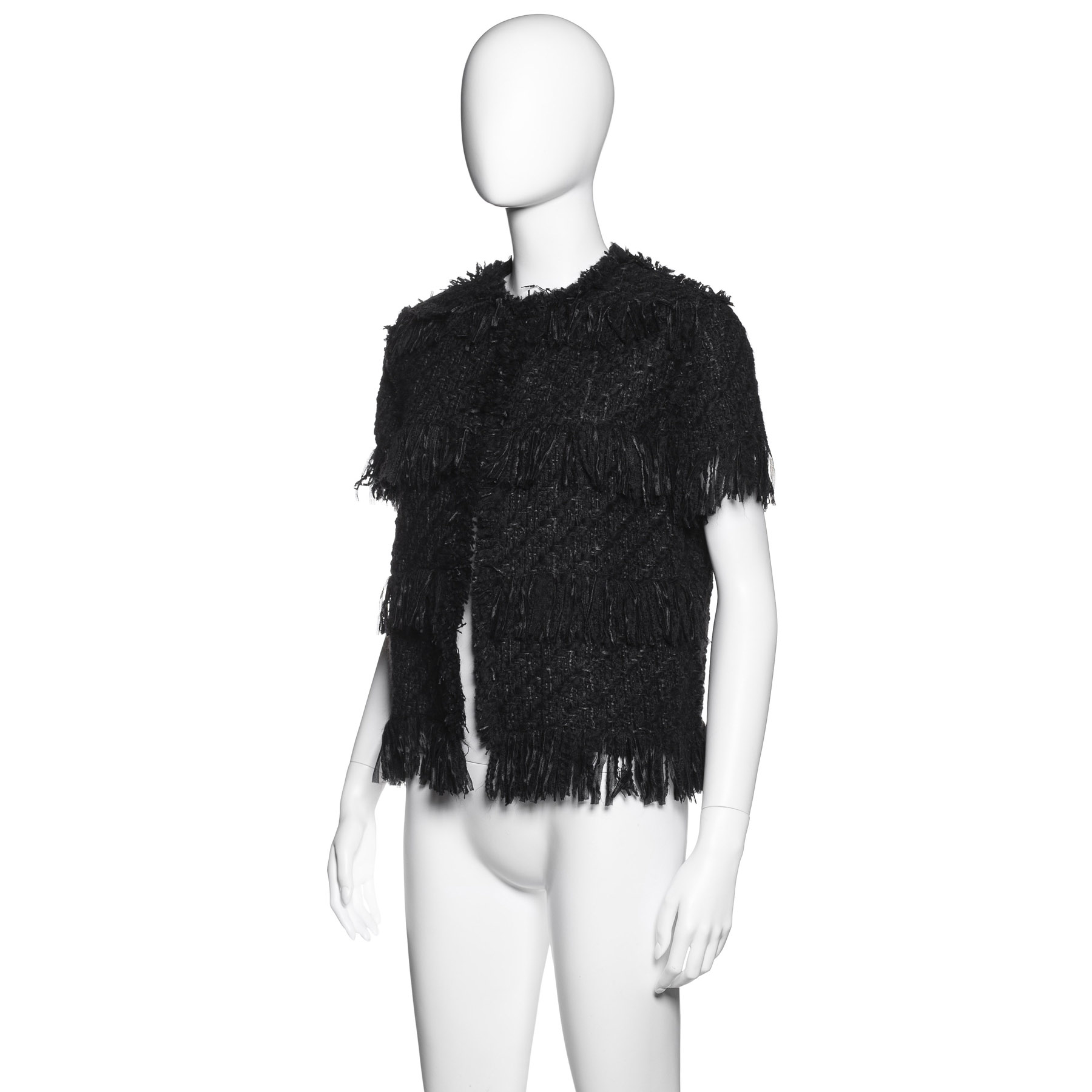 "czarny wełniany żakiet bouckle z krótkim rękawem, duża ilość drobnych frędzli, zapinany na ukryte haftki, roz. 38