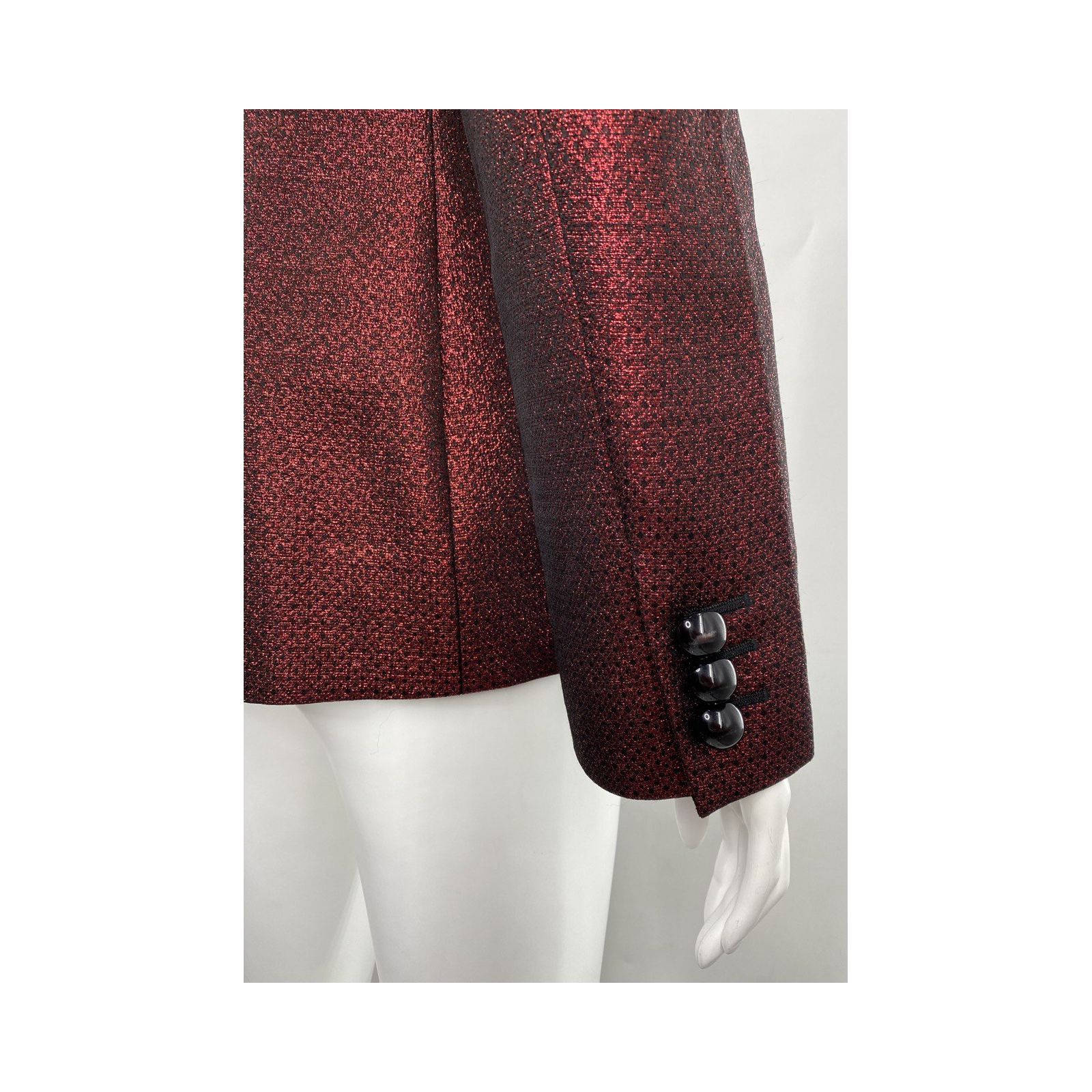 "czerwony, metaliczny żakiet z czerwonymi klapami, czarna podszewka w białe kropki, nowy z metkami, rozmiar 42it