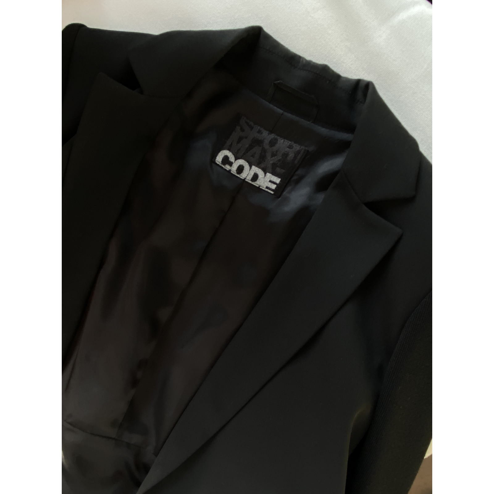 "czarny żakiet z klapami, bez zapięcia, z tyłu regulowana patka, dzianinowe rękawy. Rozmiar IT 38. Skład: 53% polyester, 43% virgin wool, 4% elastan.