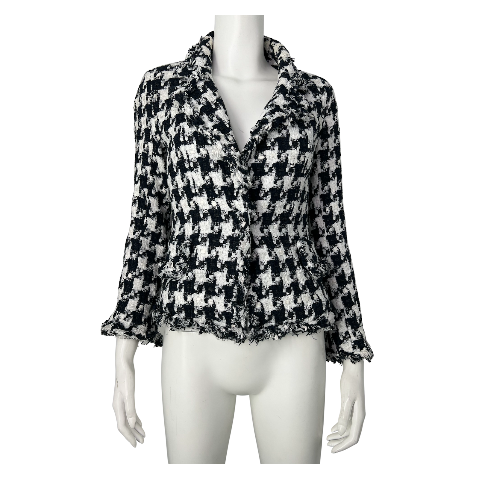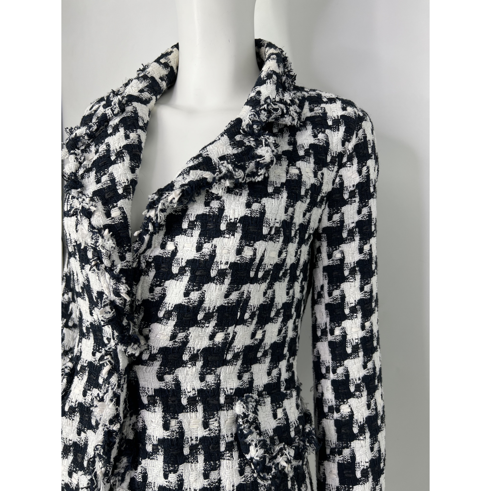 "żakiet tweedowy we wzór dużej pepitki biało-granatowej, zapięcie na jeden logowany guzik, brzegi postrzępione. Rozmiar 36. Skład: 71% bawełna, 21% poliester, 6% poliuretan, 1% akryl, 1% wełna. Wymiary: szer. ramion 35 cm, szer. biustu 42 cm, szer. talii 38 cm, dł. całkowita 57 cm, dł. rękawa 56 cm."