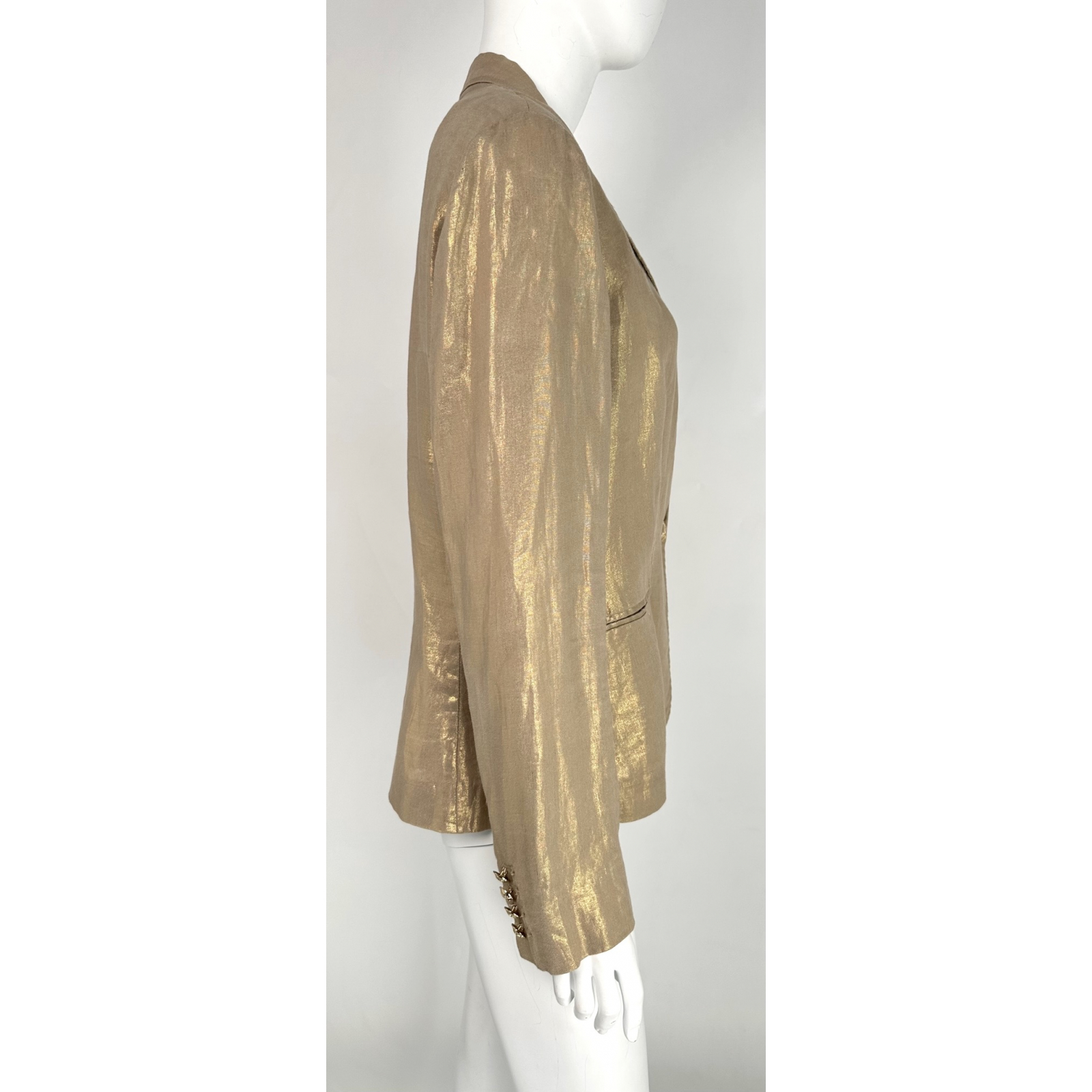 "złoto beżowy żakiet delikatnie mieniący się, na pół podszewce, taliowany, guziki w kolorze złota, wąskie klapy. Rozmiar 8 z metki. Skład 100% len. Wymiary: szer. ramion 40 cm, szer. biustu 50 cm, szer. talii 44 cm, dł. całkowita 65 cm, dł. rękawa 62 cm."