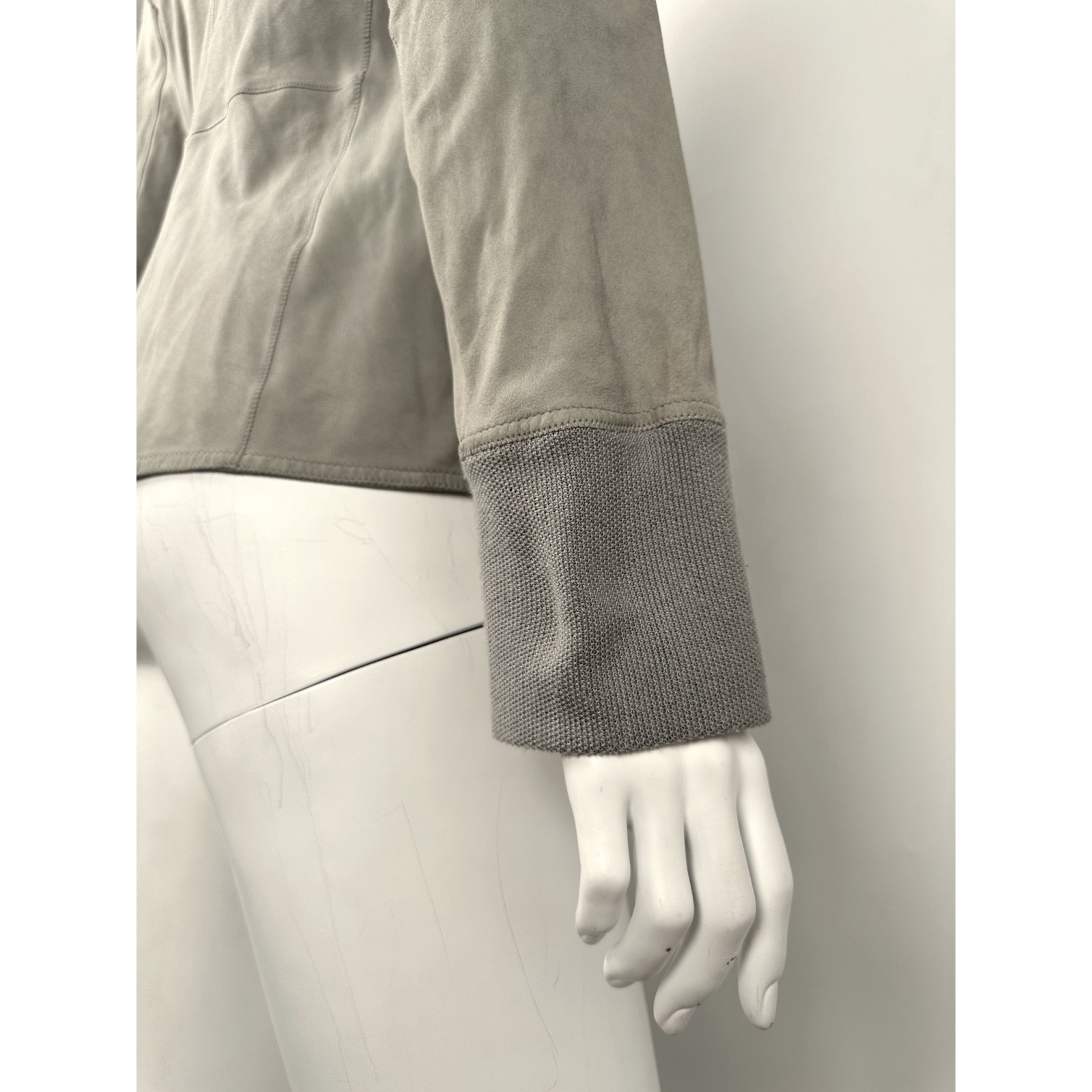 "szarozielony zamszowy żakiet, zapinany z przodu na srebrną klamrę, rękawy i dekolt wykończone szarym materiałem, taliowany, boczne kieszenie. Rozmiar IT 42. Skład: 100% skóra. Wymiary: szer. ramion 39 cm, szer. biustu 42 cm, szer. biustu 37 cm, dł. całkowita 62 cm, dł. rękawa 60 cm."