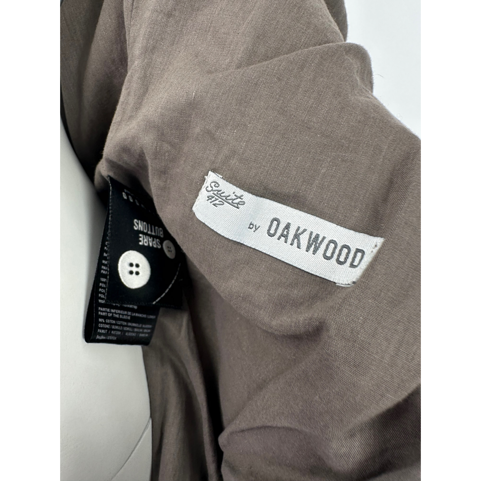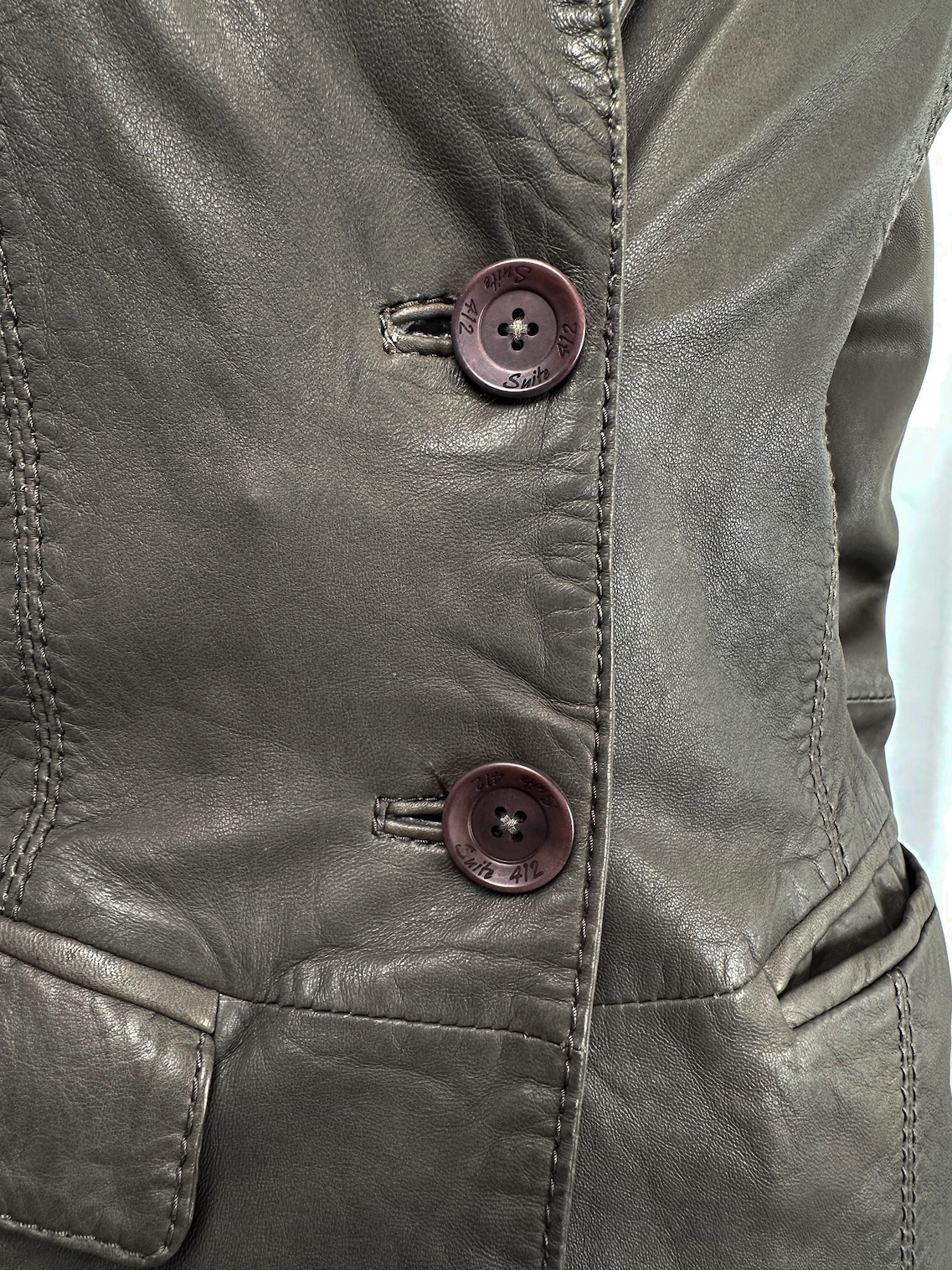 "Skórzany żakiet w kolorze khaki, zapinany na brązowe guziki z logo marki, długie rękawy wykończone bawełnianymi wstawkami w kolorze ciemnoszarym, na przodzie dwie kieszenie z klapami, taliowany, głęboki dekolt, przy metce wszyty dodatkowy guzik, używany. Stan dobry, lekko wytarta skóra na lewym ramieniu. Rozmiar z metki M. Skład: 100% skóra naturalna; podszewka: 100% bawełna. Wymiary: linia ramion 36cm, długość rękawa 76cm, długość całkowita 62cm, szerokość ( mieszona od pachy do pachy) 39 cm."