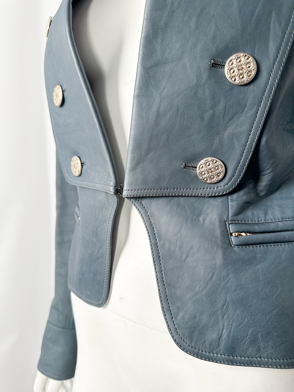 "Niebieski skórzany żakiet, krótki, dekoracyjne srebrne logowane guziki na przodzie, zapinany na krytą haftkę, zaokrąglony kołnierz, dwie zapinane kieszenie zasuwane na złoty suwak z logo, proste długie rękawy, rozpinane mankiety, rozporek z tyłu. Skład: 100% skóra jagnięca; podszewka: 75% bawełna, 25% jedwab. Wymiary: szerokość mierzona od pachy do pachy 42cm, długość całkowita 50cm, długość rękawa 64cm."