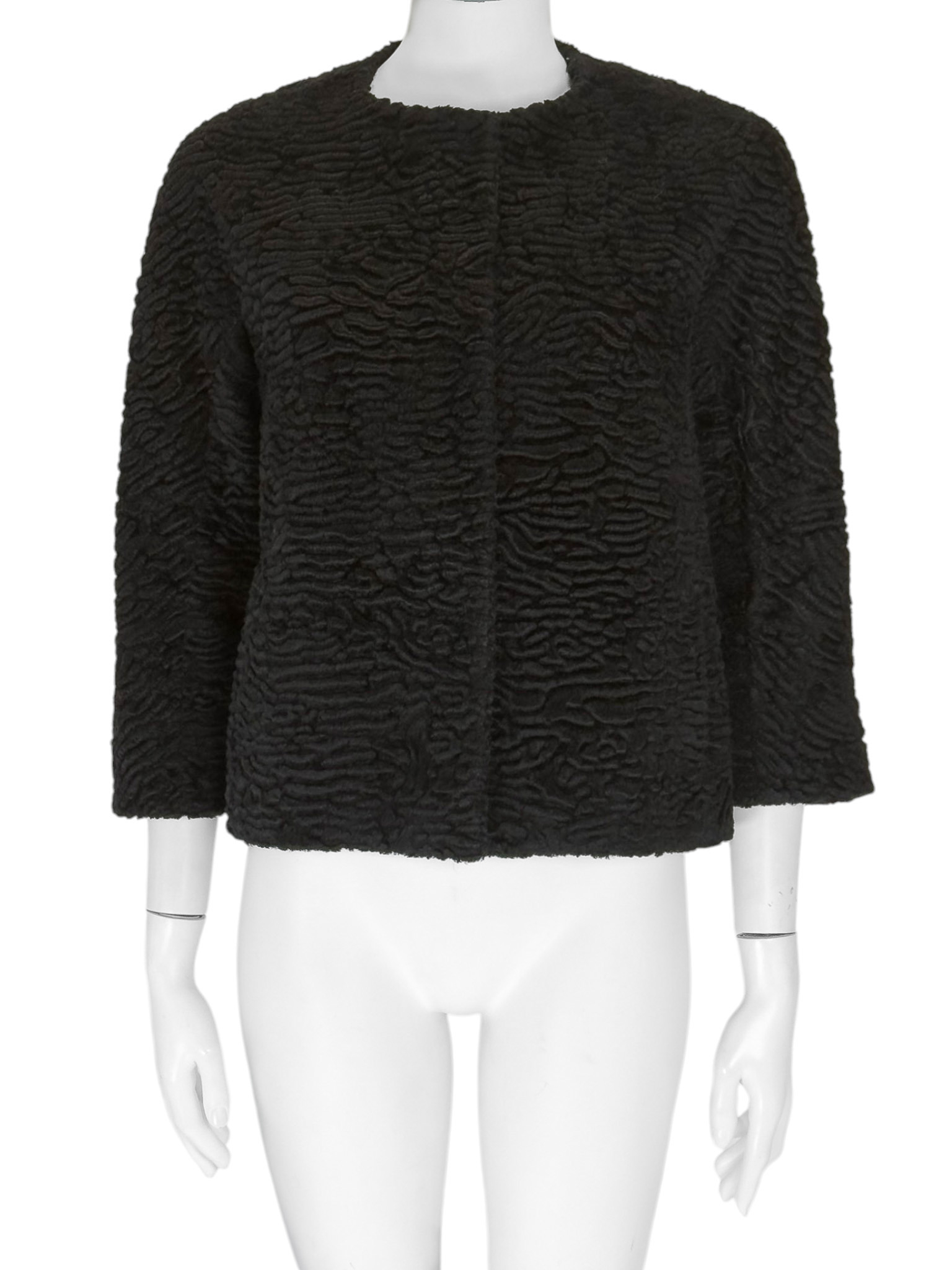"Czarny aksamitny żakiet ozdobiony wytłaczanym wzorem, zaokrąglony dekolt, zapinany na kryte zatrzaski, krótki krój, dwie kryte kieszenie po bokach. Rozmiar z metki IT 38. Skład: 60% akryl, 24% bawełna, 16% poliester; podszewka: 100% poliamid."
