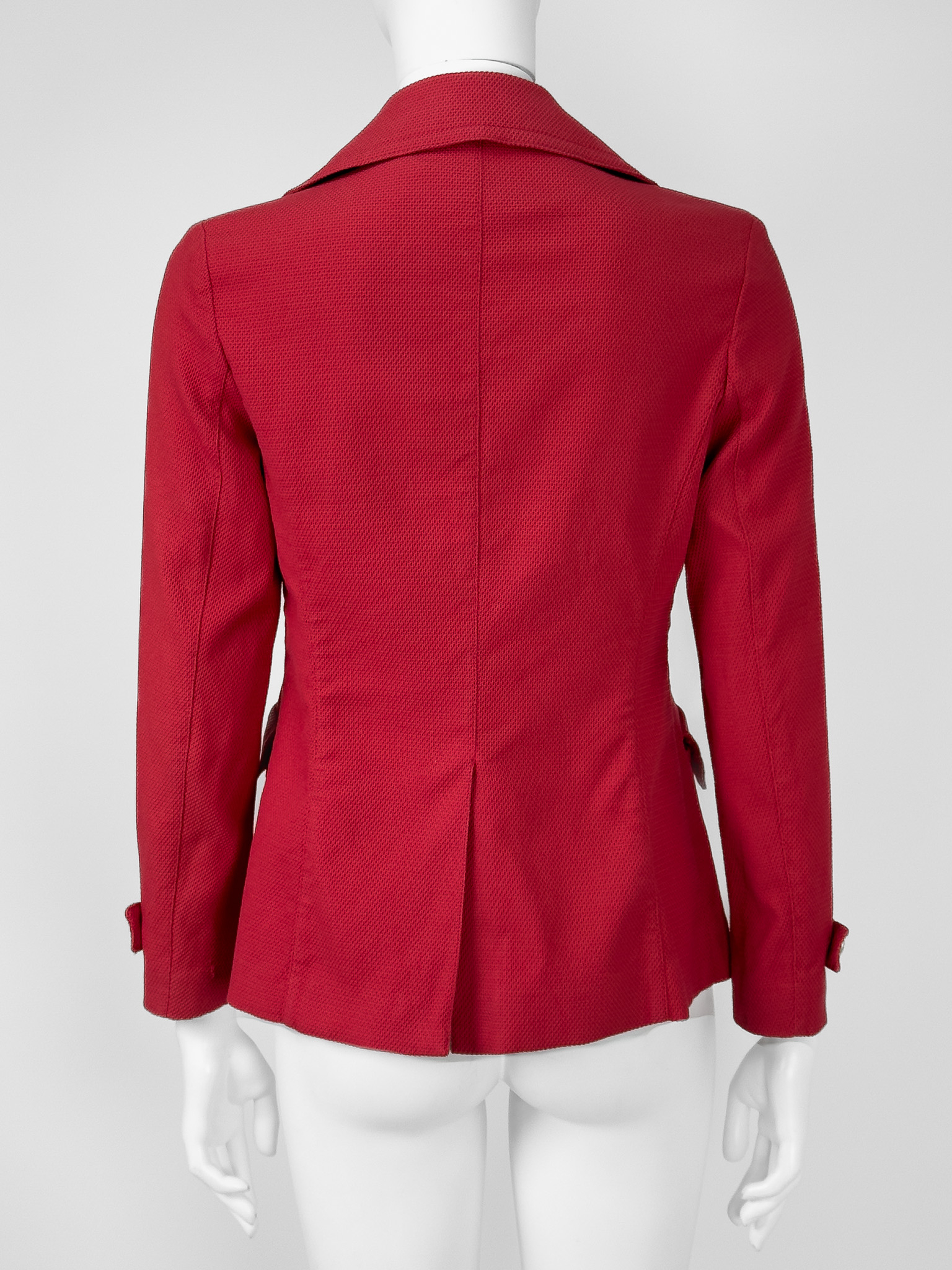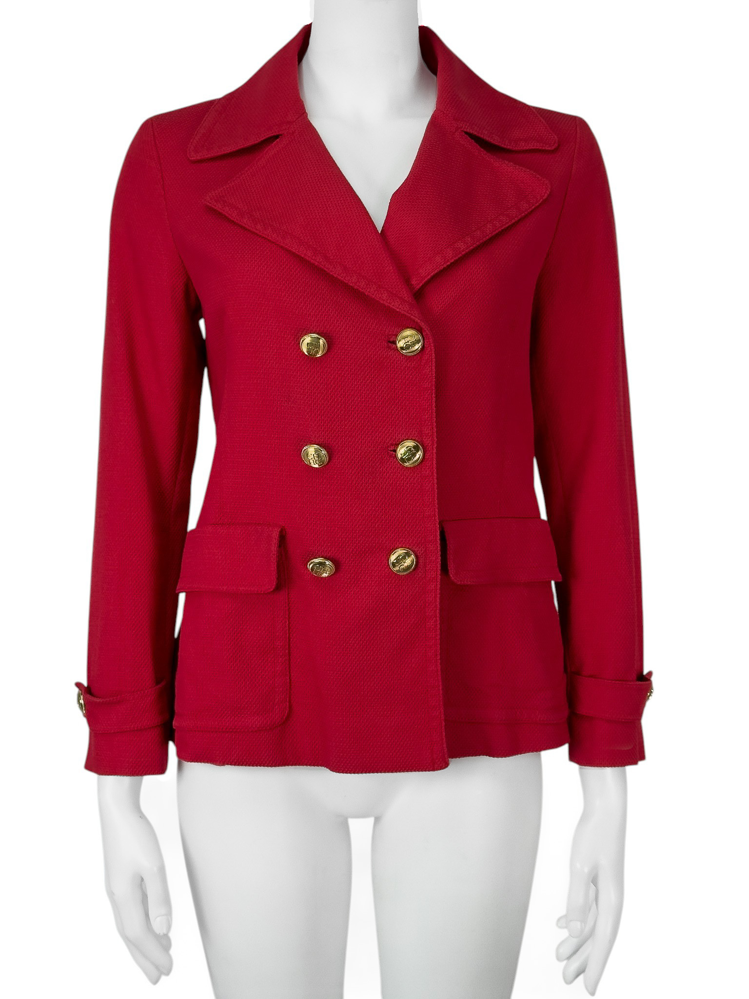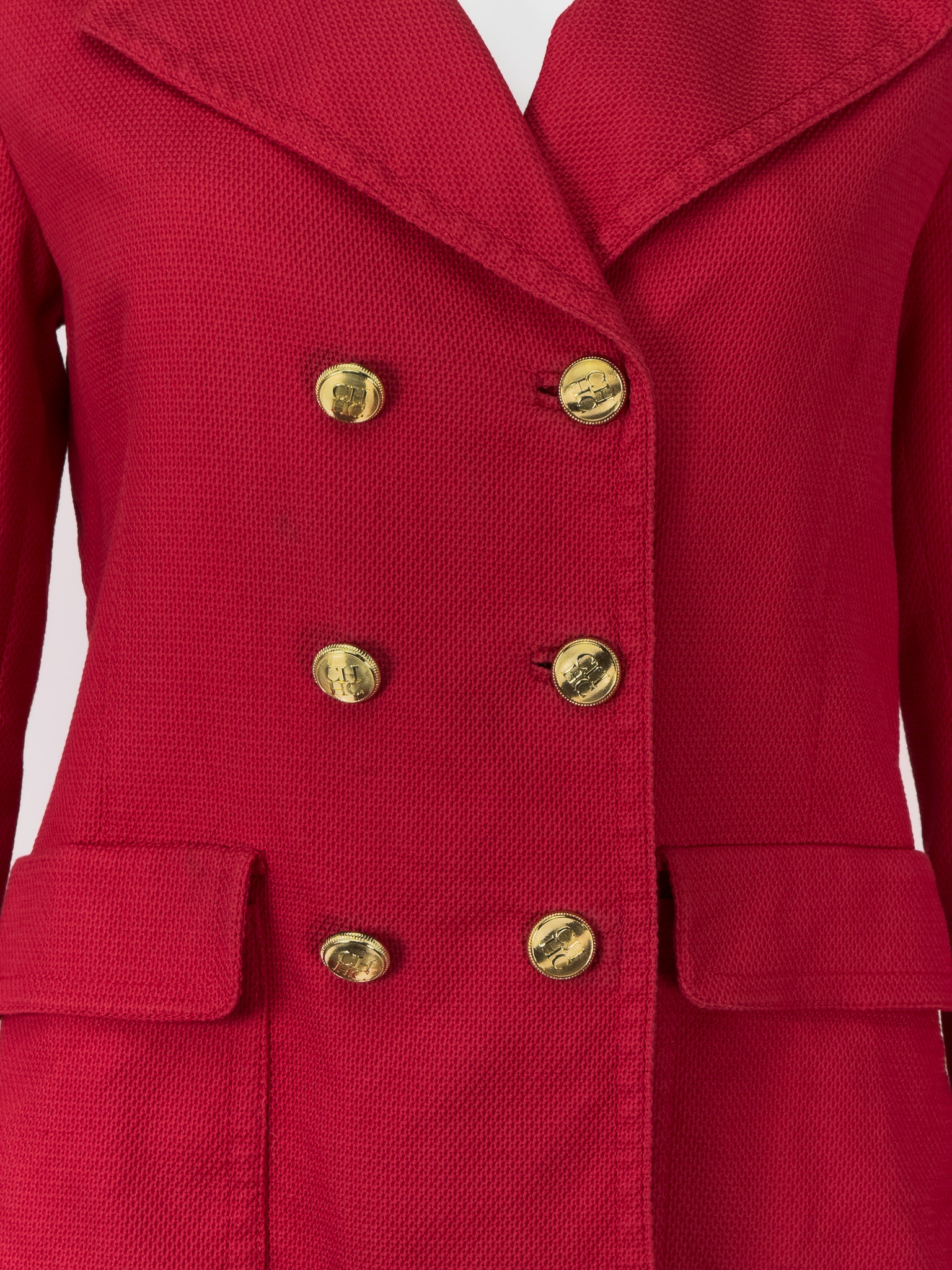 "Czerwony żakiet ze złotymi logowanymi guzikami oraz dwoma kieszeniami, dwurzędowy, tailiowany, dwie kieszenie z klapami po bokach. Rozmiar z metki M. Stan: dobry, naderwana metka oraz plamka przy guzikach. Wymiary: szerokść mierzona od pachy do pachy 48cm, długość całkowita 60cm."