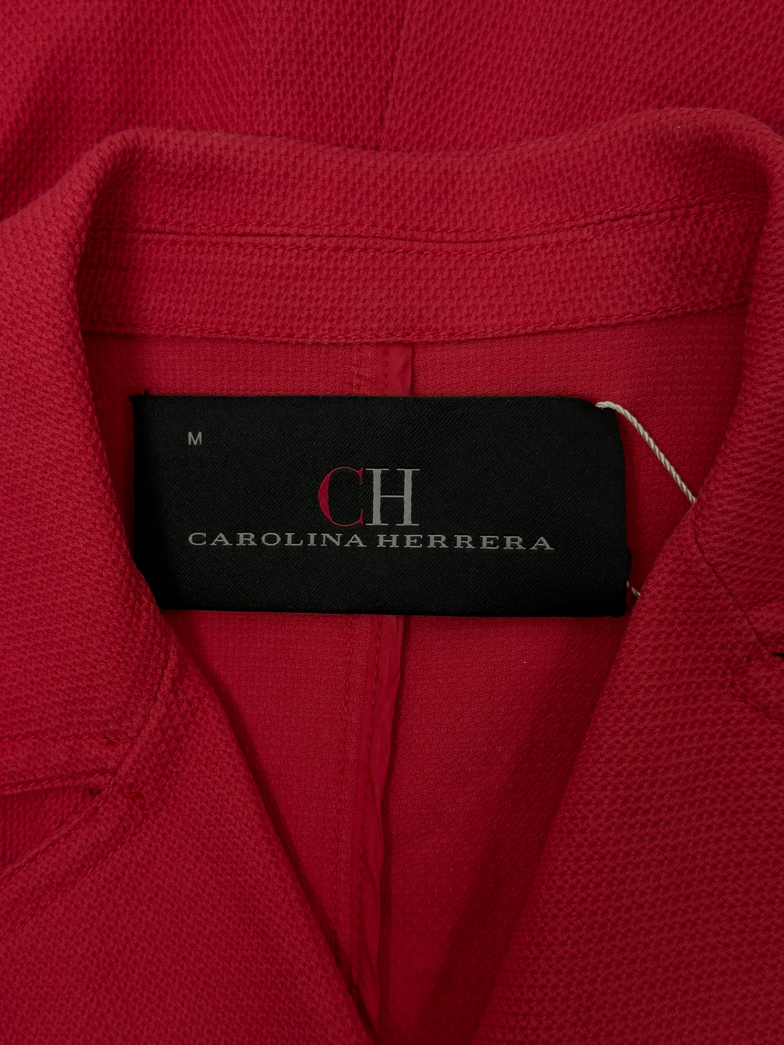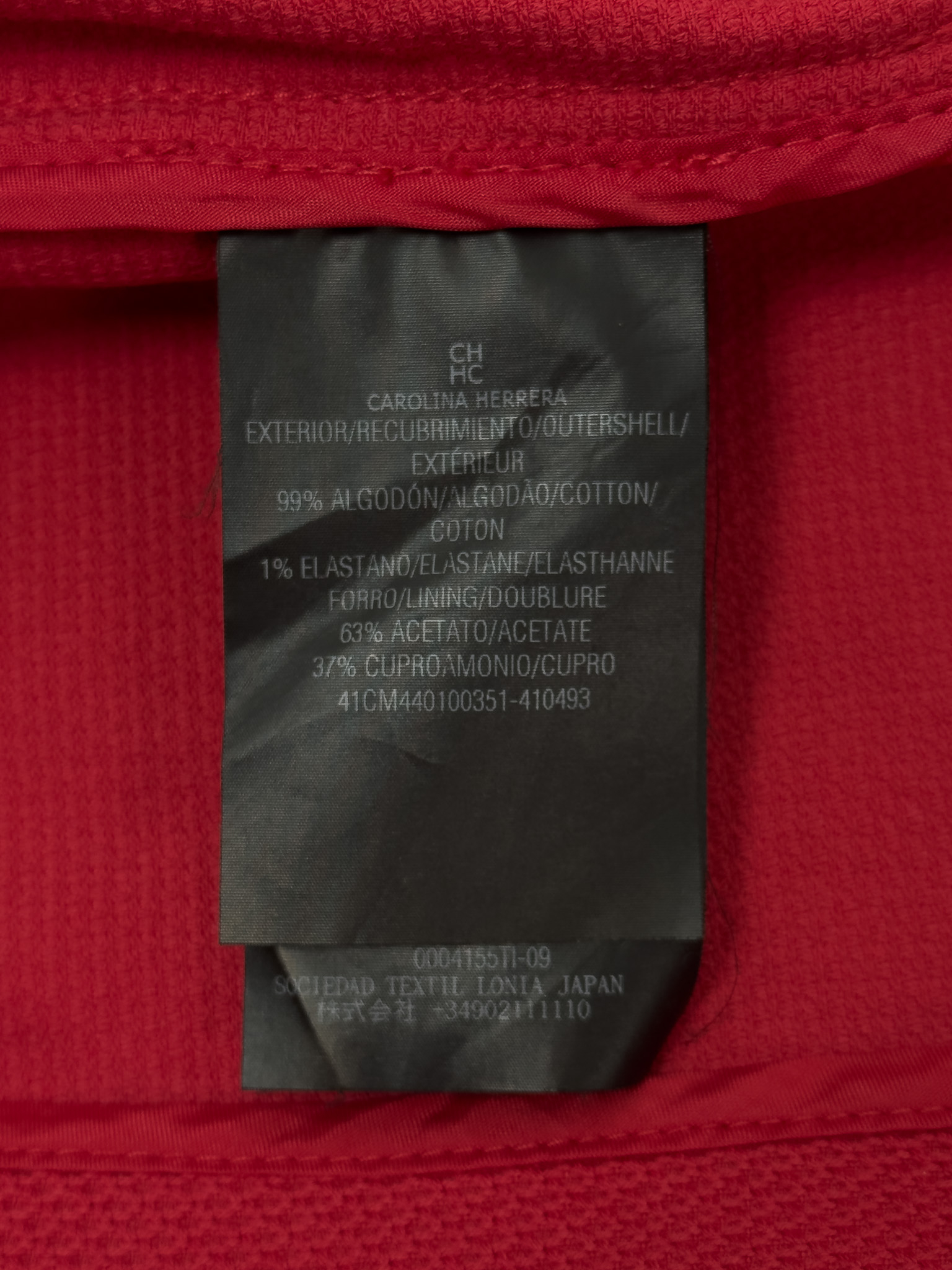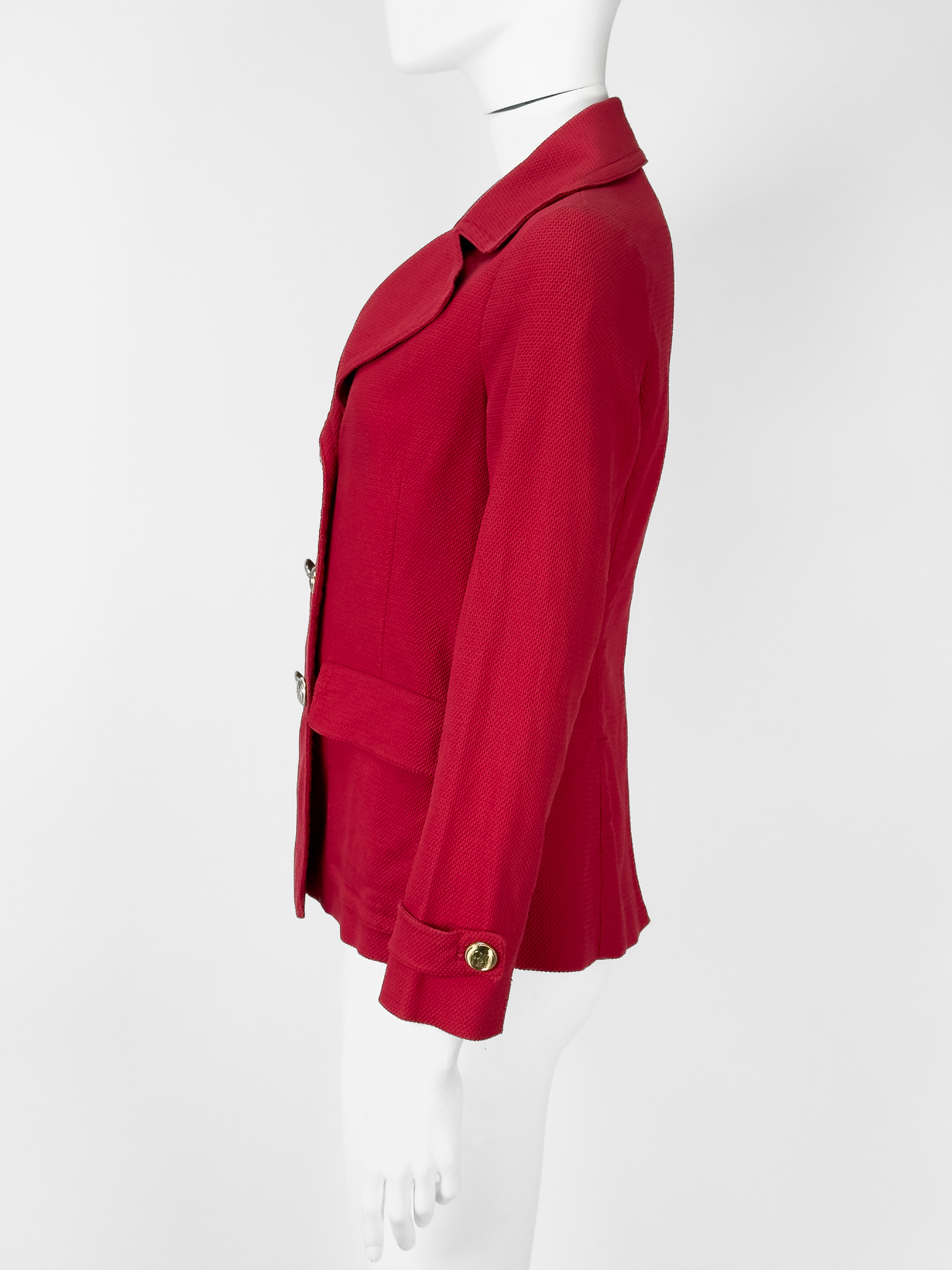 "Czerwony żakiet ze złotymi logowanymi guzikami oraz dwoma kieszeniami, dwurzędowy, tailiowany, dwie kieszenie z klapami po bokach. Rozmiar z metki M. Stan: dobry, naderwana metka oraz plamka przy guzikach. Wymiary: szerokść mierzona od pachy do pachy 48cm, długość całkowita 60cm."