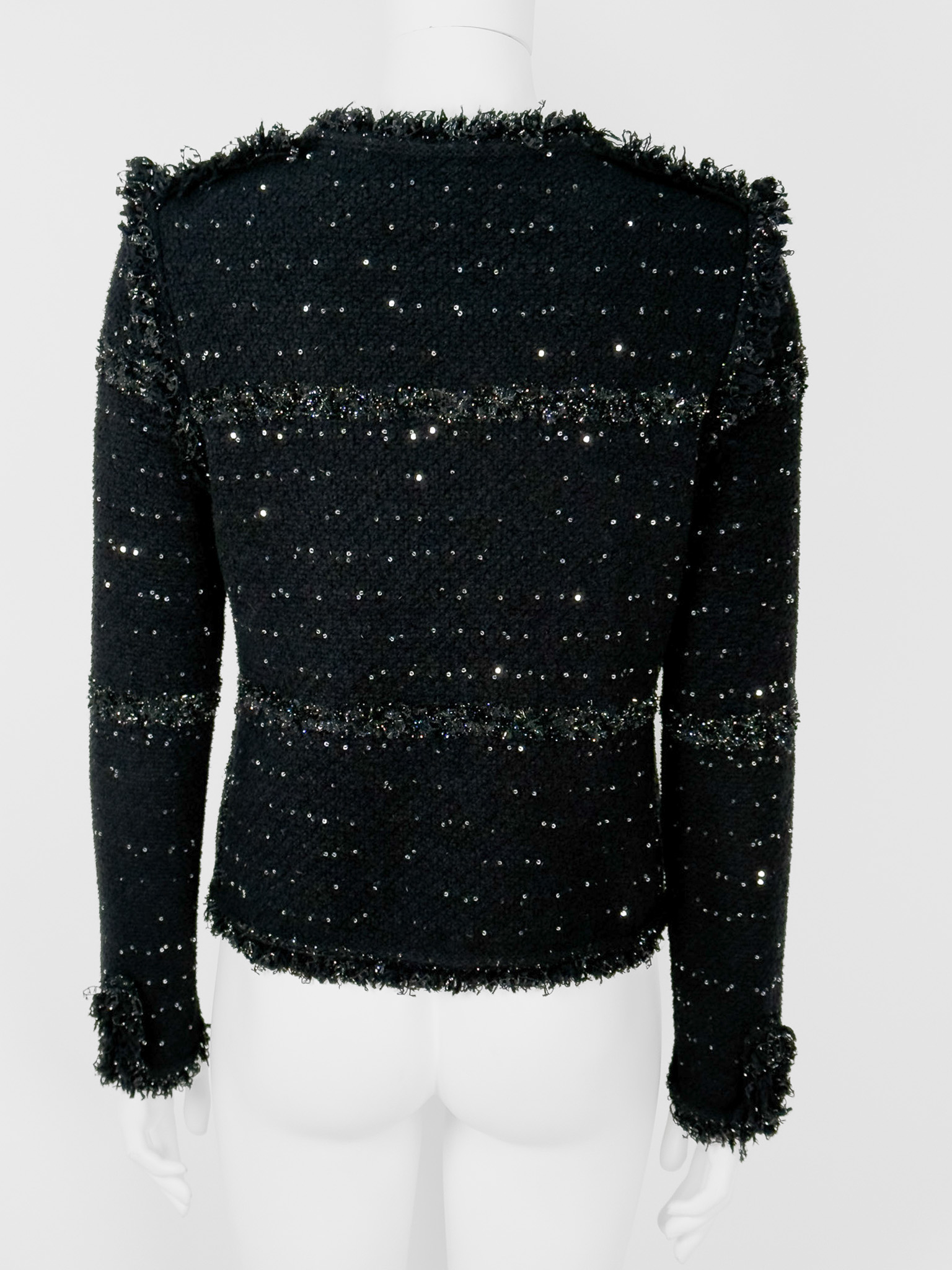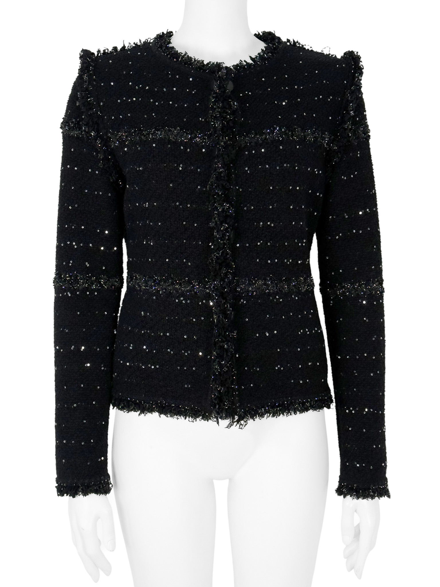 "Czarny żakiet ozdobiony błyszczącą srebrną nitką, delikatnymi frędzlami oraz cekinami, zaokrąglony dekolt, zapinany na guziki wykończone łańcuchem, prosty pudełkowy krój. Stan bardzo dobry. Brak metki z rozmiarem oraz składem. Rozmiarowo wypada jak S. Wymiary: szerokość mierzona od pachy do pachy 49cm, długość całkowita 56cm."