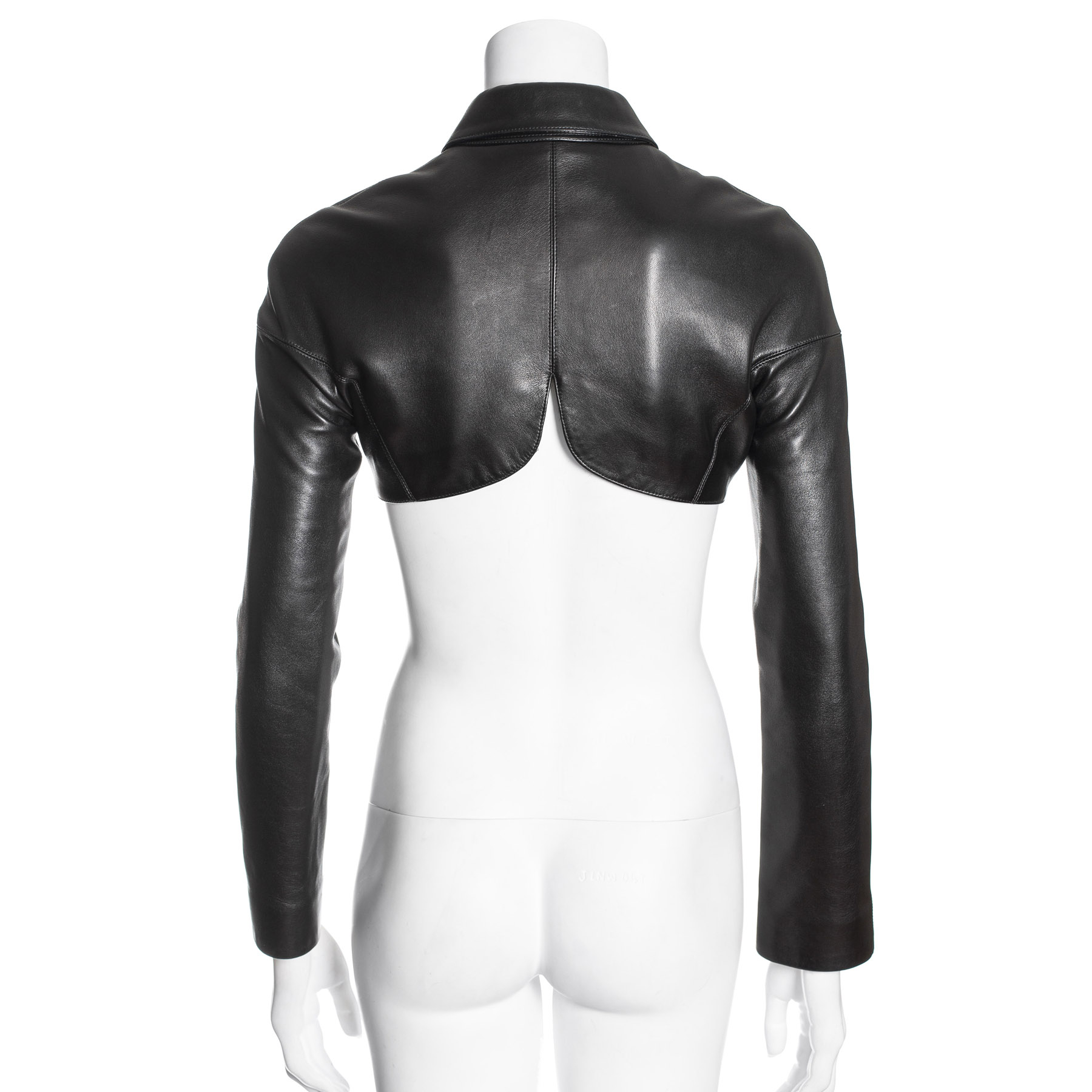 "Mini skórzana kurteczka, bolerko z wycięciem na plecach, zapinana na suwak, z kołnierzykiem, rozmiar 38. Stan idealny."