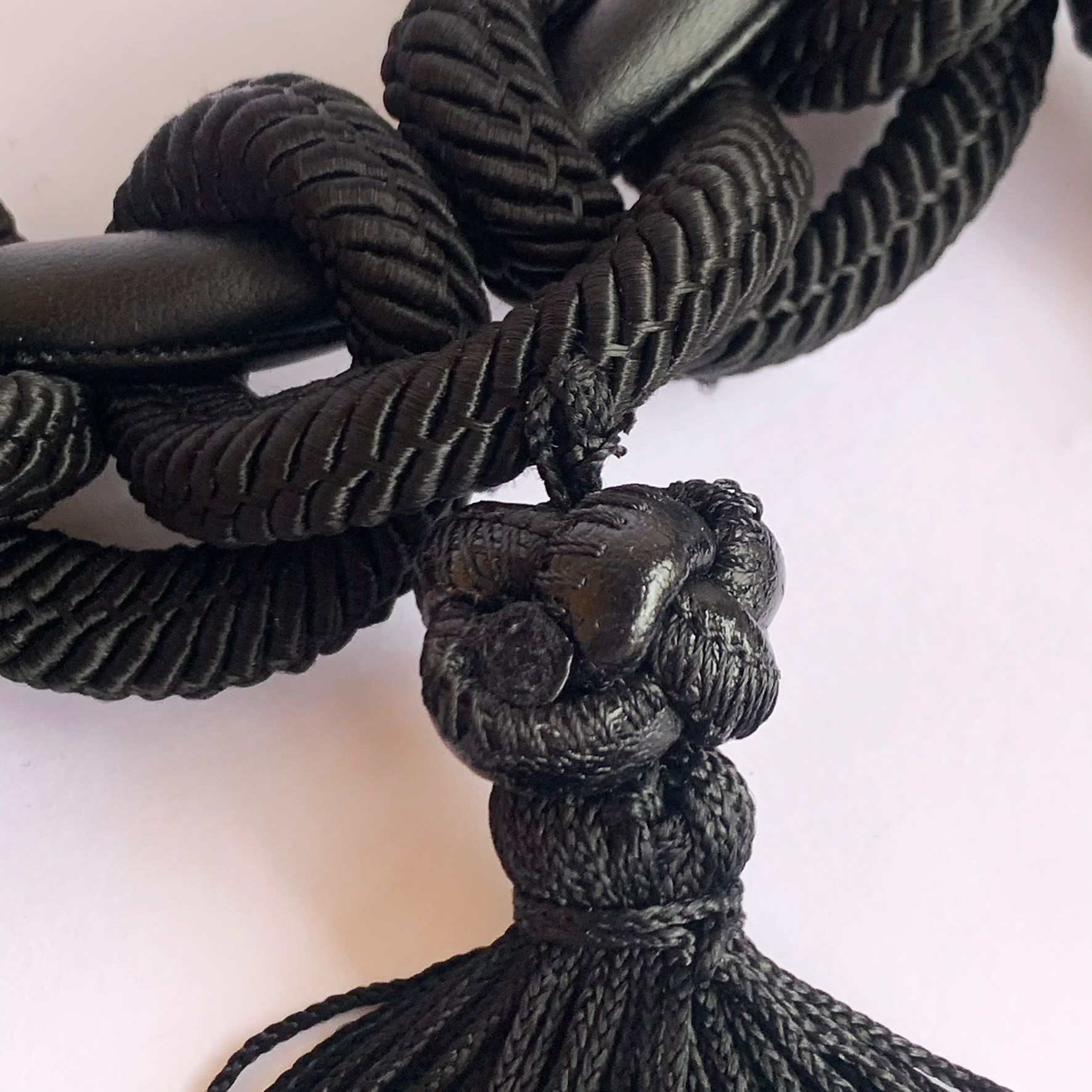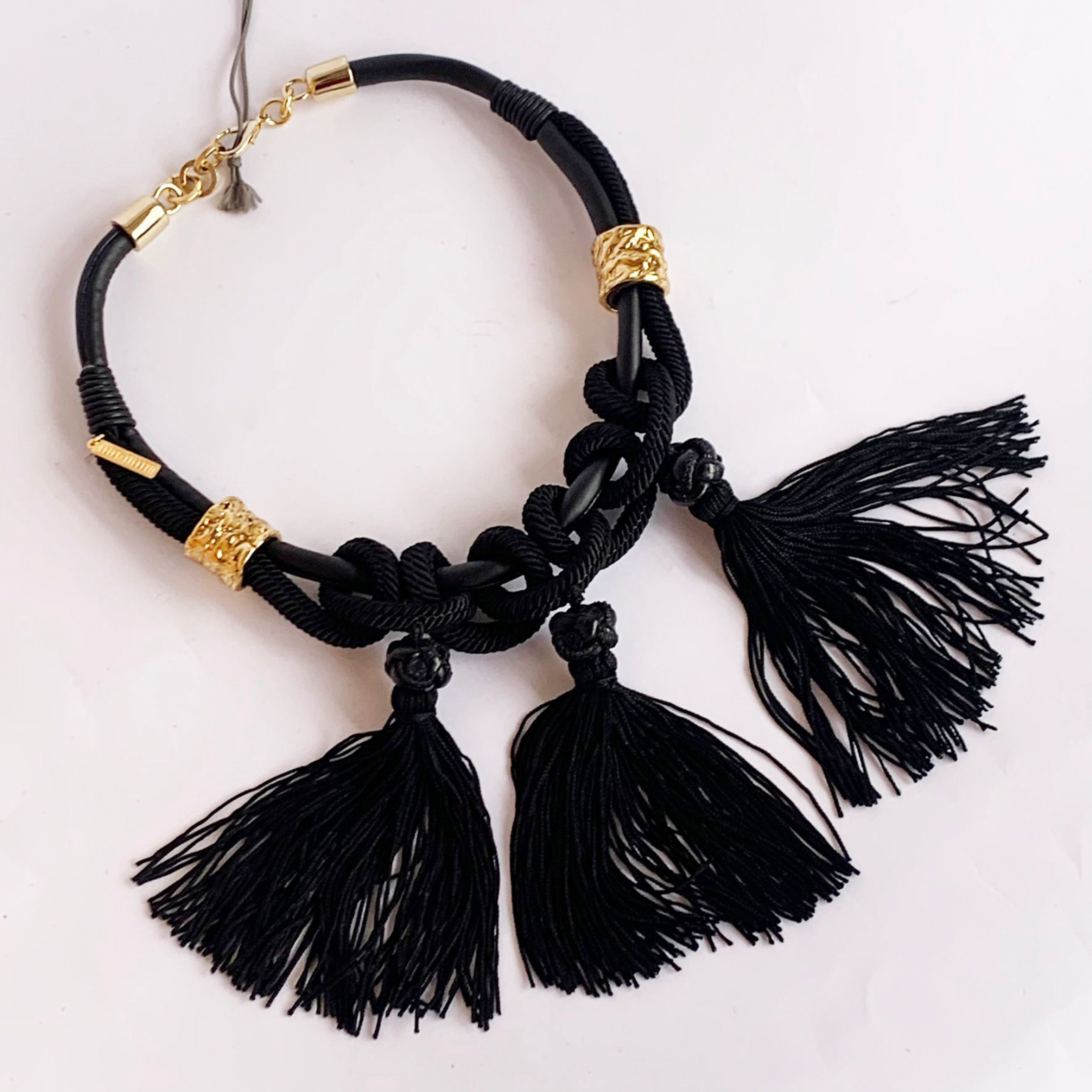 "ALBERTA FERRETTI - nowy naszyjnik w oryginalnym opakowaniu, jeden rozmiar, kori: czarny i złoty, zamknięcie na karabińczyk, średnica: 17 cm, długość frędzli: 11 cm."