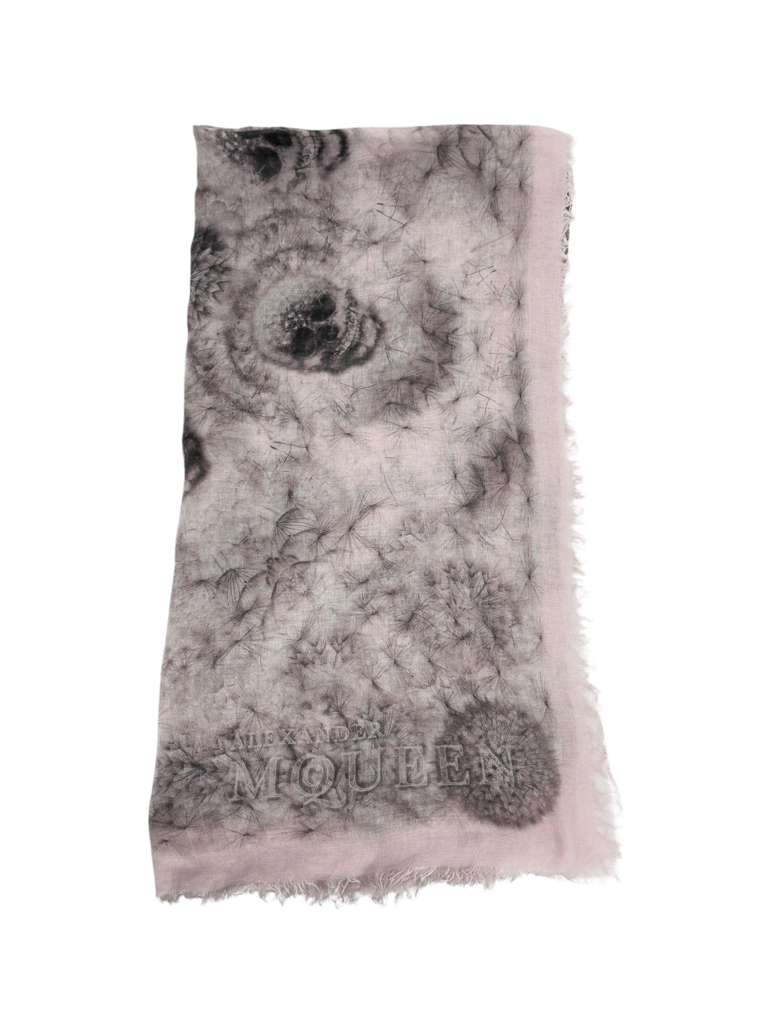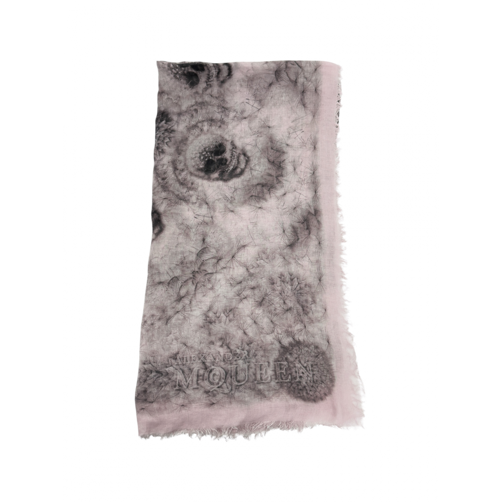 "Apaszka w kolorze brudnego różu ozdobiona grafiką czaszek oraz dmuchawców z dużym logo marki, kwadratowy kształt, delikatnie transparentna, wykończona krótkimi frędzlami. Brak metki ze składem. Stan dobry, posiada delikatne zaciągnięcia. Wymiary: 132cm x 132cm."