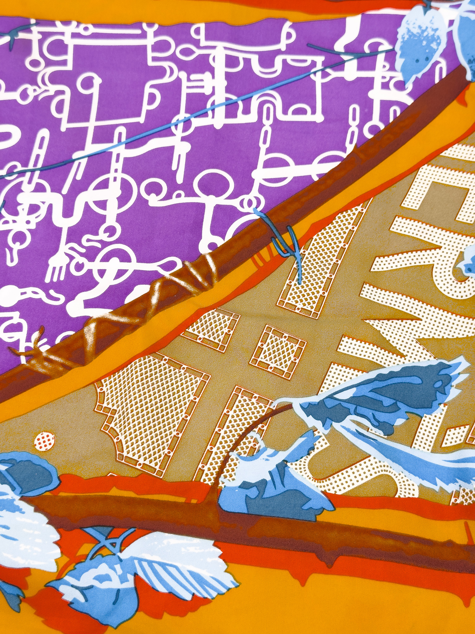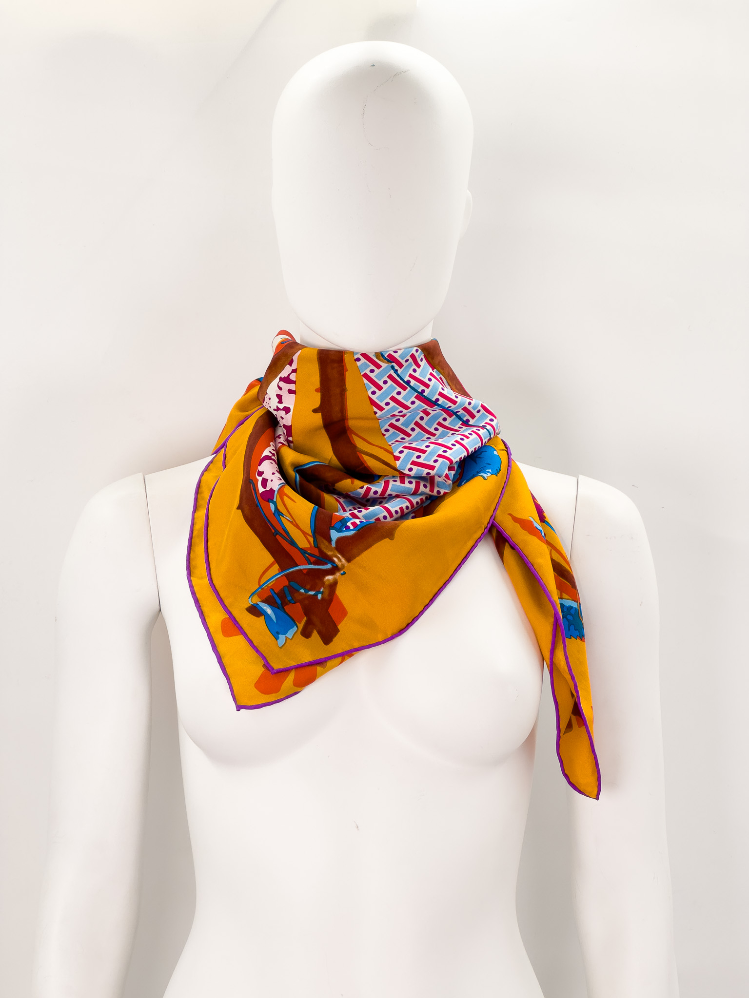 "Model Le Robinson. Wielobarwna jedwabna apaszka ozdobiona wzorami oraz dużym logo marki, fioletowa wąska lamówka, kwadratowy kształt. Skład:100% jedwab. Wymiary: 86cm x 86cm."