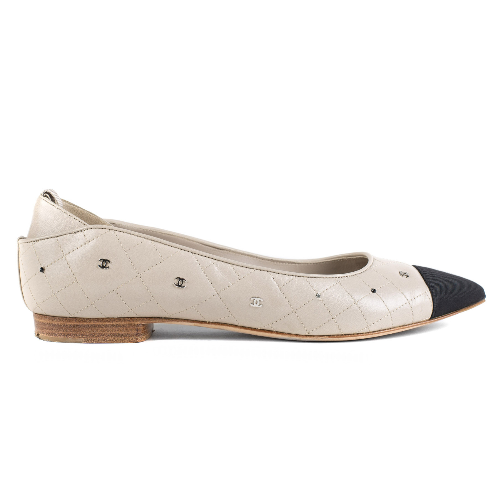 "Beżowe baleriny Chanel z czarnym czubkiem. Stan bardzo dobry - ubrane kilka razy. Srebrne znaczki, rozmiar 37,5."