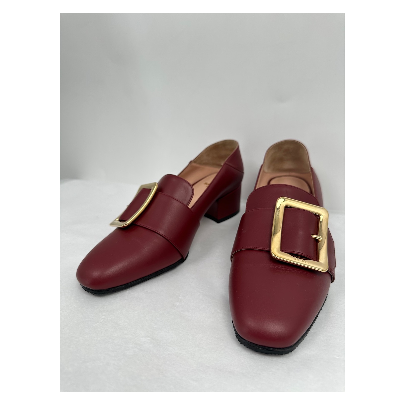 "bordowe skórzane półbuty ze złotą klamrą na przodzie, niski obcas słupkowy, zelówka, stan dobry, widoczne zarysowania na skórze. Rozmiar 36,5."