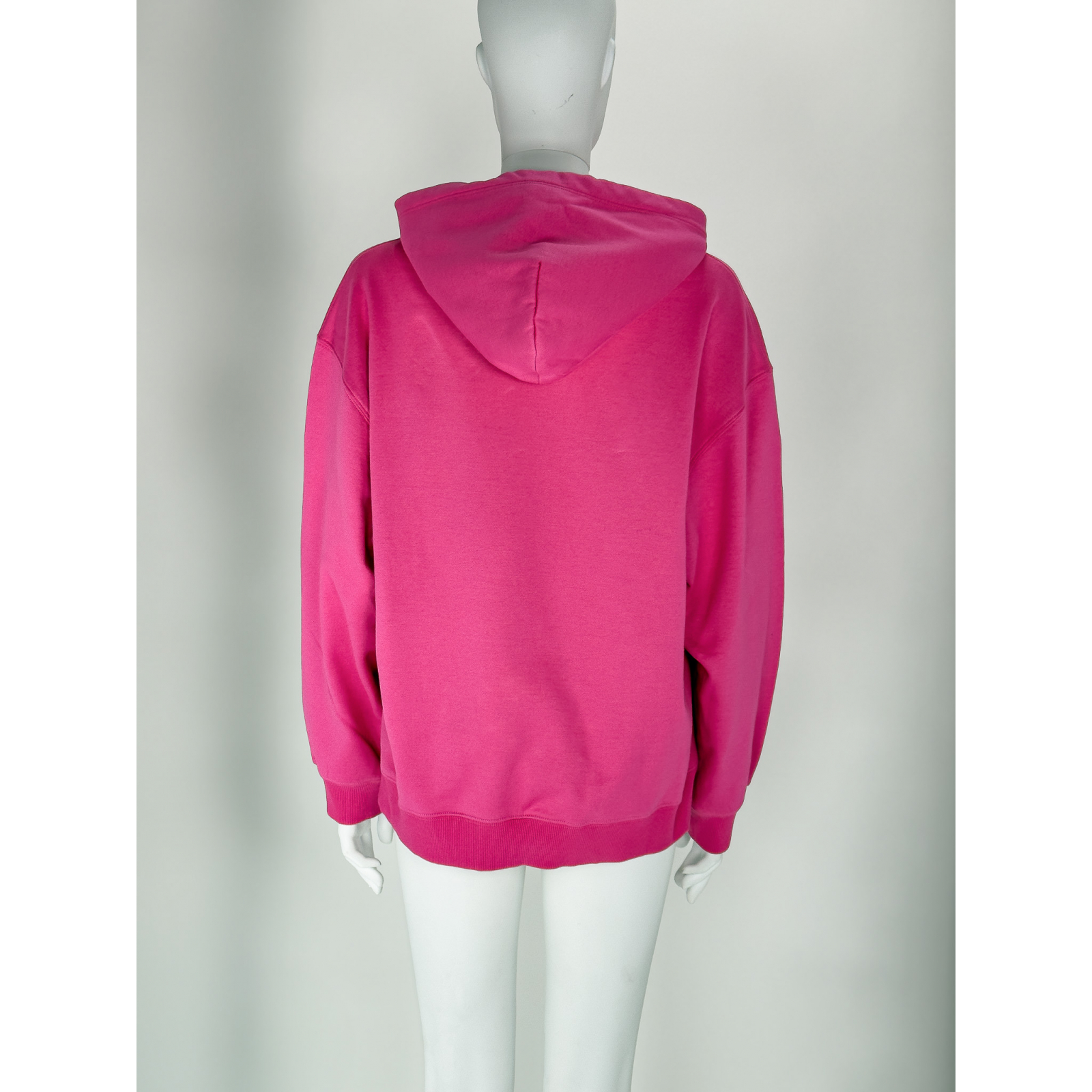 "Bawełniana bluza z kapturem w kolorze magenta, regulowany sznurkami kaptur, delikatne logo marki w centralnej części, duża kieszeń, prosty krój, mankiety oraz dół wykończone prążkowanym ściągaczem, w zestawie z metką. Rozmiar z metki M. Skład: 94% bawełna, 6% poliamid. Wymiary: szerokość mierzona od pachy do pachy 59cm, długość całkowita 65cm."