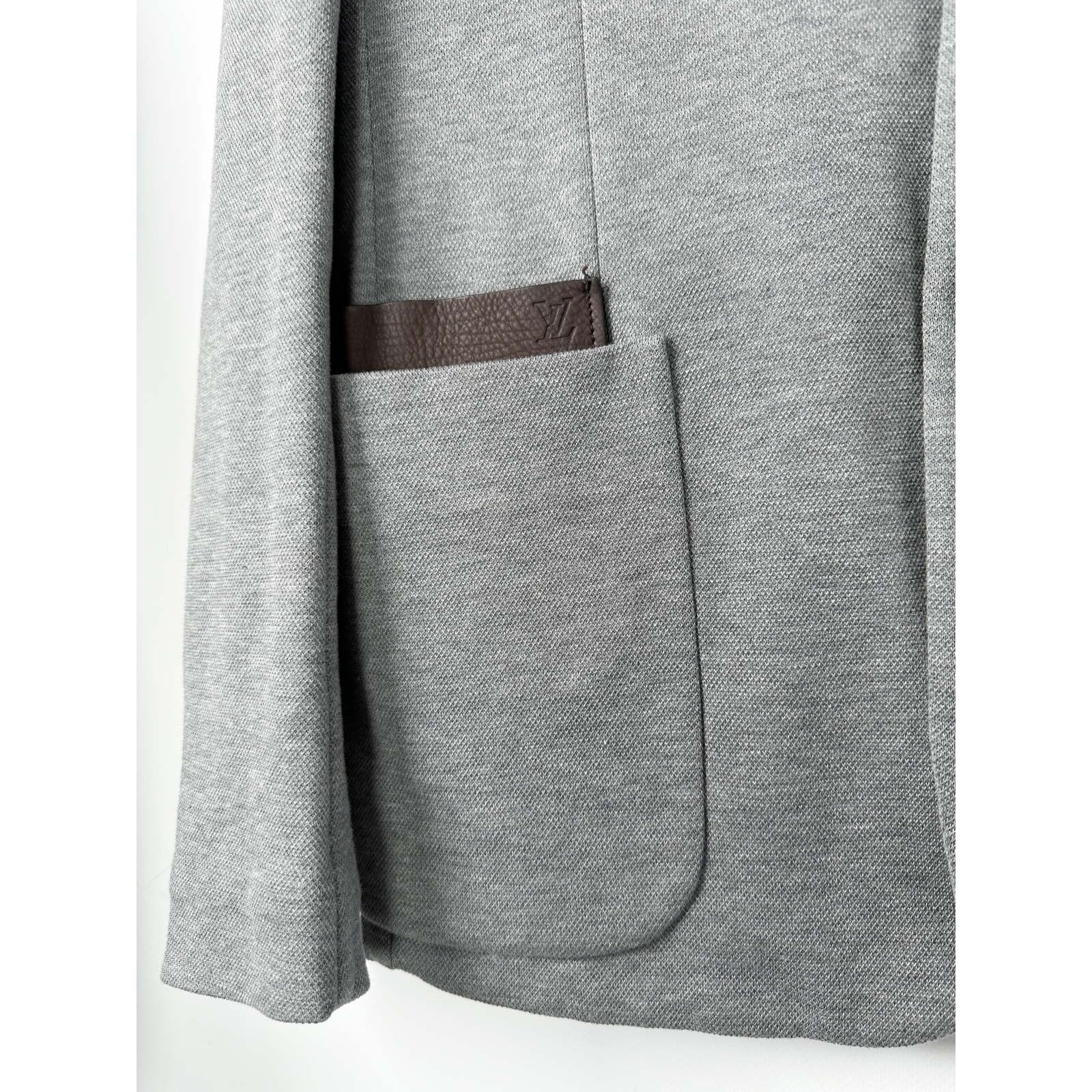 "Szara bawełniana marynarka, głęboki dekolt w szpic, zapinana na dwa czarne guziki, dwie kieszenie z przodu, w tym jedna ozdobiona brązową skórzaną wstawką z logo marki, podwijane rękawy zapinane na guzik, częściowa granatowa podszewka w szachownicę charakterystyczną dla marki w górnej części oraz na rękawach, rozporek. Rozmiar z metki IT 52. Skład: 96% bawełna, 3% poliamid, 1% elastan; podszewka: 87% kupro, 13% wiskoza. Wymiary: szerokość mierzona od pachy do pachy 54cm, długość całkowita 78cm."