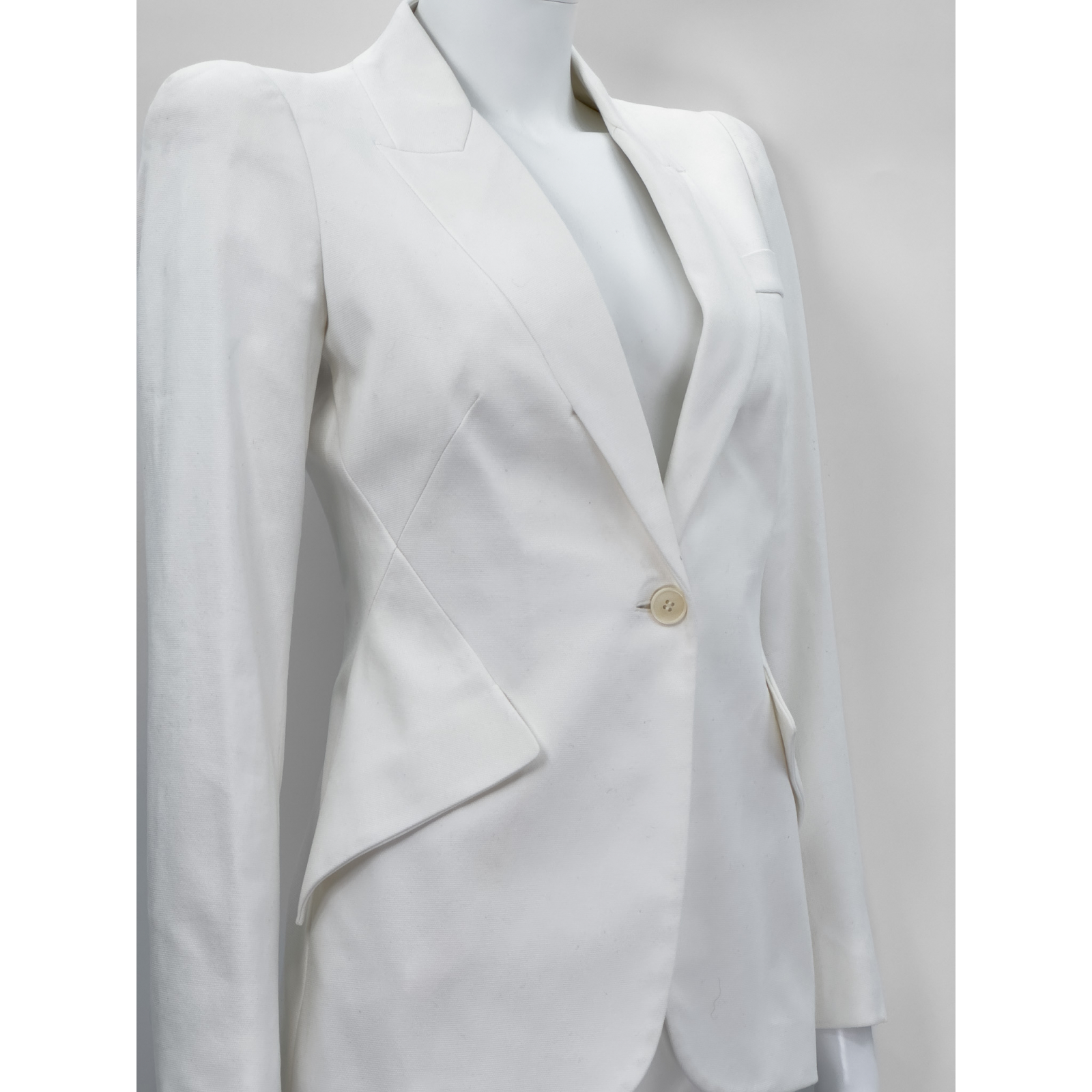 "Biała bawełniana marynarka ozdobiona przeszyciami, krótka, taliowana, szpiczasty kołnierz, zapinana na jeden kremowy guzik, dwie zaszyte kieszenie z klapami po bokach ułożone na skos, poduszki na ramionach, guziki przy mankietach, dwa rozcięcia z tyłu. Rozmiar z metki IT 38. Skład: 97% bawełna, 3% elastan; podszewka: 100% cupro. Wymiary: szerokość mierzona od pachy do pachy 41cm, długość całkowita 66cm."