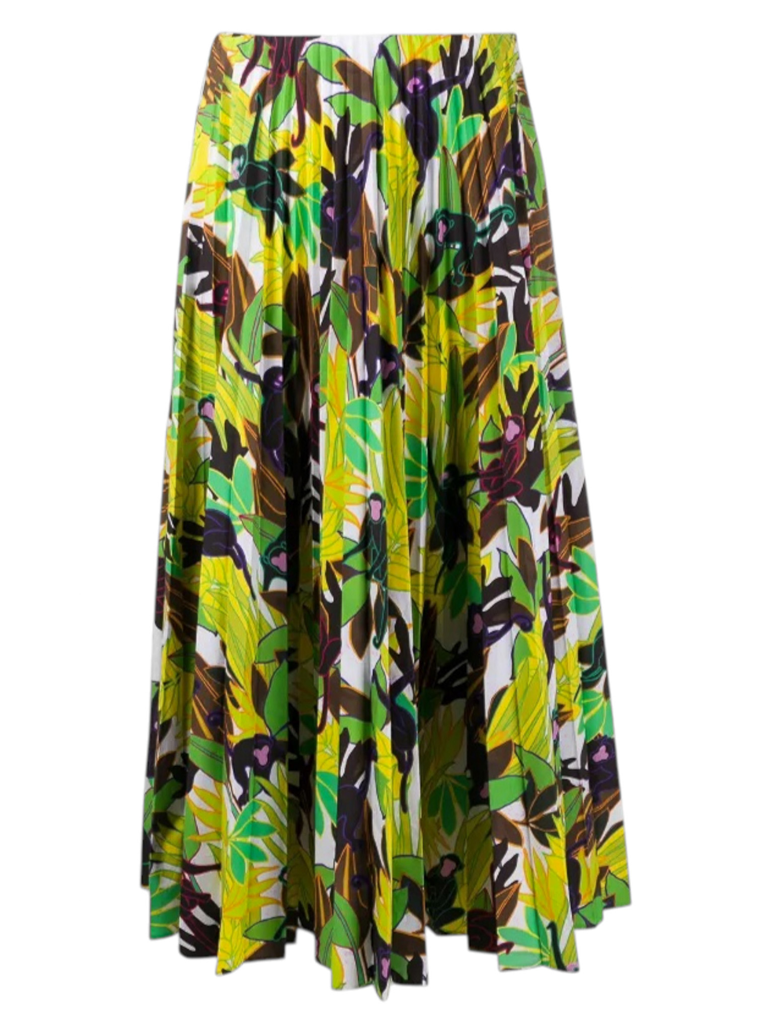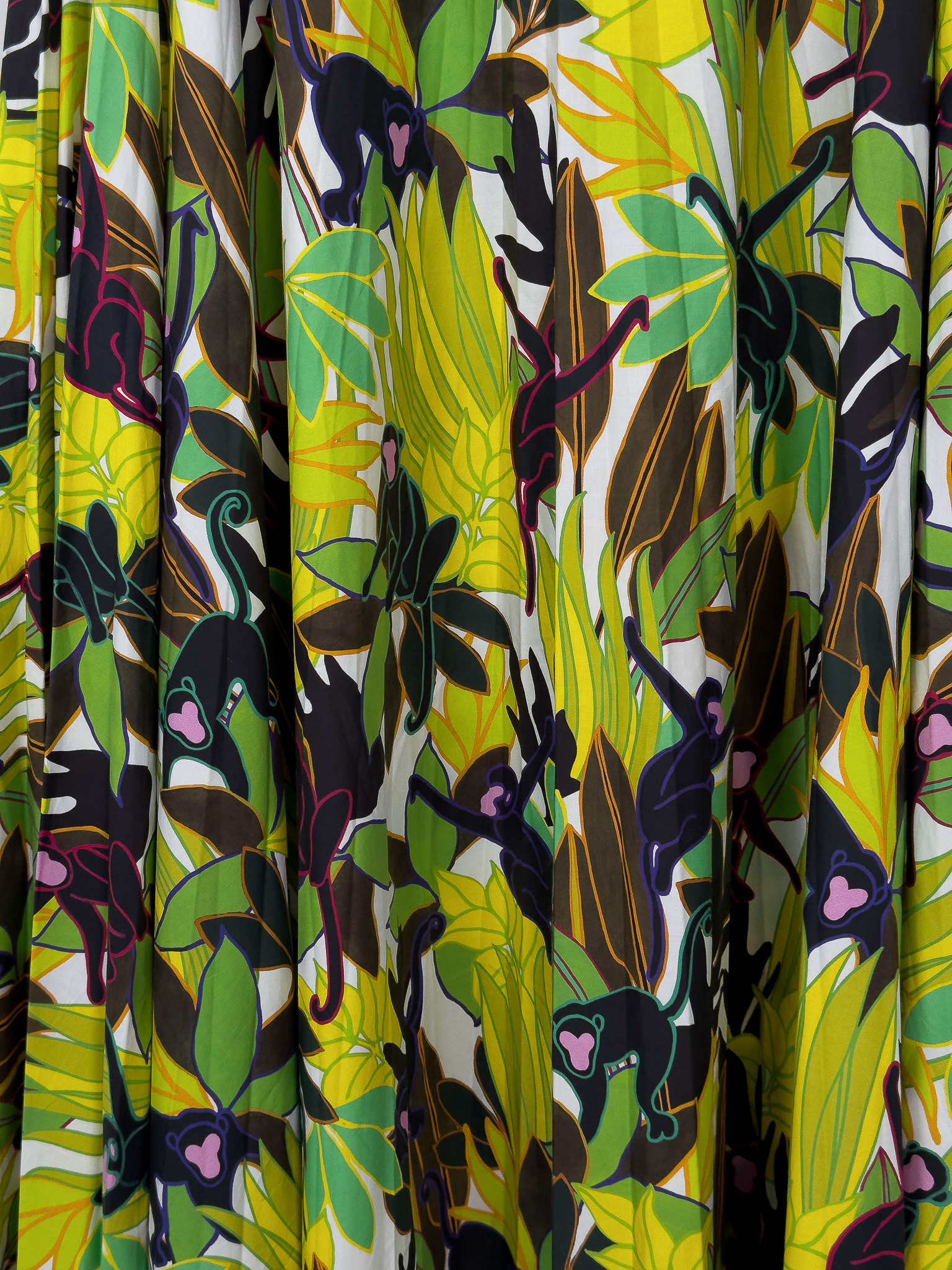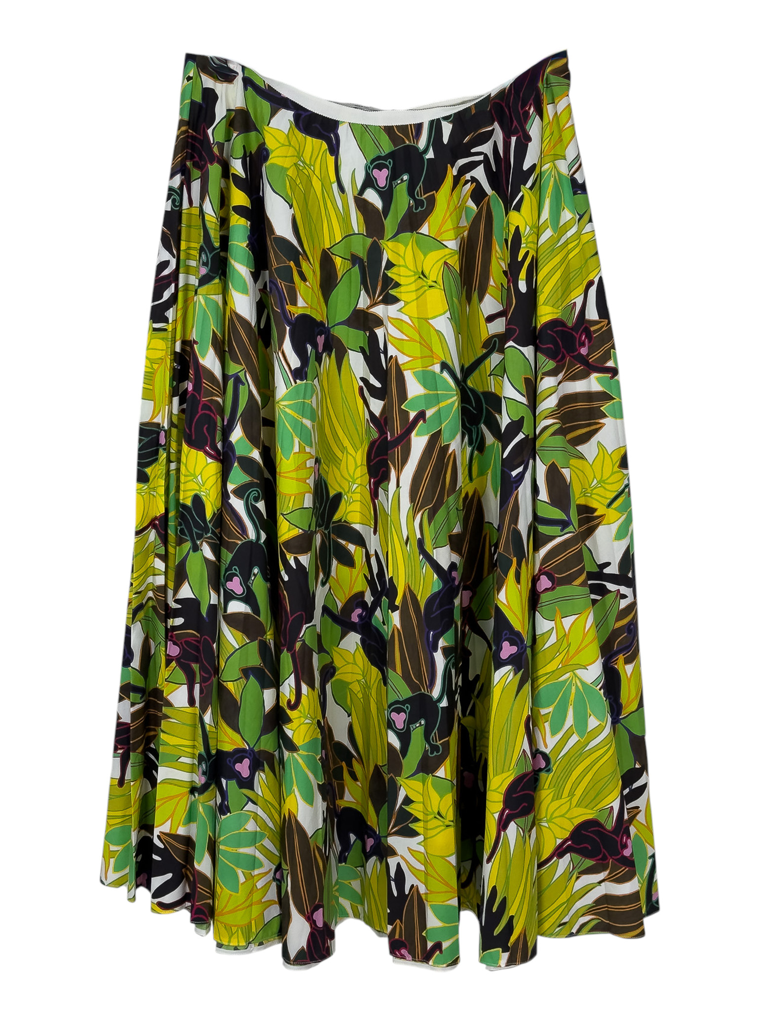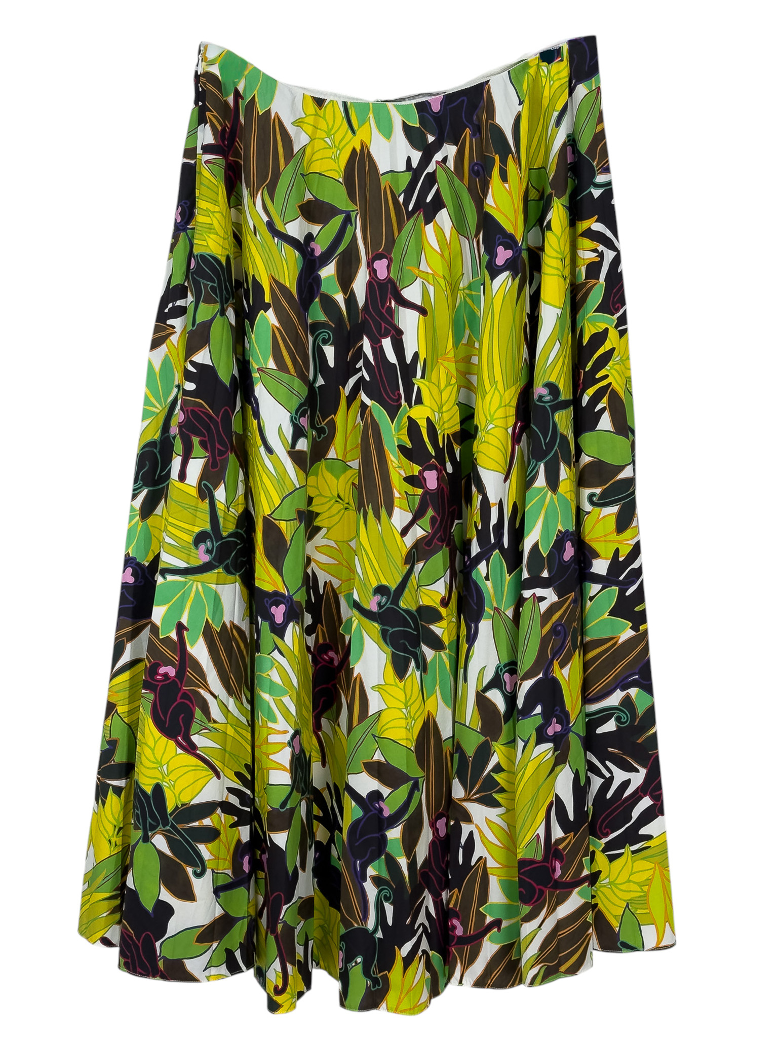 "Wielobarwna bawełniana spódnica w motyw małp i liści, długość maxi, rozkloszowany krój, zapinana na kryty suwak oraz haftkę w pasie. Stan bardzo dobry. Rozmiar z metki IT 46. Skład: 100% bawełna. Wymiary: szerokość w pasie 41cm, długość całkowita 88cm."