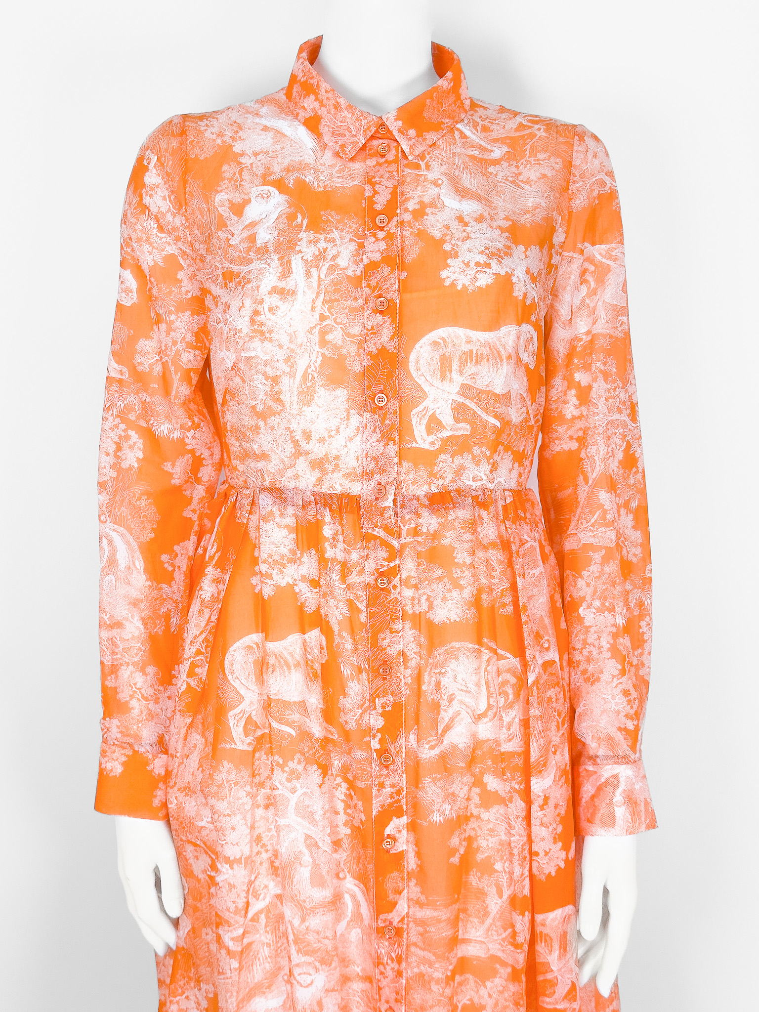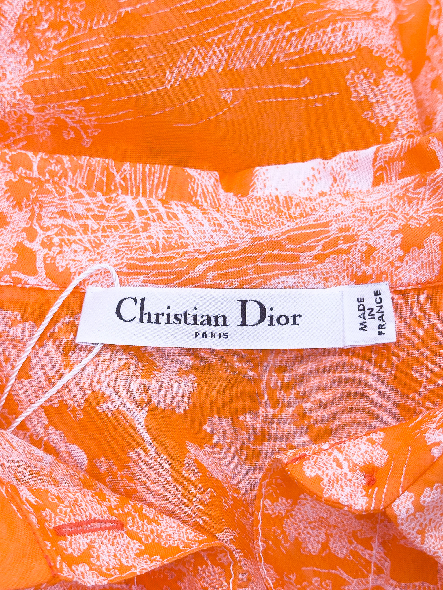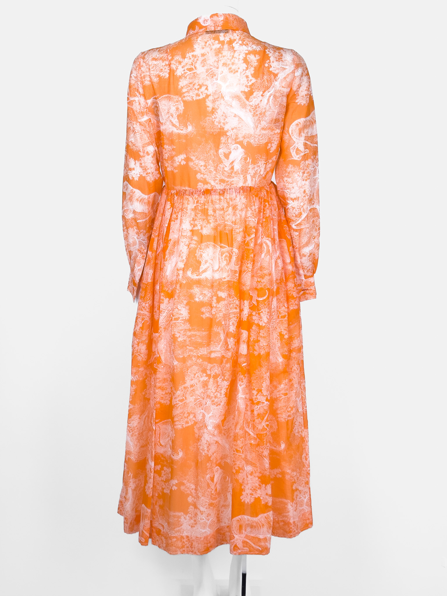 "Kolekcja: Dioriviera capsule 2022. Pomarańczowa bawełniana sukienka w charakterystyczny wzór dla marki, zapinana na guziki, długi rękaw, w zestawie z białą halką na ramiączkach. Stan bardzo dobry. Rozmiar z metki IT44. Skład: 100% bawełna. Wymiary: szerokość mierzona od pachy do pachy 49cm, długość całkowita 126cm."