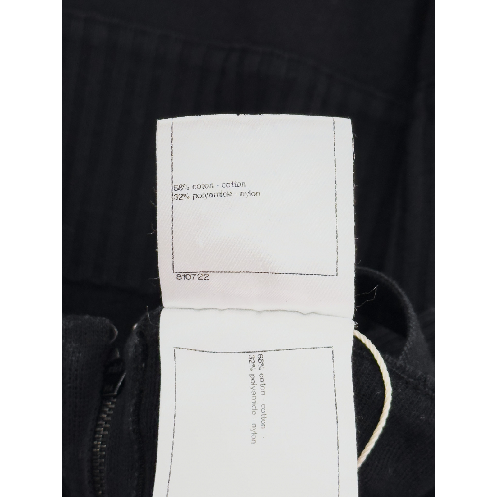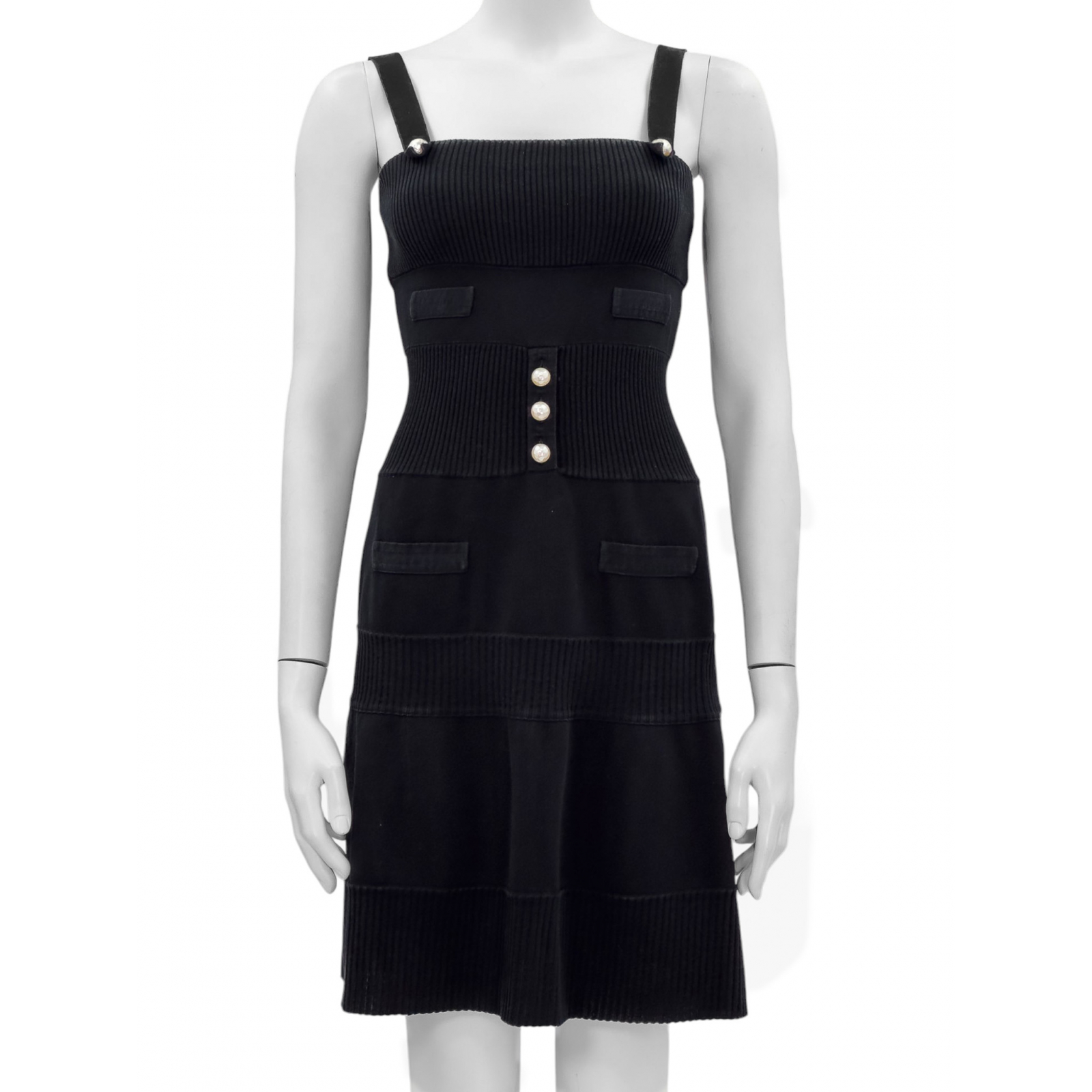 "Czarna bawełniana sukienka na ramiączkach, ozdobiona dużymi okrągłymi guzikami z masy perłowej z białym logo marki, wykonana z łączonych materiałów, częściowo prążkowana, taliowana, długość przed kolano, prosty dekolt, dopasowany krój, cztery imitacje kieszeni, zapinana w tylnej części na dwa czarne suwaki z logo oraz haftkę. Rozmiar z metki IT 36. Skład: 68% bawełna, 32% poliamid. Wymiary: szerokość mierzona od pachy do pachy 32cm, długość całkowita 92cm."