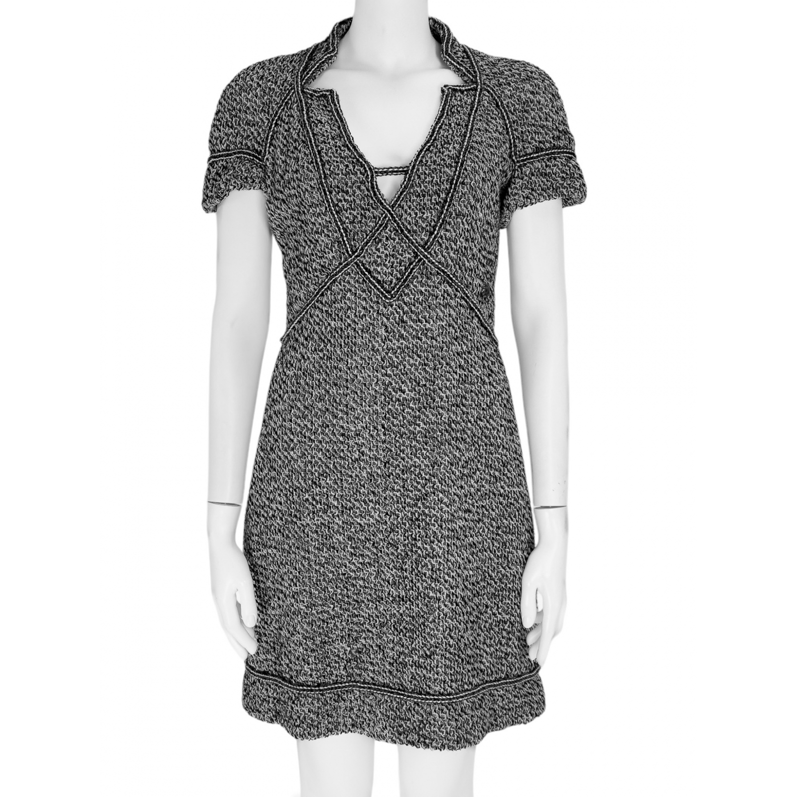 "Czarno-biała bawełniana sukienka ozdobiona plecionym wzorem, krótki rękaw, głęboki dekolt w serek wykończony trójkątnym wycięciem, taliowana, delikatnie rozkloszowany dół, zapinana w tylnej części na kryty suwak oraz trzy haftki, logo marki w okolicy talii, logowana podszewka o motywie kwiatowym. Rozmiar z metki FR 40. Skład: 90% bawełna, 10% poliester; podszewka: 61% bawełna, 39% jedwab. Wymiary: szerokość mierzona od pachy do pachy 48cm, długość całkowita 91cm."