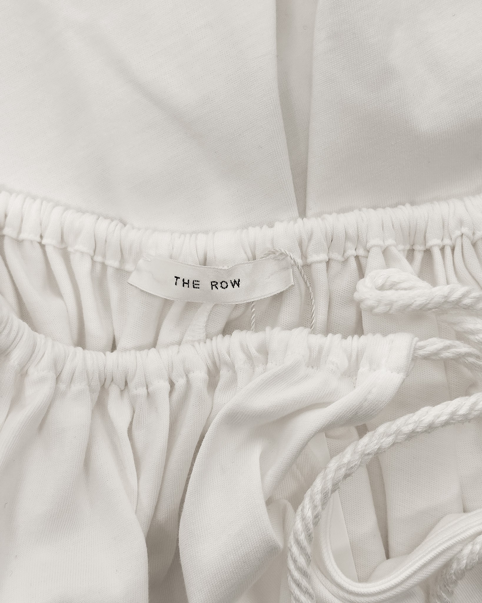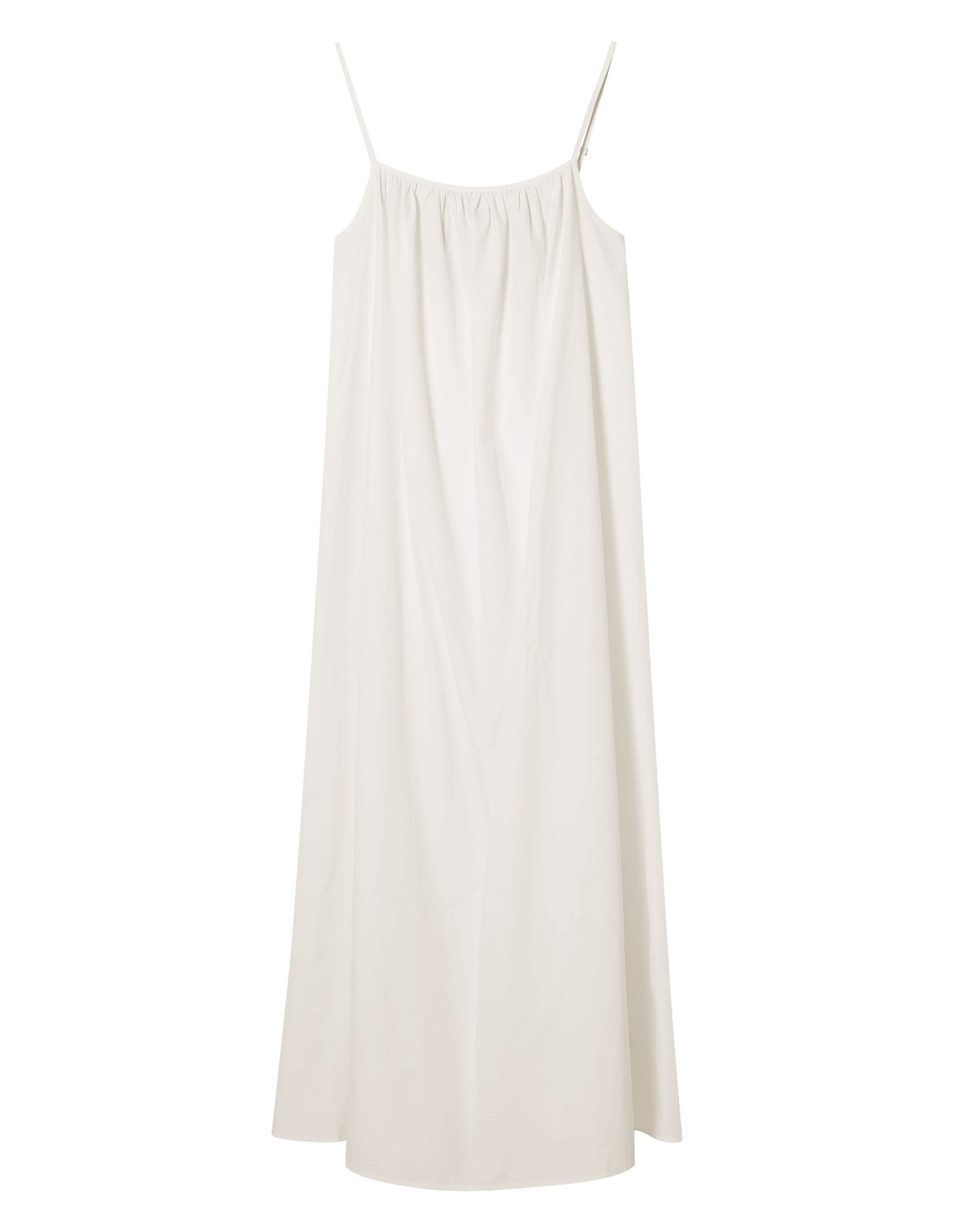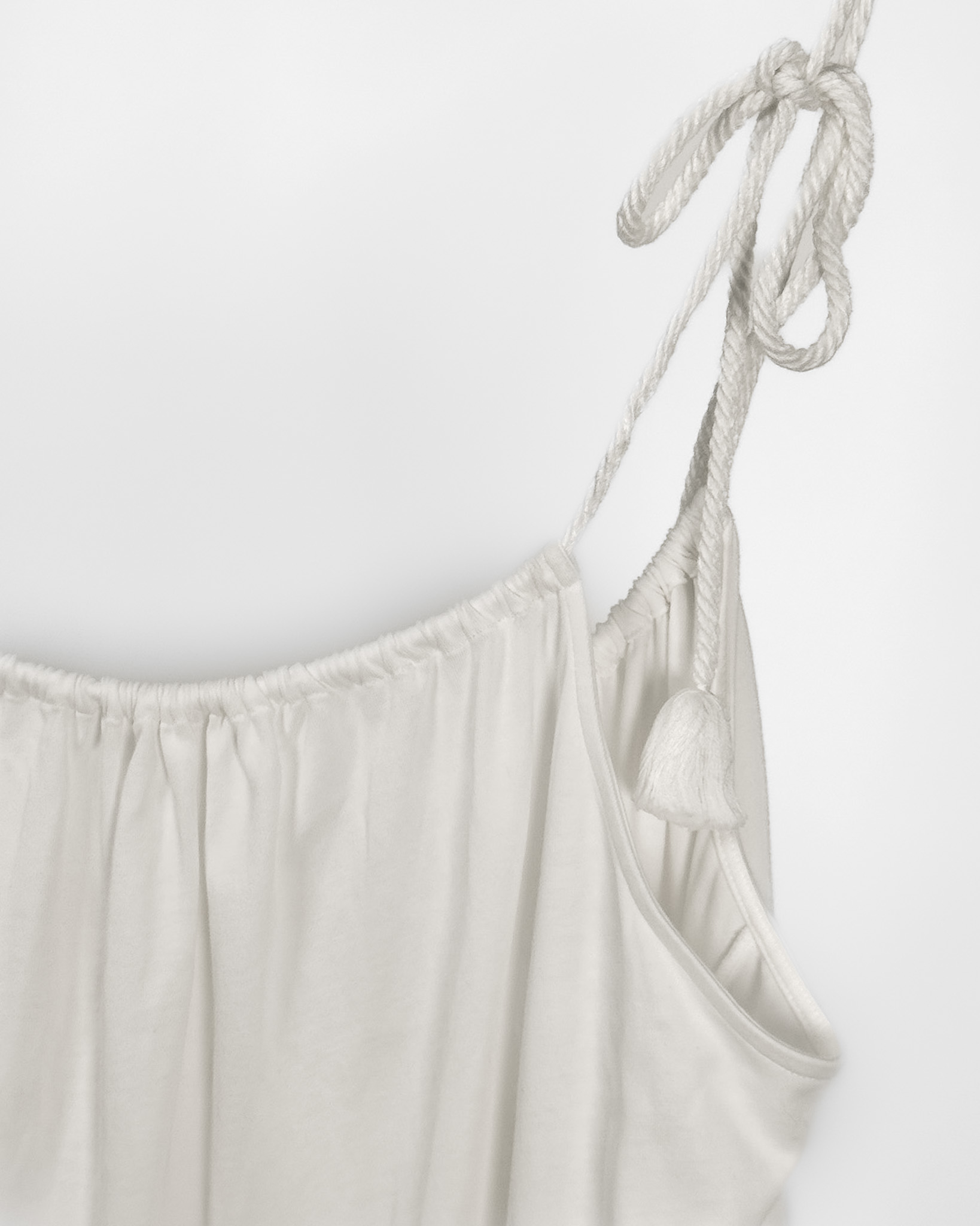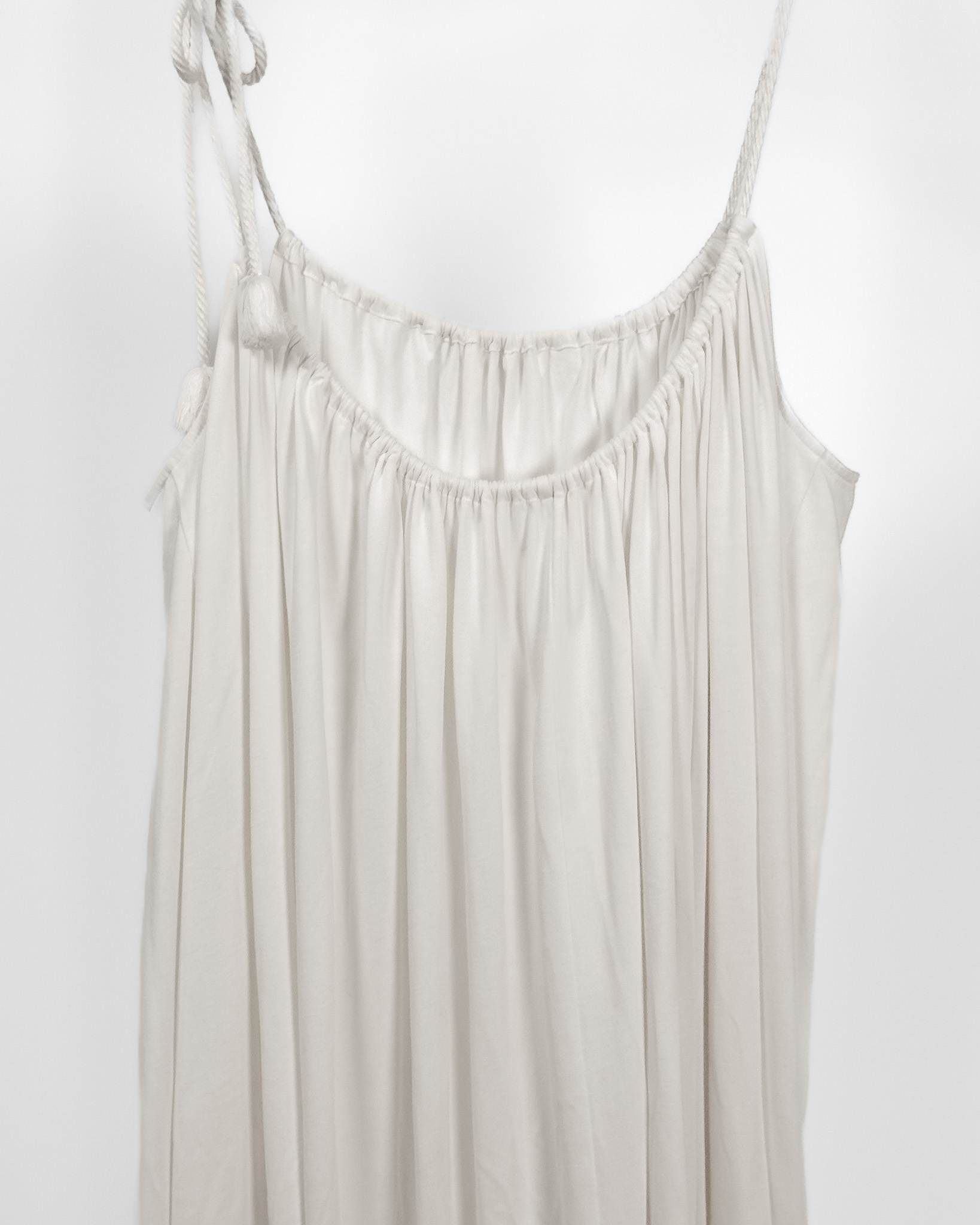 "Biała bawełniana sukienka na wiązanych ramiączkach w formie sznurka, długość maxi, marszczona przy dekolcie. Stan bardzo dobry. Rozmiar z metki XL. Skład: 100% bawełna. Wymiary: szerokość mierzona od pachy do pachy 70cm, długość całkowita 150cm."