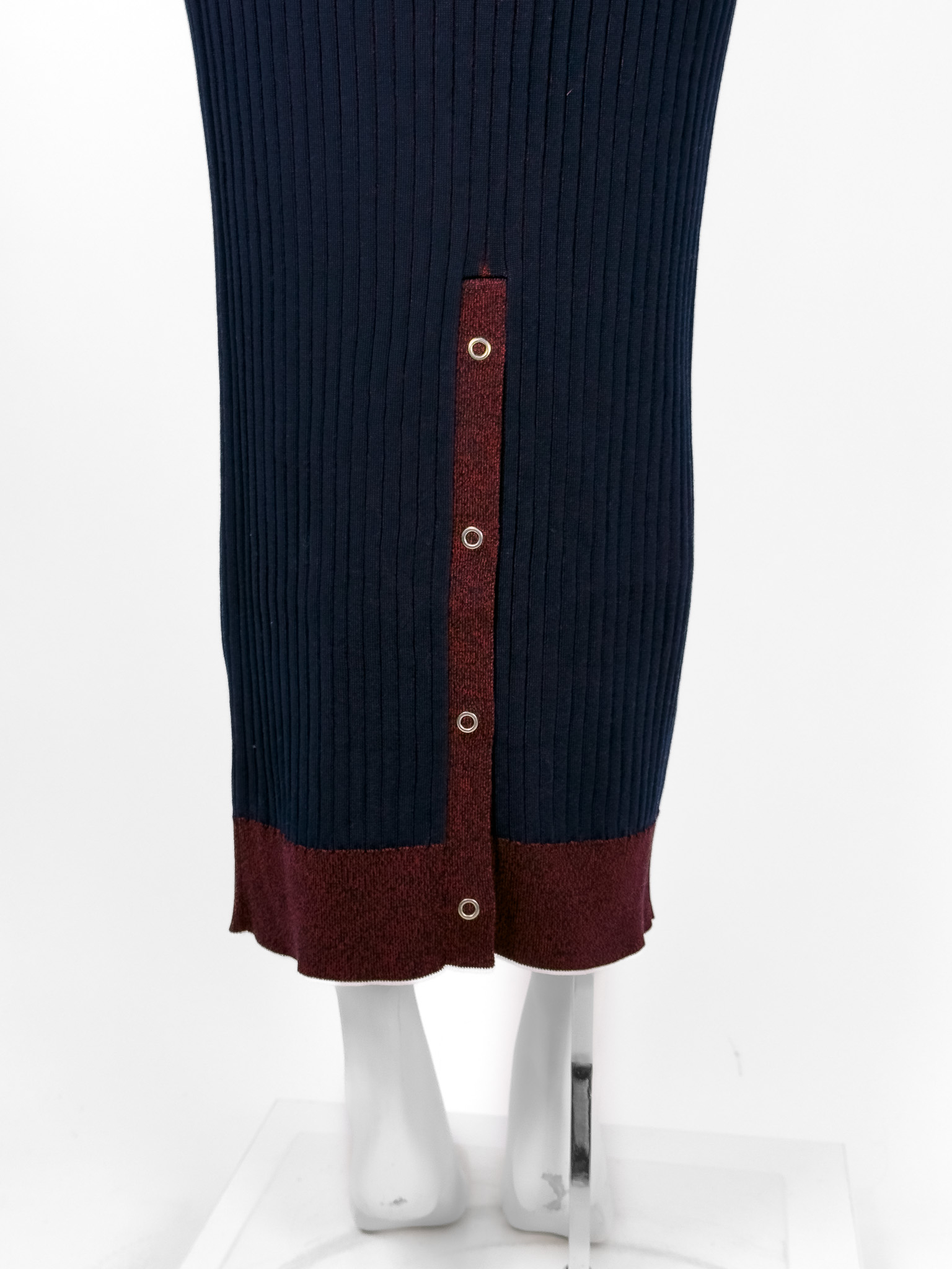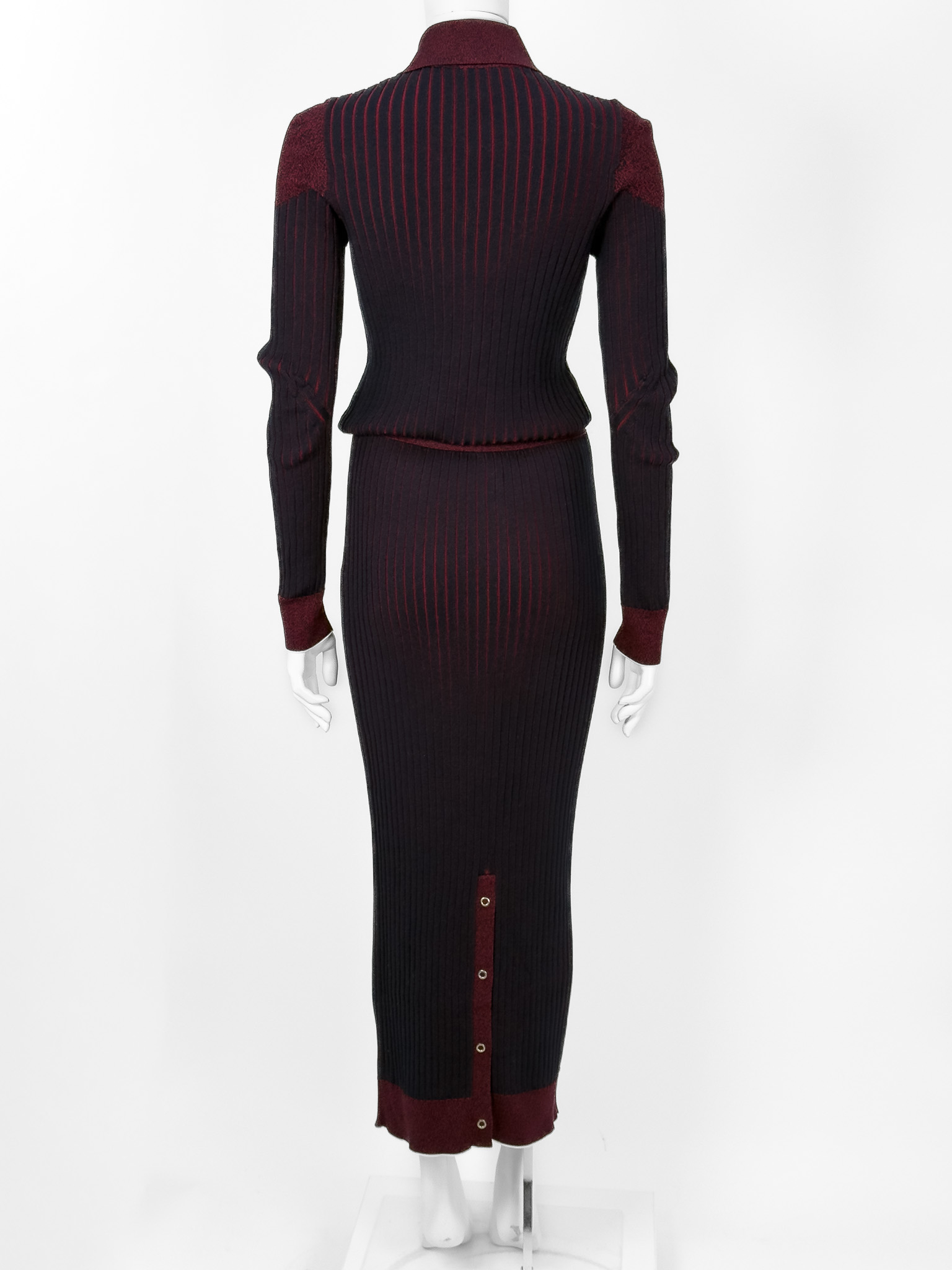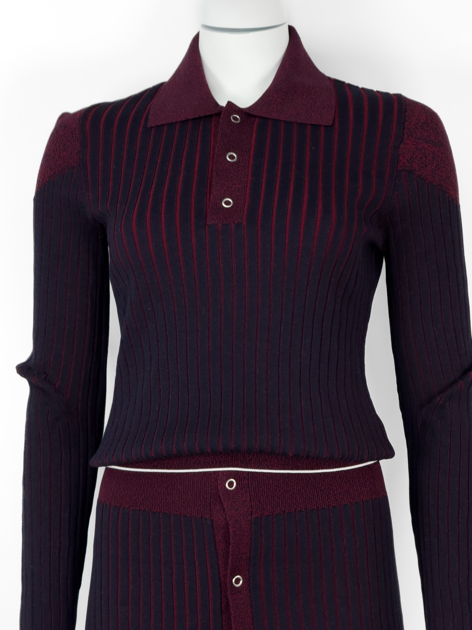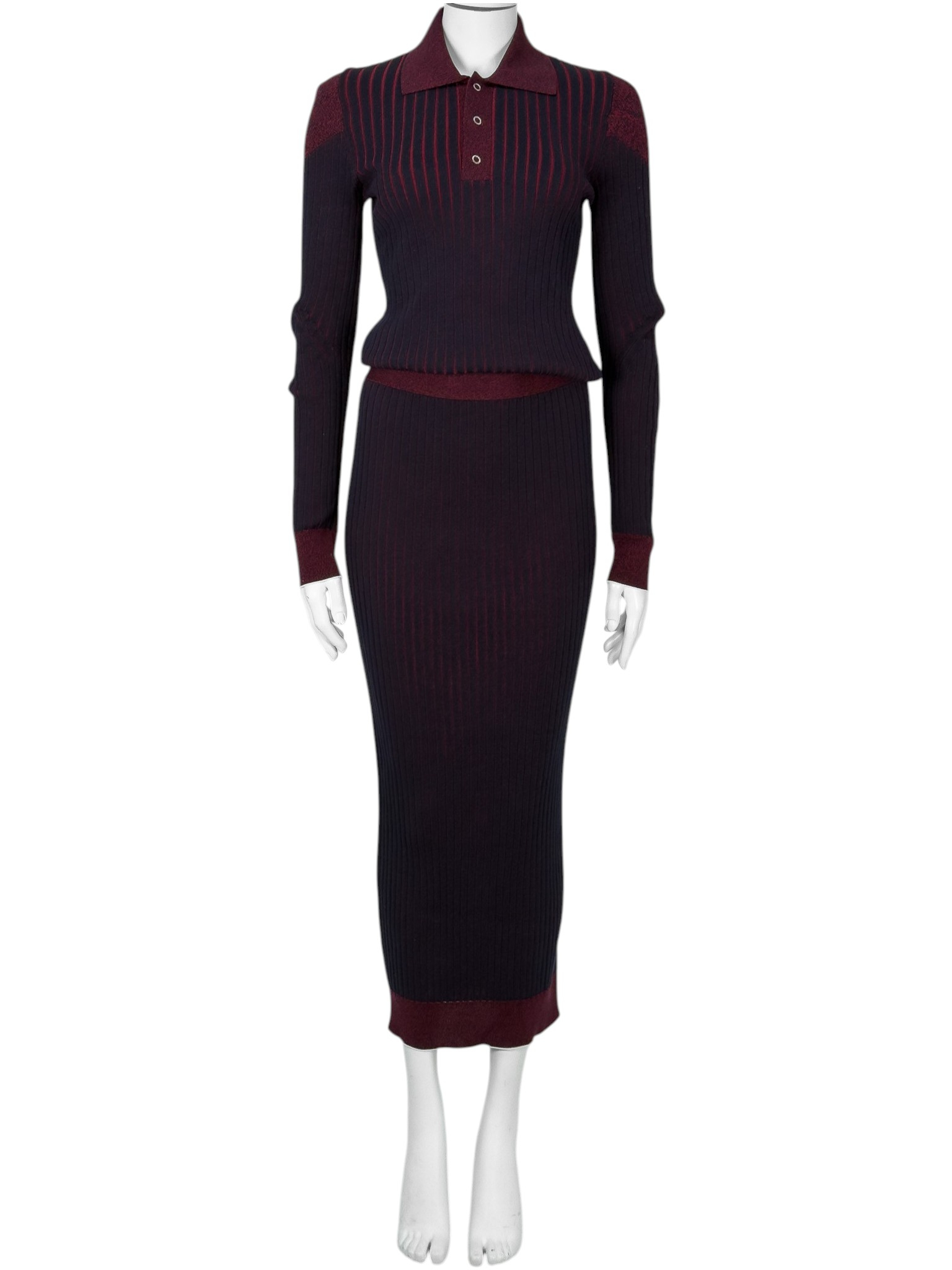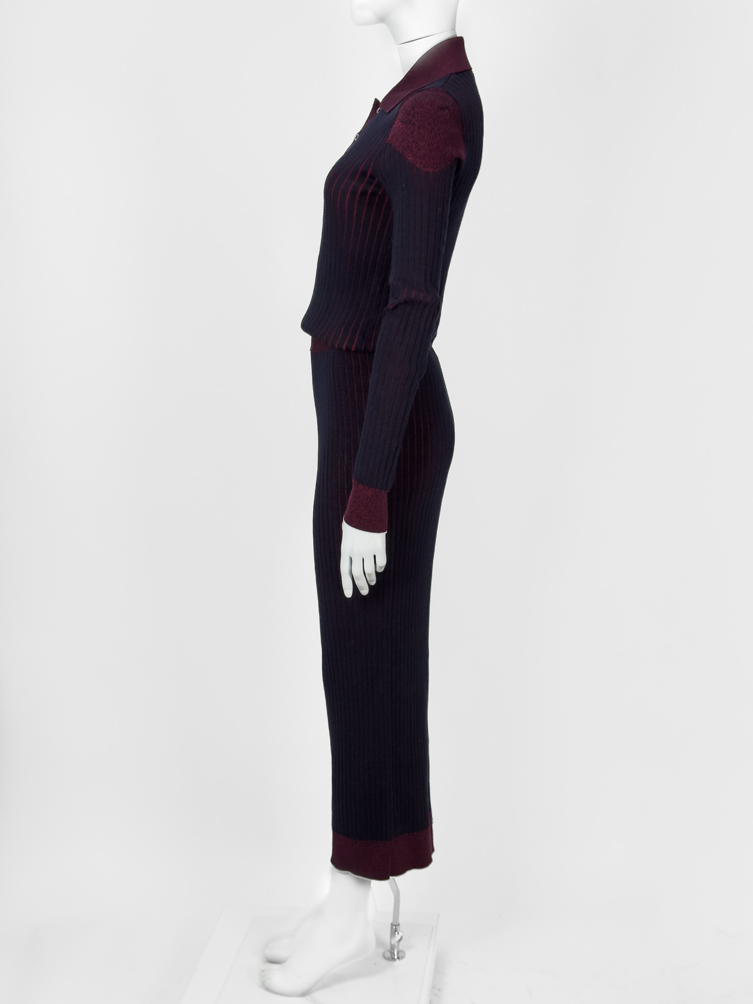 "Bawełniany granatowo-bordowy komplet w prążek: bluzka+ spódnica; Bluzka z długim rękawem, zapinana na srebrne zatrzaski w okolicy dekoltu, kołnierzyk, mankiety oraz dół wykończone wąską delikatną lamówką. Spódnica maxi, dopasowany krój, guma w pasie. Stan bardzo dobry. Rozmiar z metki S. Skład: 100% bawełna. Wymiary bluzki: szerokość mierzona od pachy do pachy 44cm, długość całkowita 53cm; wymiary spódnicy: szerokość w pasie 30cm, długość całkowita 93cm."