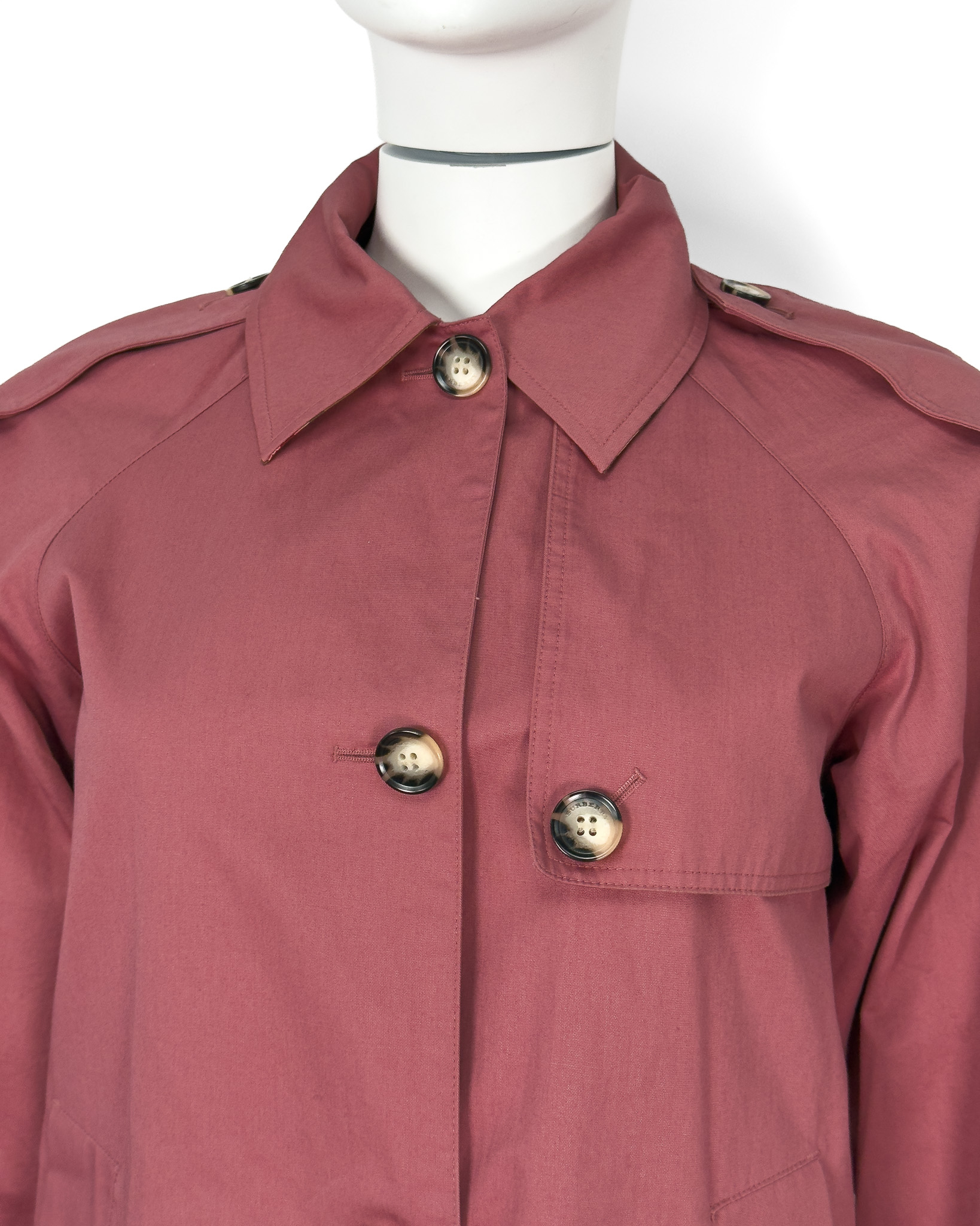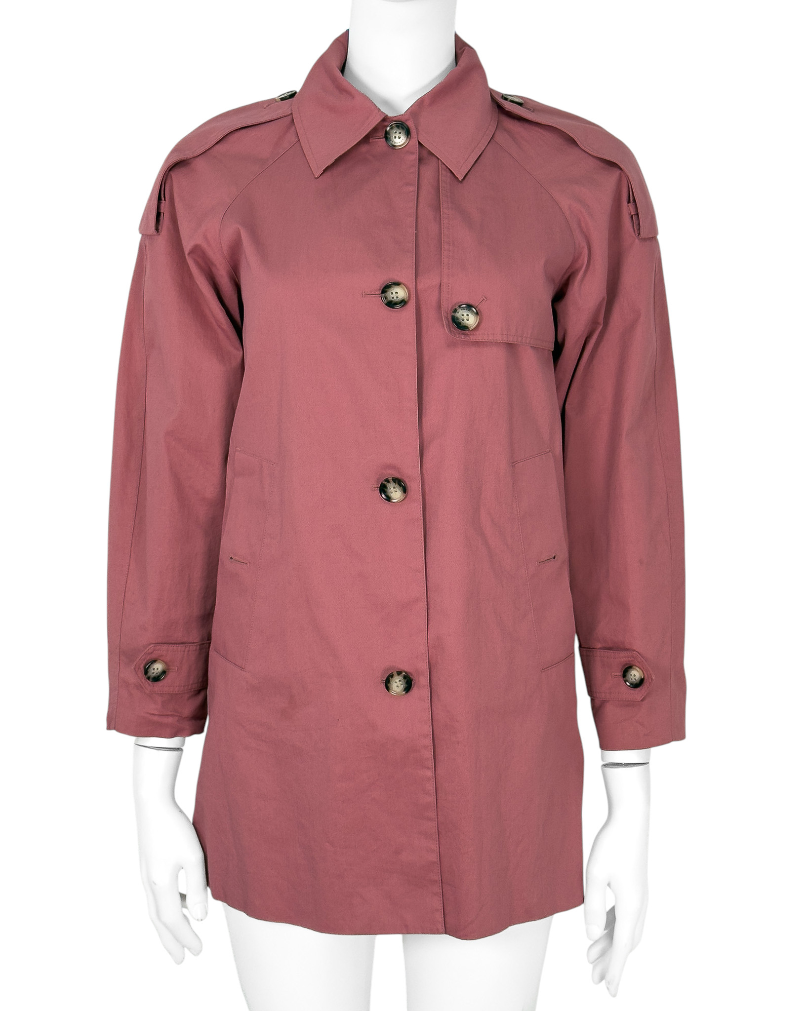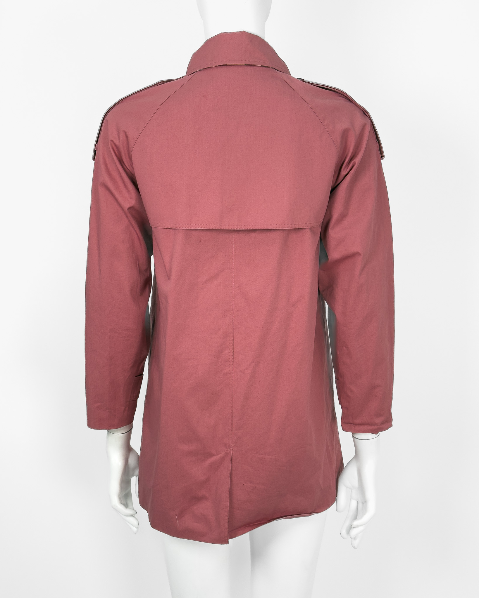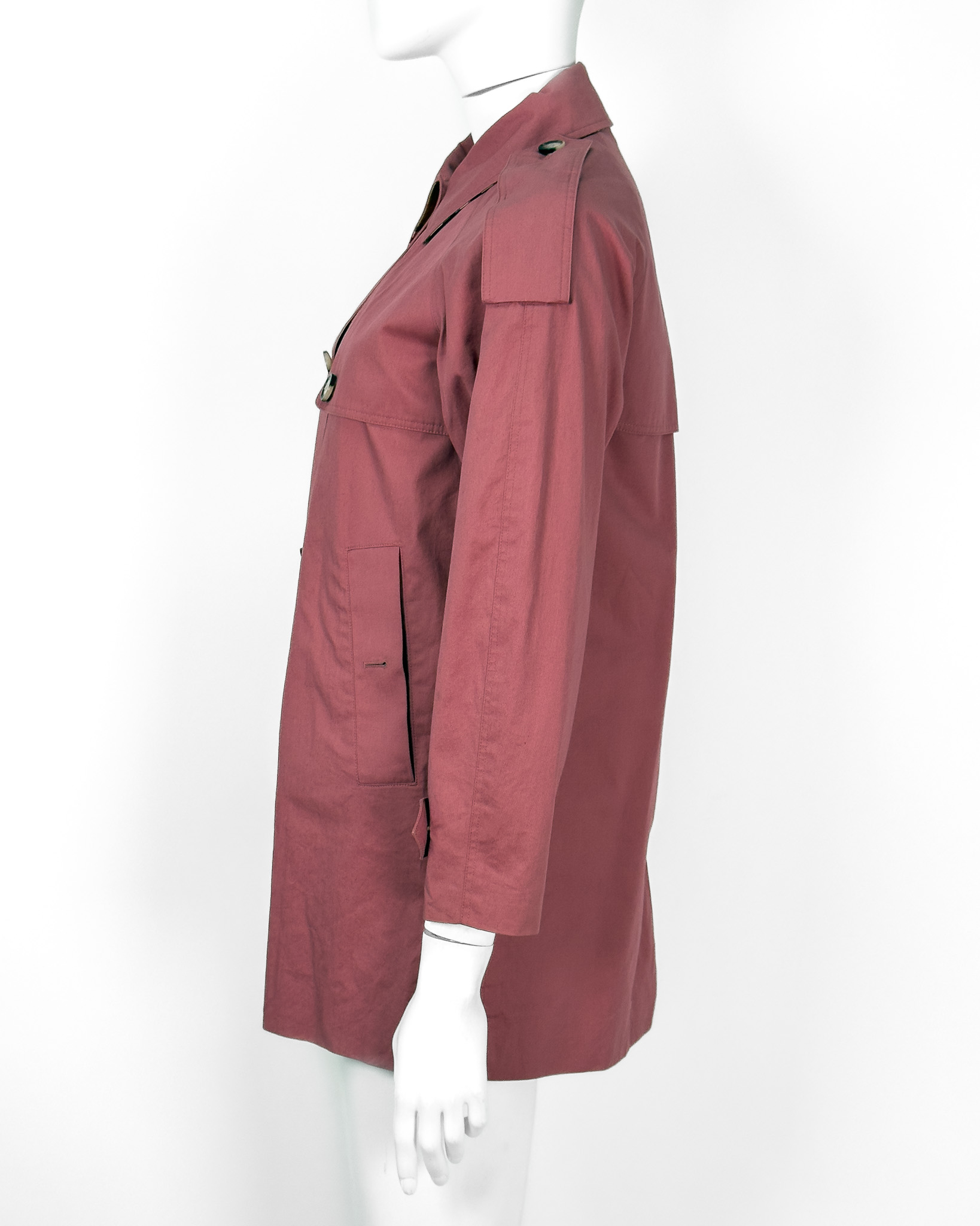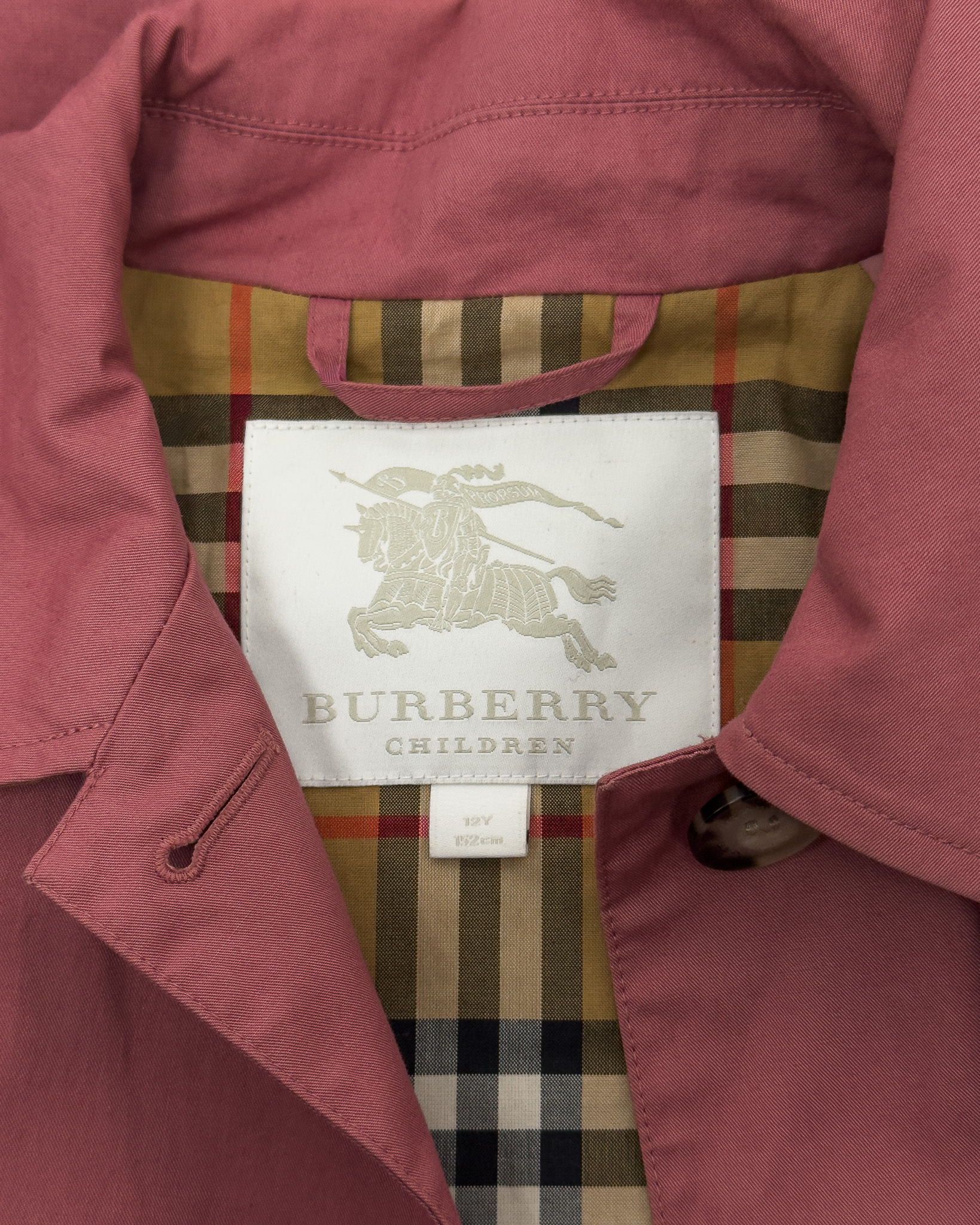 "Dziecięcy, różowy, bawełniany płaszczyk, zapinany na szylkretowe logowane guziki, podszewka w kratę, dwie kryte kieszenie po bokach, patki na ramionach, paski przy mankietach. Stan bardzo dobry. Rozmiar z metki 12 Y/ 152cm. Skład: 100% bawełna. Wymiary: szerokość mierzona od pachy do pachy 47cm, długość całkowita 75cm."