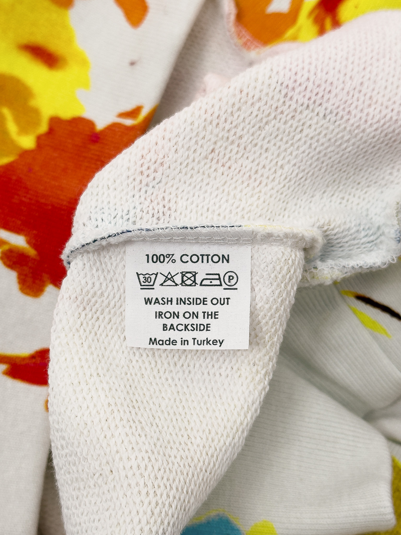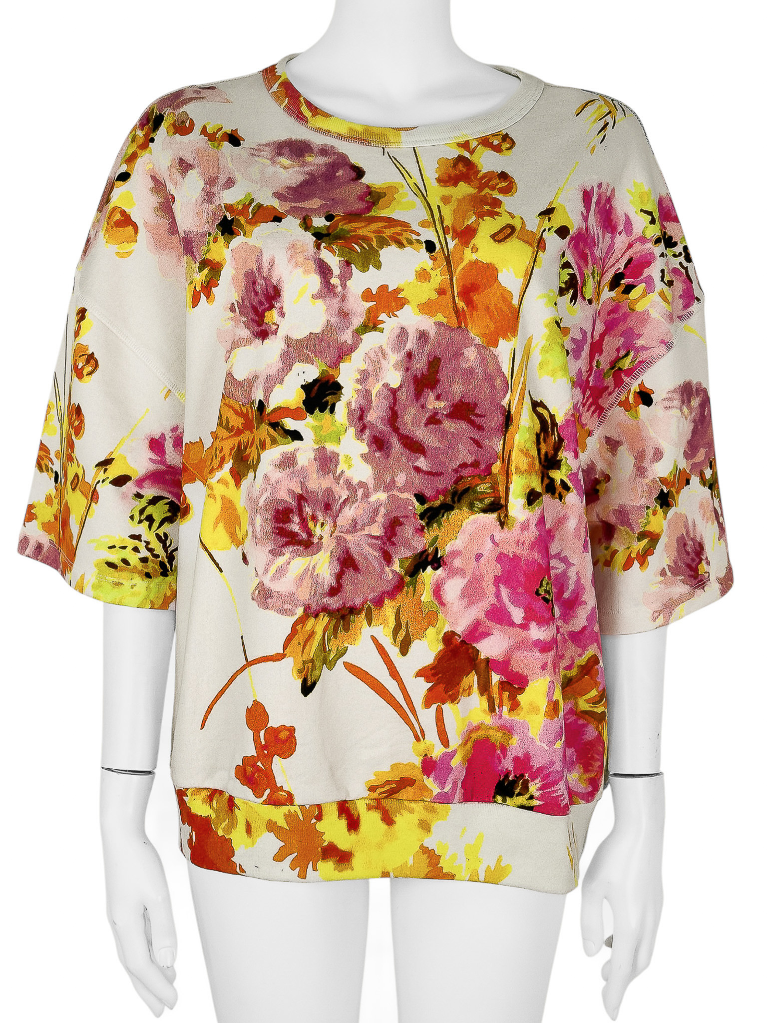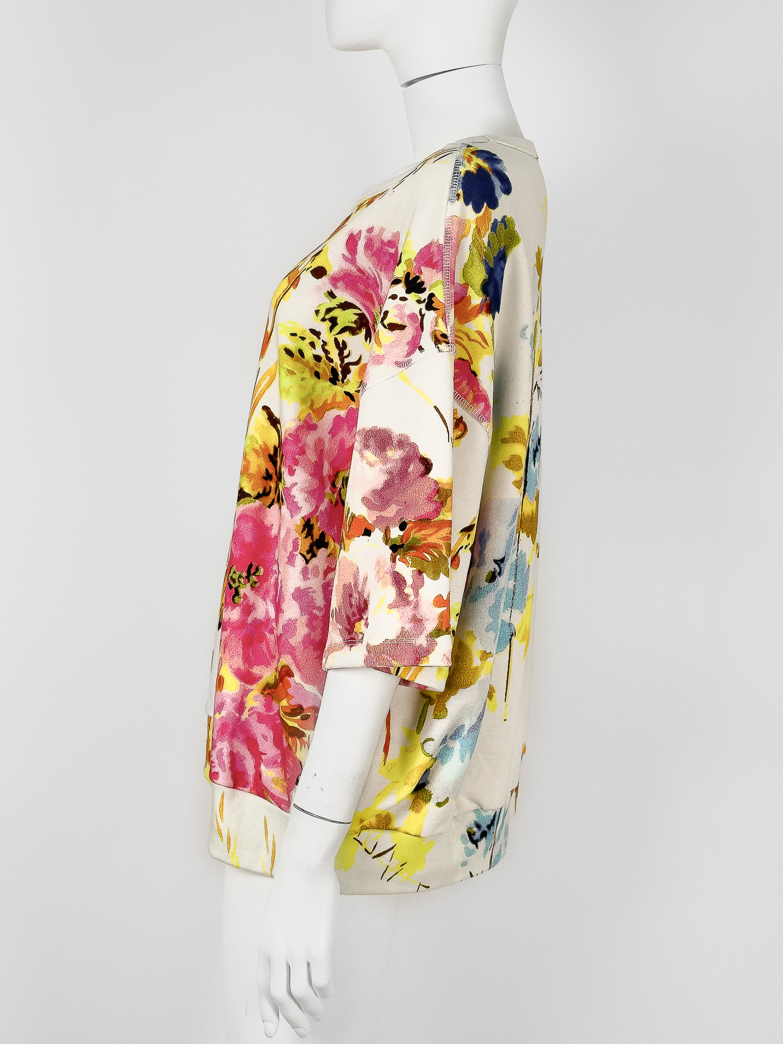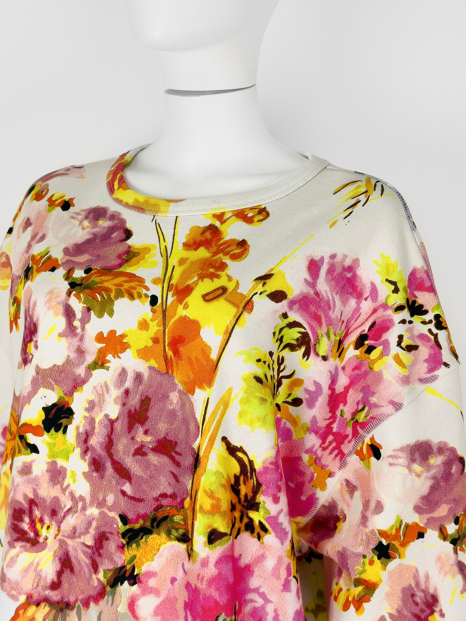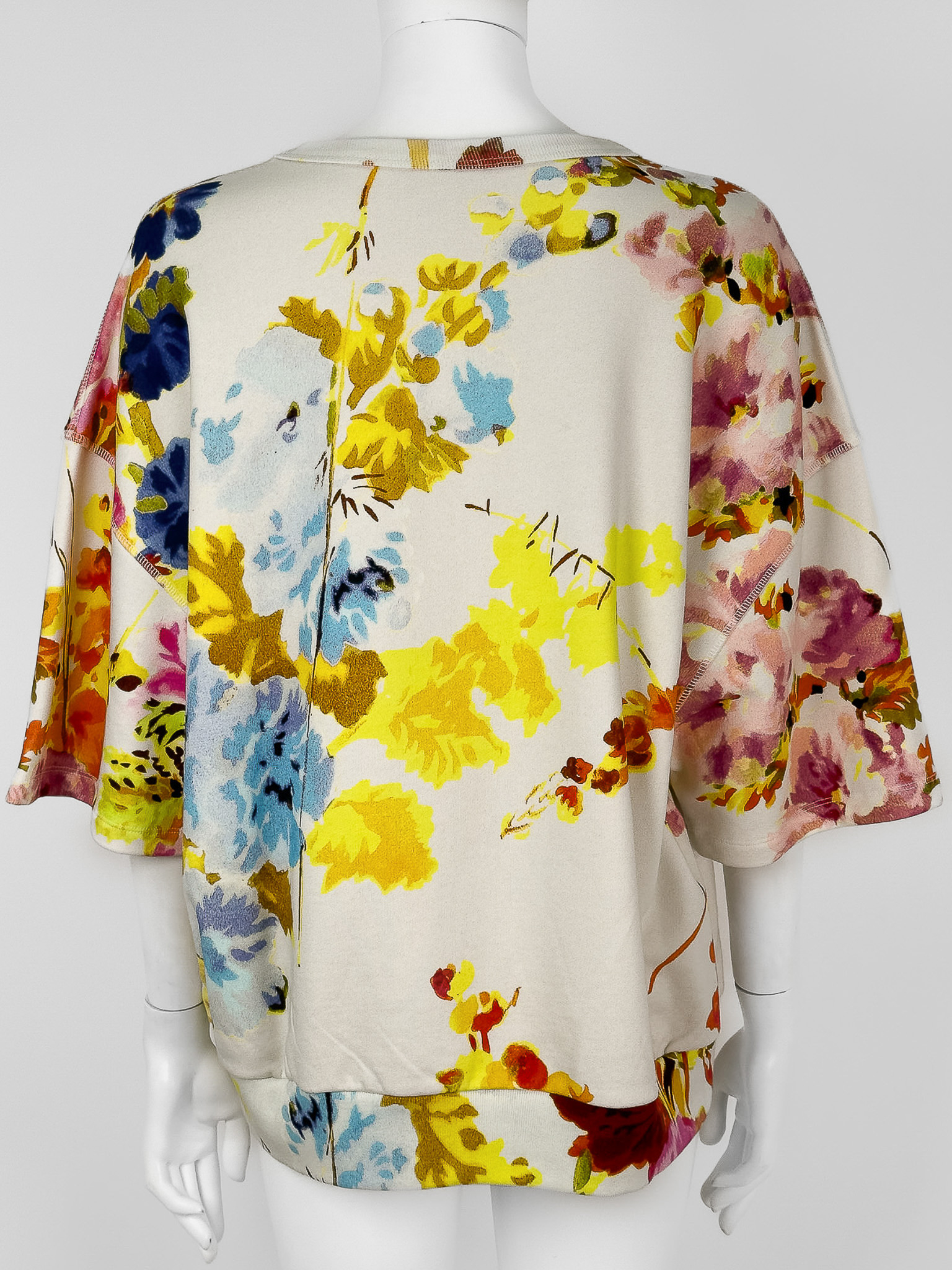 "Jasnobeżowy bawełniany t-shirt w wielobarwną grafikę kwiatową, krój oversize, zaokrąglony dekolt, obniżona linia ramion, wykończony ściągaczem. Stan bardzo dobry. Rozmiar z metki M. Skład: 100% bawełna. Wymiary: szerokość mierzona od pachy do pachy 67cm, długość całkowita 66cm.Kolekcja spring summer 2020"