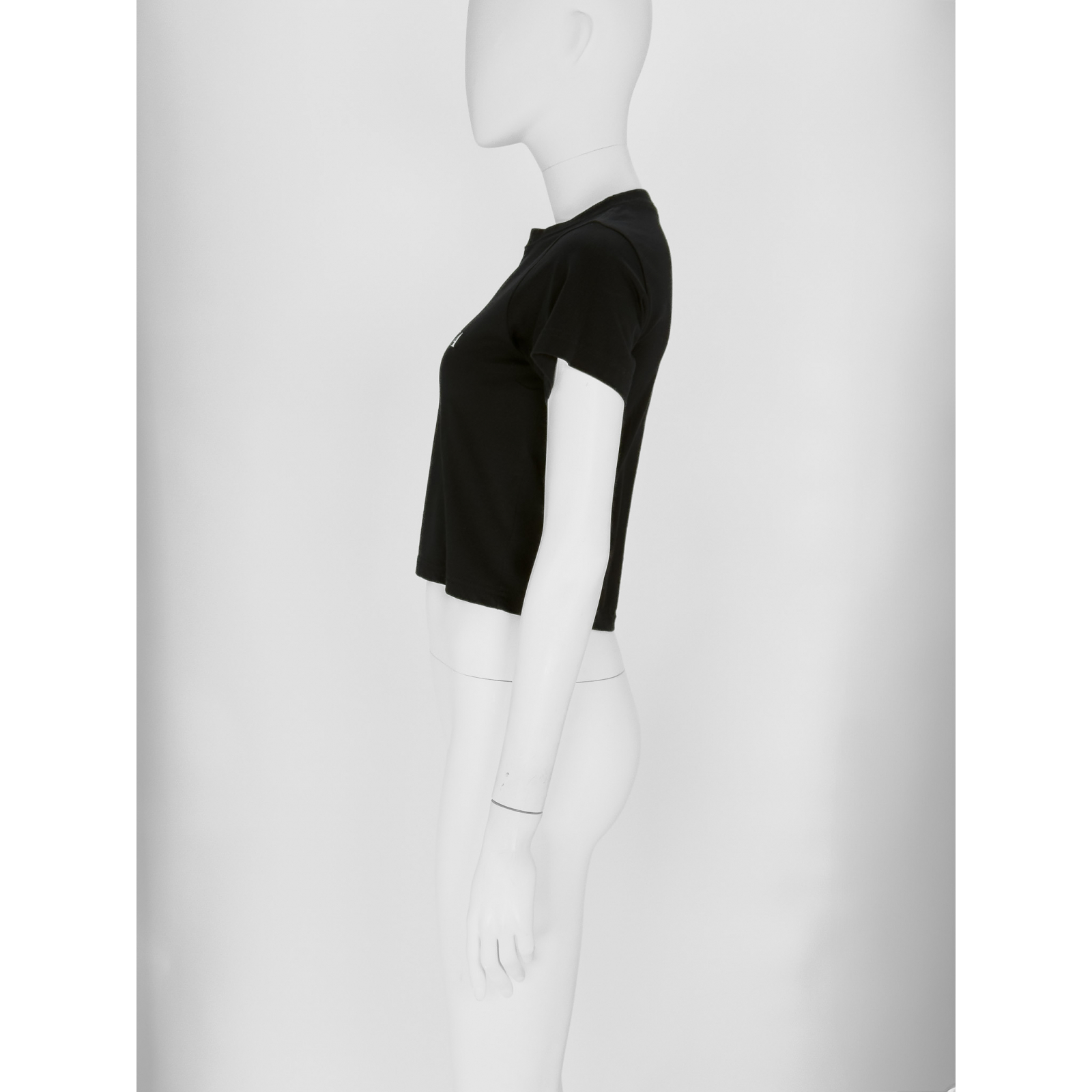 "Czarny bawełniany t-shirt o krótszym kroju ozdobiony białą grafiką z logo marki w centralnej części, zaokrąglony dekolt wykończony ściągaczem. Rozmiar z metki S. Skład: 100% bawełna. Wymiary: szerokość mierzona od pachy do pachy 40cm, długość całkowita 45cm."
