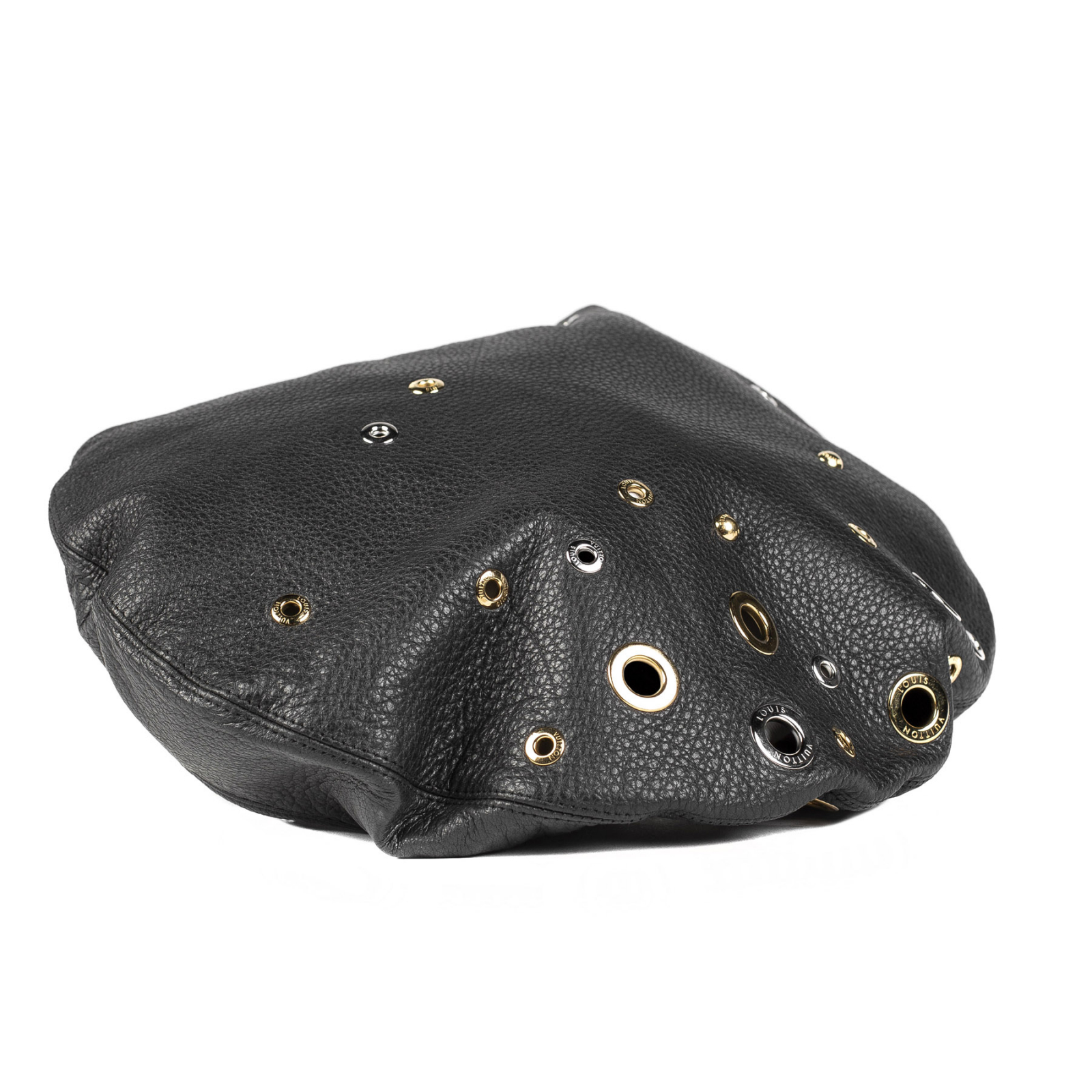 "czarny, skórzany beret ze złotymi i srebrnymi logowanymi nitami"