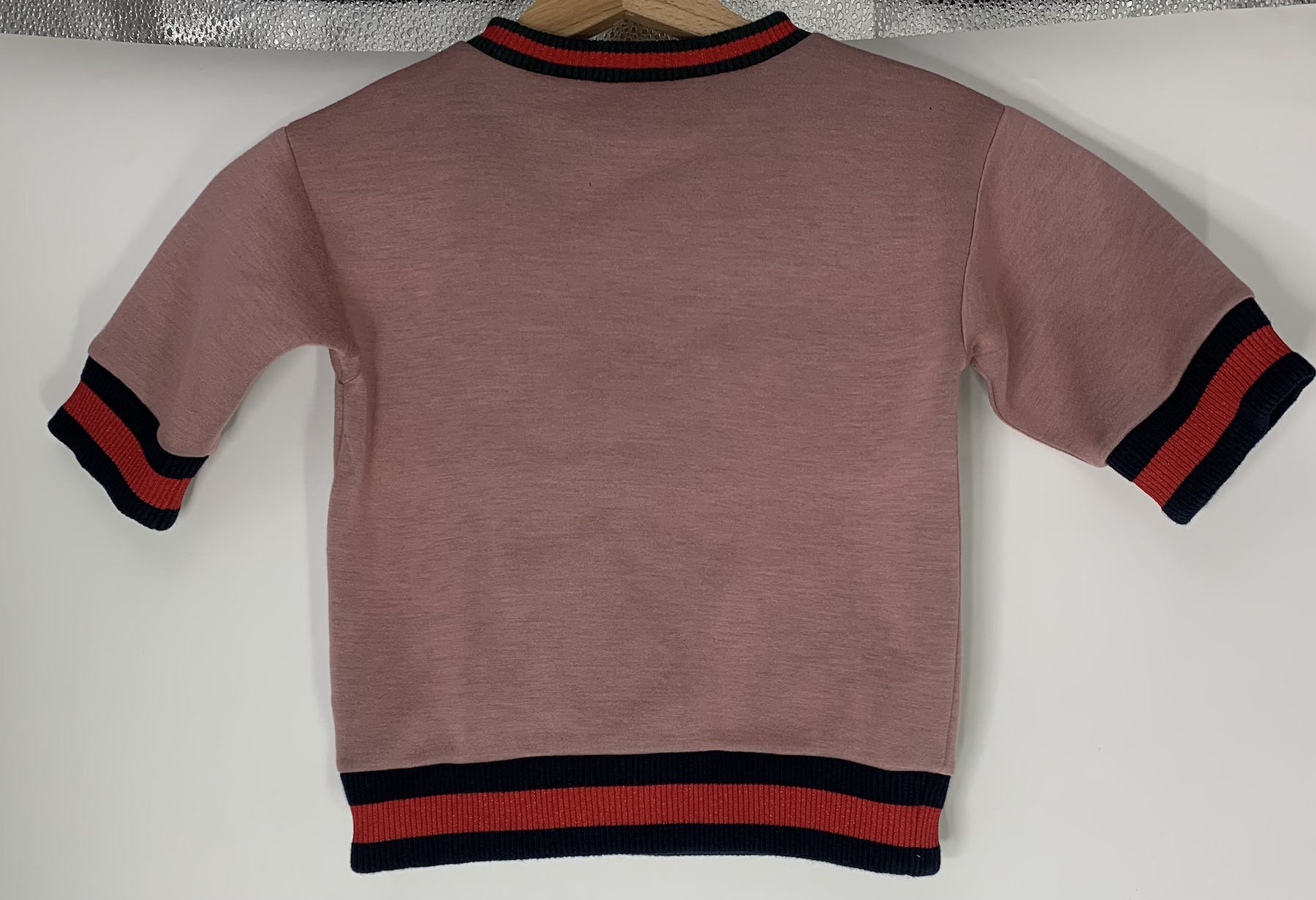 "różowa bluza z krótkim rękawem, granatowo-czarne ściągacze, haftowany kwiat na przodzie, rozmiar 4y, dł 40cm, szer klatka 34cm, dł rękaw 19cm"