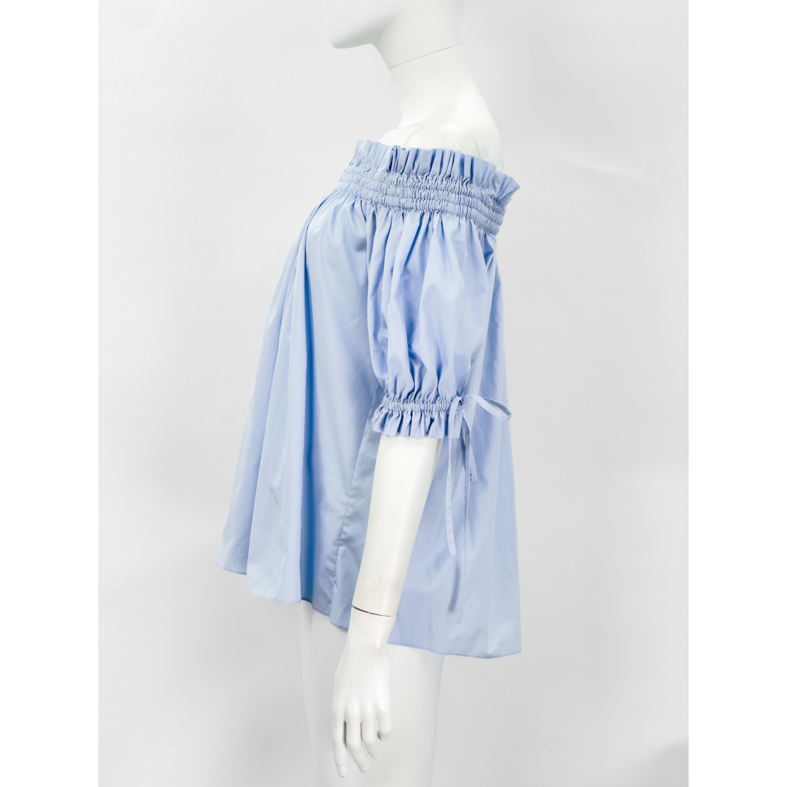 "Błękitna bluzka typu hiszpanka, marszczenie przy dekolcie wykończone gumą, bufiaste rękawy zakończone wstążką. Rozmiar z metki IT 38. Skład: 100% bawełna. Wymiary: szerokość mierzona od pachy deo pachy 45cm, długość całkowita 56cm."