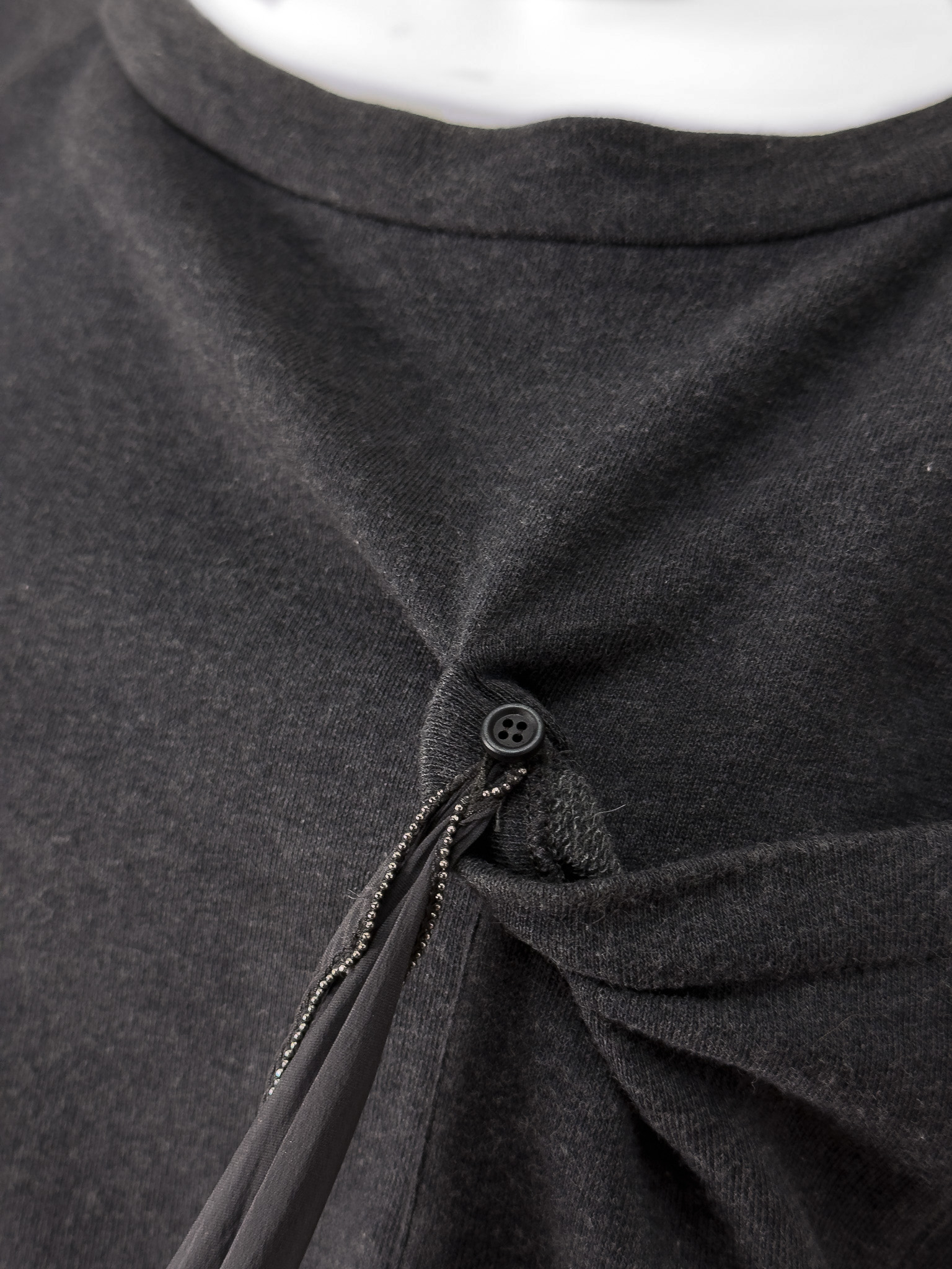 "Grafitowa bluza, prosty krój, kieszeń w okolicy biustu z jedwabną, odpinaną pochette ozdobioną koralikami, charakterystycznymi dla marki, zaokrąglony dekolt, wykończona ściągaczem. Stan bardzo dobry. Rozmiar z metki M. Skład: 100% bawełna; pochette: 100% jedwab. Wymiary: szerokość mierzona od pachy do pachy 55cm, długość całkowita 61cm."