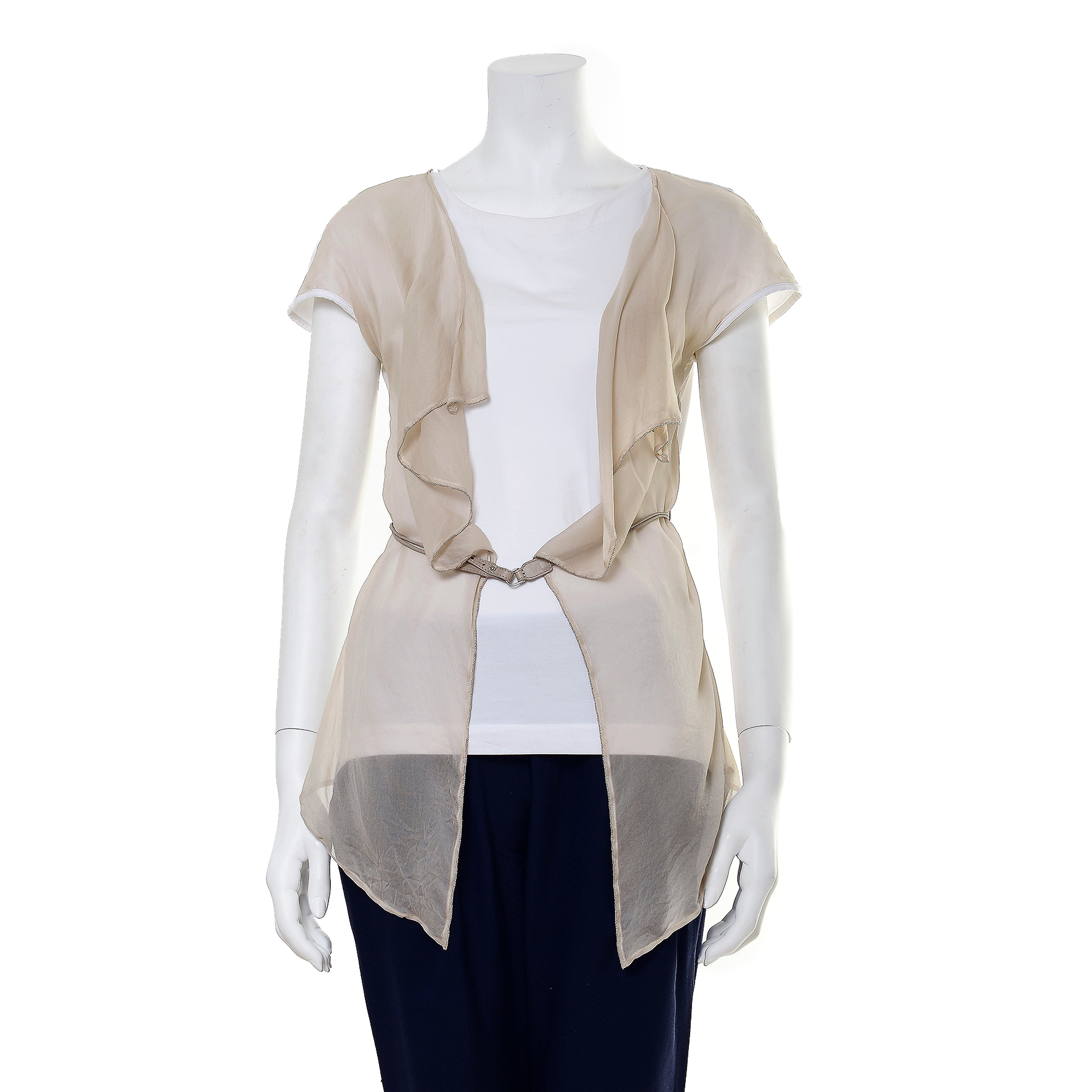 "Biały t-shirt z jedwabnymi wstawkami i skórzanym paseczkiem. Rozmiar S , wykonana z bawełny"