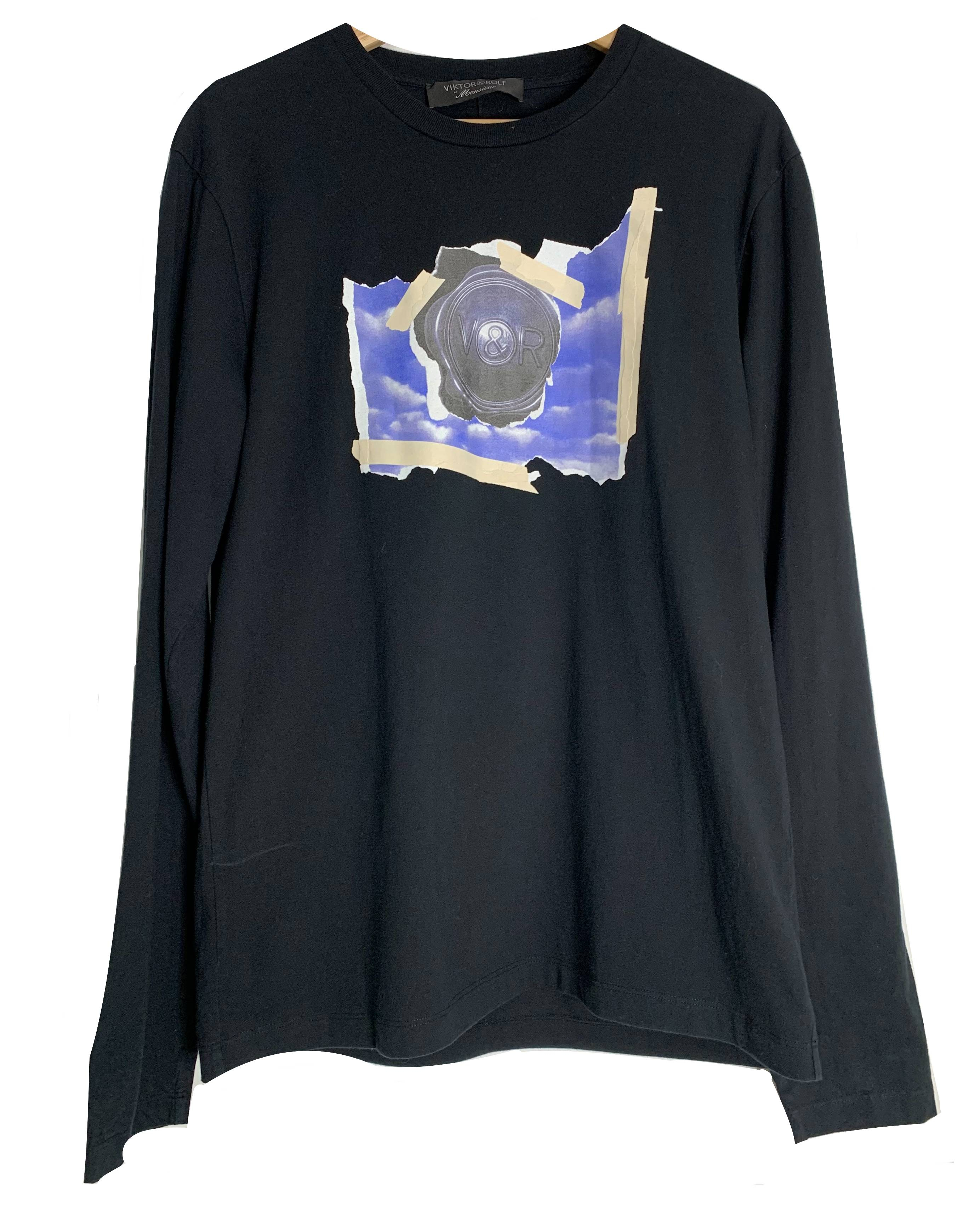 "czarny longsleeve z motywem nieba i logotypem na przodzie, biała plamka na plecach, rozmiar L, 100% bawełna