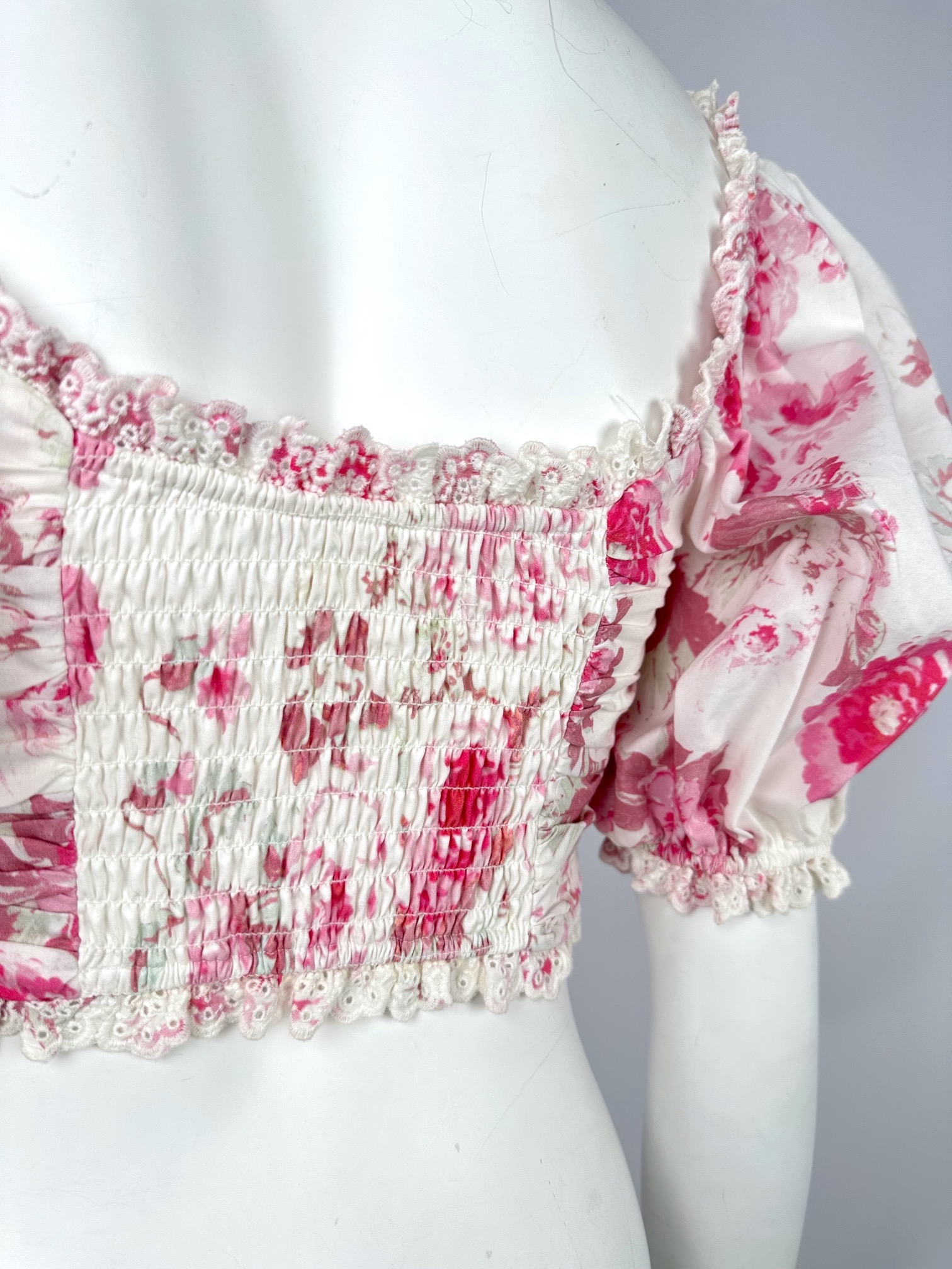 "biało różowa krótka bluzka z gorsetowym wiązaniem na przodzie, obszyta koronką krótkie bufiaste rękawy, marszczenie na plecach. Widoczne zabrudzenia przy wiązaniu. Rozmiar XS. Skład: 68% bawełna, 29% poliester. Wymiary: szer. ramion 35 cm, szer. biustu 35 cm, szer. talii 29 cm, dł. całkowita 35 cm, dł. rękawa 32 cm."