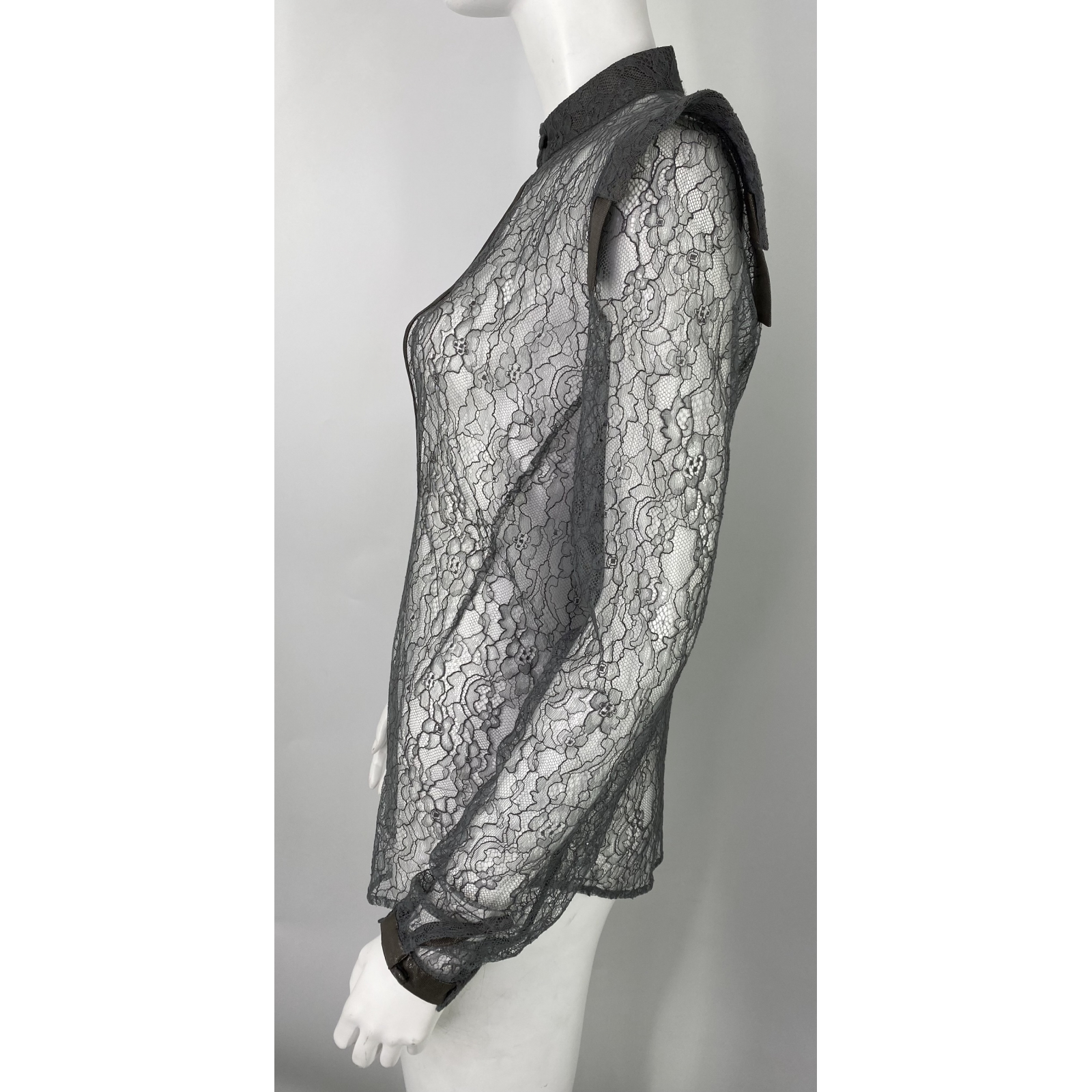 "szara koronkowa bluzka z kołnierzem i dużym dekoltem z przodu, długi rękaw. Rozmiar 38. Skład: 50% poliamid, 41% bawełna, 9% jedwab. Wymiary: szer. ramion 36 cm, szer. biustu 47 cm, szer. talii 44 cm, dł. całkowita 67 cm, dł. rękawa 70 cm."