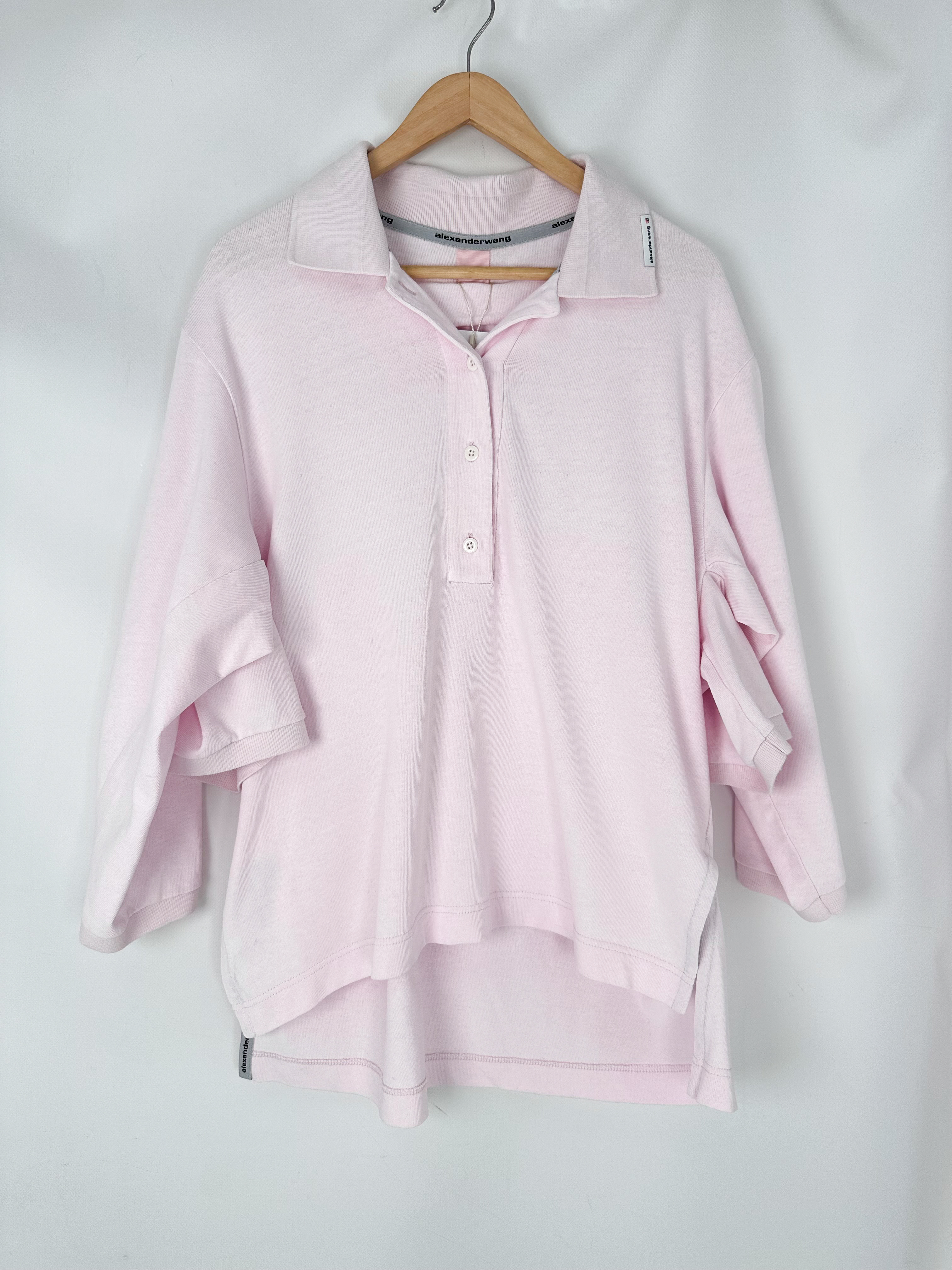 "Bluzka w kolorze pudrowego różu, podwójny rękaw, prosty krój, oversize, polo, krótszy przód, kołnierzyk ozdobiony naszywką z logo marki, zapinana w centralnej części na logowane guziki, rozcięcia po bokach z logo marki. Rozmiar z metki S. Skład: 100% bawełna. Wymiary: szerokość mierzona od pachy do pachy 61cm, długość całkowita 63cm."
