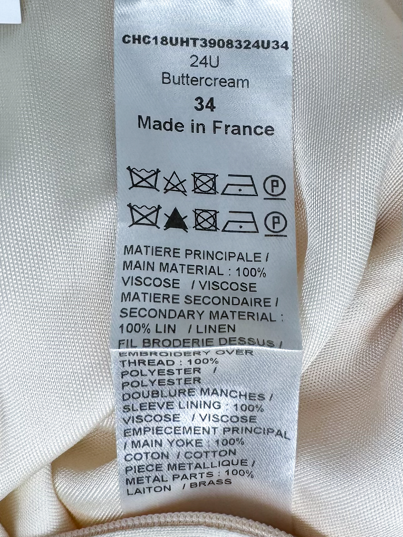 "Kremowa bluzka ozdobiona w przedniej części ażurową brzoskwiniową wstawką wykończoną białą wyszywaną grafiką oraz srebrnymi okrągłymi dżetami, postrzępiona stójka, asymetryczny dół, rękaw o długości 3/4 z falbanami, zapinana w tylnej części na kryty logowany suwak. Rozmiar z metki 34. Skład: 100% wiskoza, drugi materiał: 100% len. Wymiary: szerokość mierzona od pachy do pachy 40cm, długość całkowita 62cm."