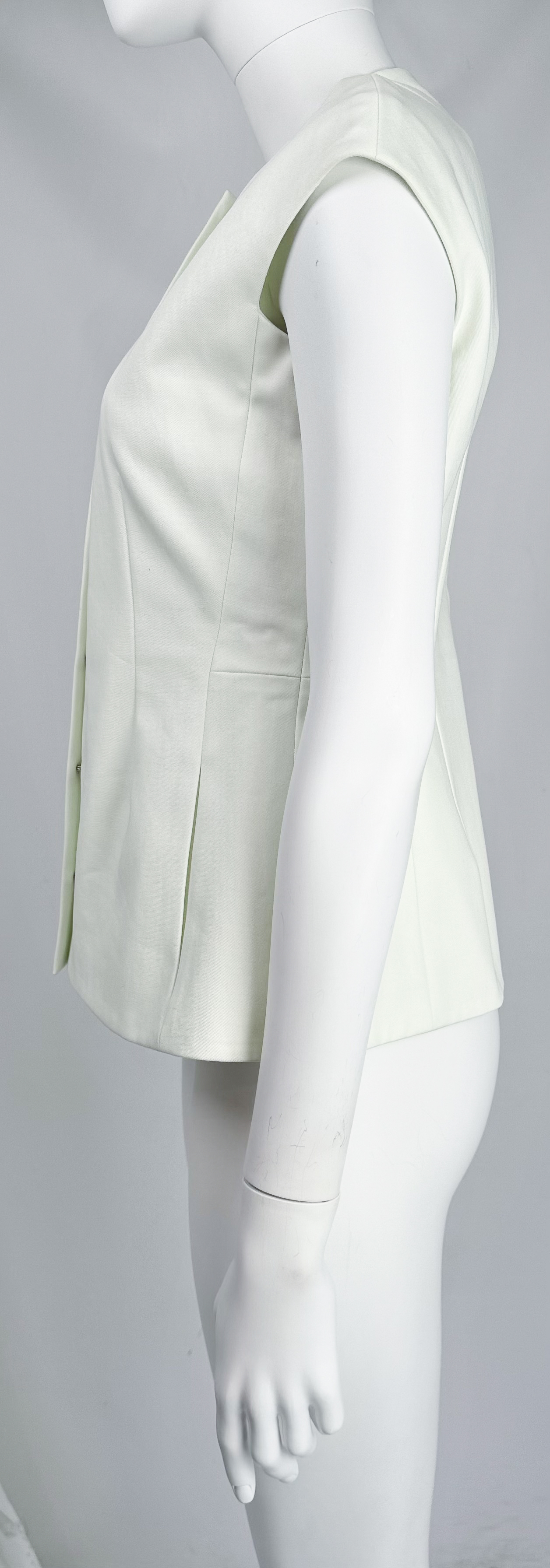 "Jasno miętowa bluzka zapinana na haftki, taliowana, półokrągły dekolt. Z metkami. Rozmiar z metki FR 38. Skład: 100% bawełna, podszewka: 100% jedwab. Wymiary: szerokość mierzona od pachy do pachy 45cm, długość całkowita 60cm."