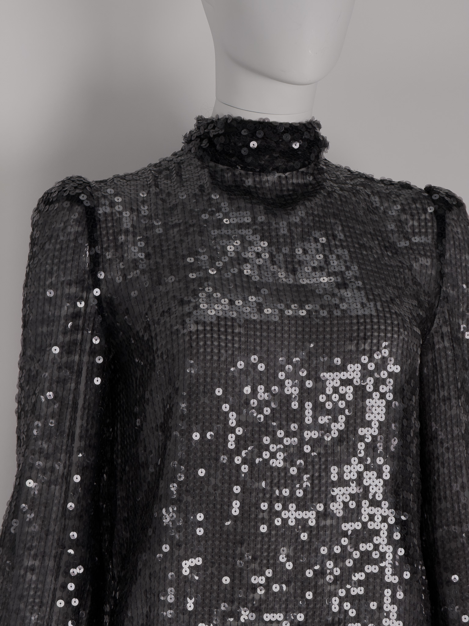 "Czarna bluzka z długim rękawem wysadzana cekinami ozdobiona wiązaniem na plecach w okolicy szyi, połyskująca, półgolf, bufiaste rękawy, rozpinane mankiety. Rozmiar z metki FR 38. Skład: 100% jedwab. Wymiary: szerokość mierzona od pachy do pachy 48cm, długość całkowita 59cm."