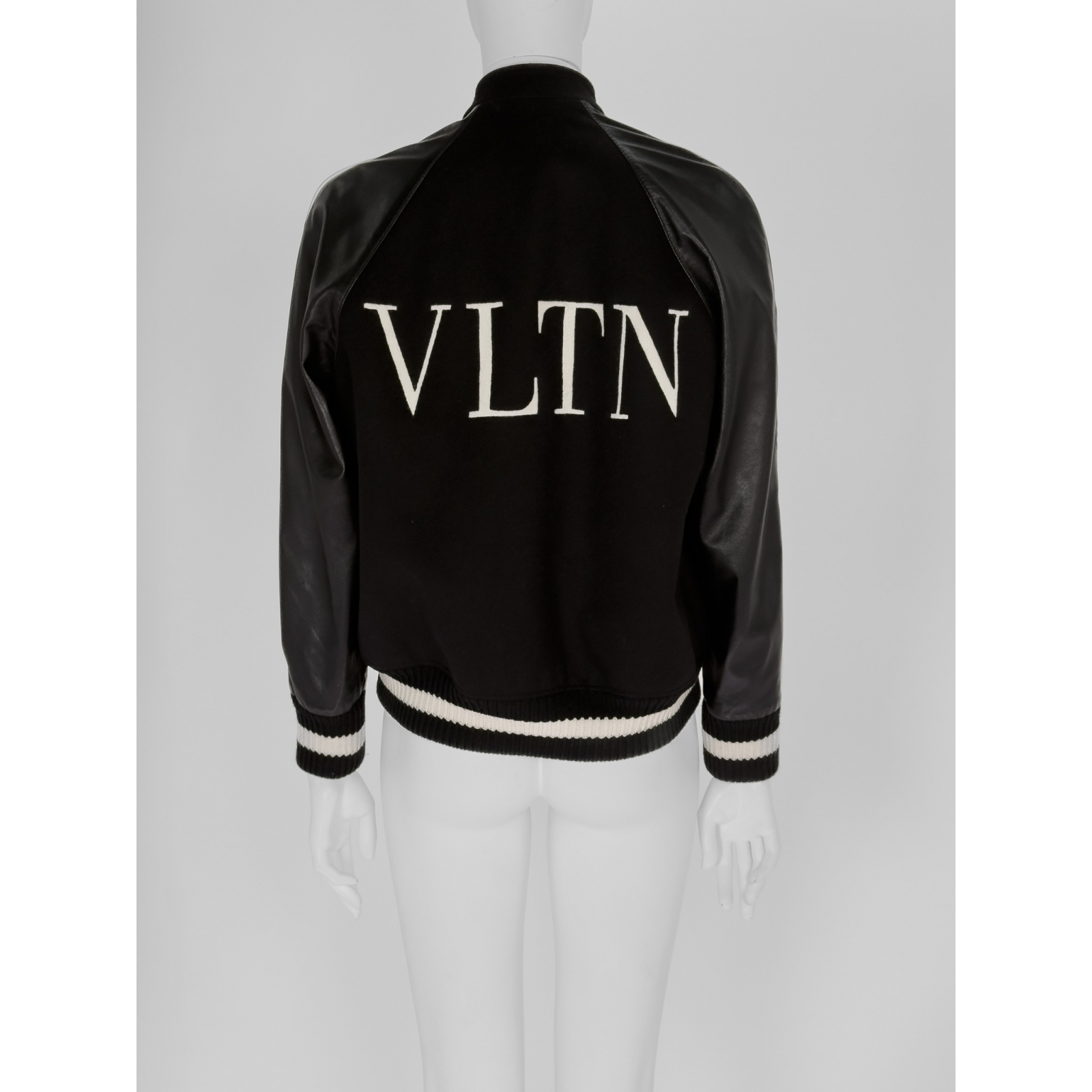 "Czarna bomberka wykonana z łączonych materiałów, duże białe logo marki na plecach, skórzane rękawy, zapinana na zatrzaski, stójka, dwie kryte kieszenie po bokach, biała lamówka, dzianinowy ściągacz przy mankietach oraz w dolnej części ozdobiony białym paskiem. Rozmiar z metki IT 38. Skład: skóra jagnięca; 95% wełna dziewicza, 5% kaszmir. Wymiary: szerokość mierzona od pachy do pachy: 56cm, długość całkowita: 61cm."