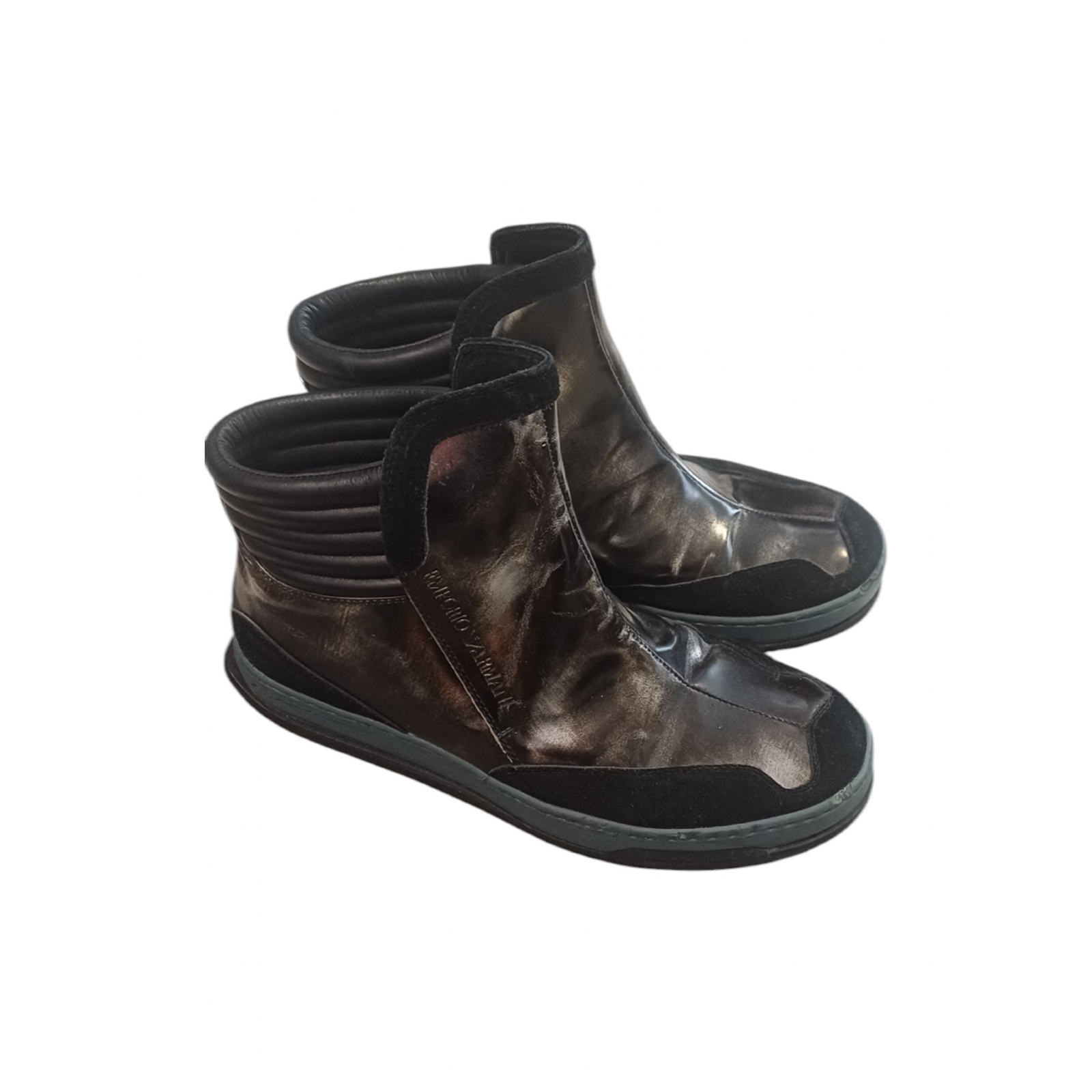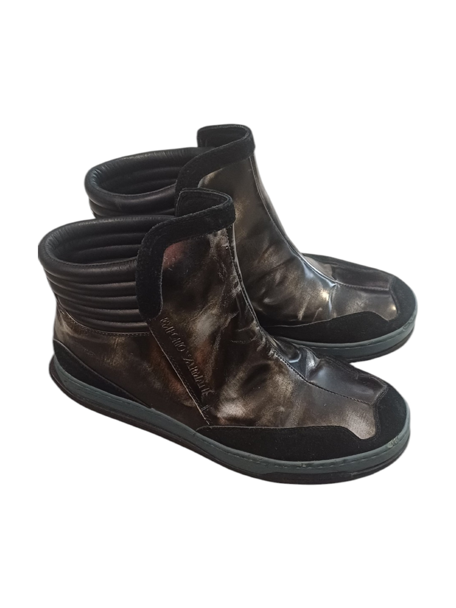 "Brązowo-czarne botki wykonane z łączonych materiałów, lakierowana skóra, wytłaczane logo marki w bocznej części, w zestawie z workiem przeciwkurzowym. Stan bardzo dobry. Rozmiar 45."