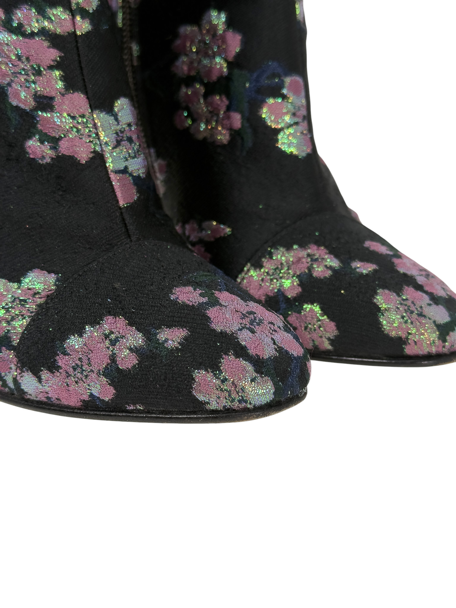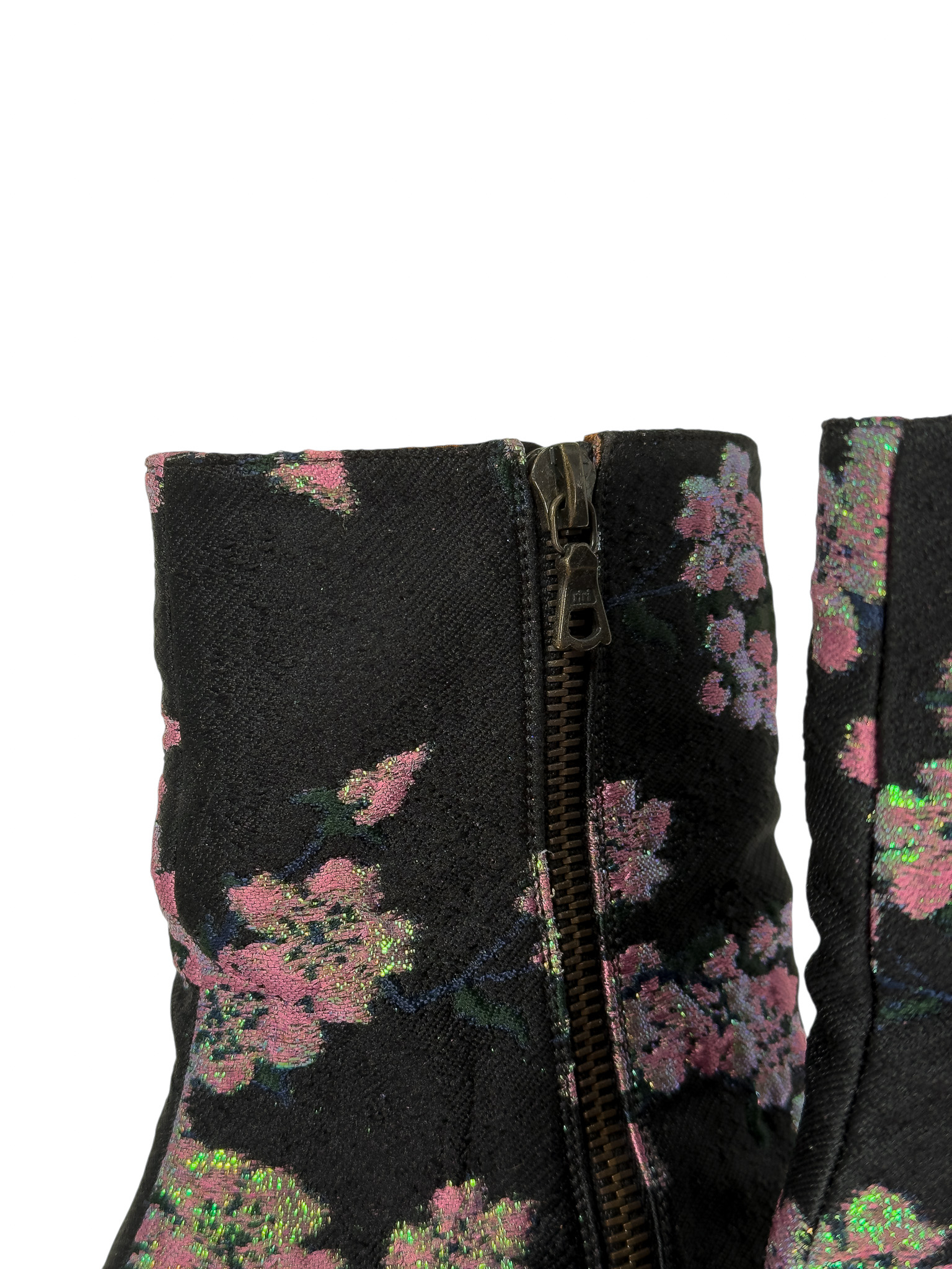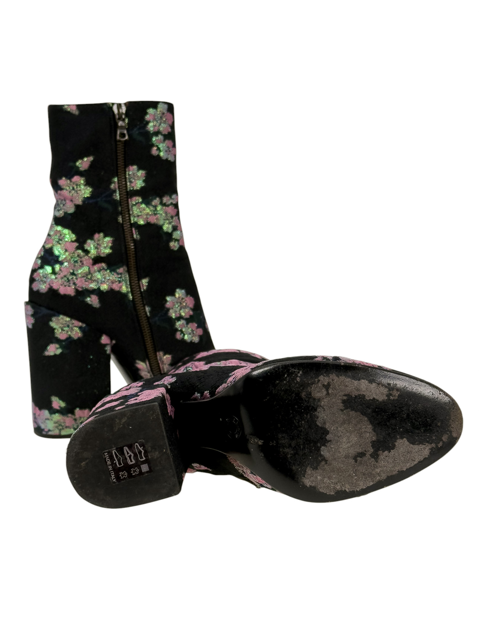 "Czarne botki na obcasie ozdobione wyszywaną różową grafiką kwiatów wykończoną błyszczącą zieloną nitką, zapinane od wewnętrznej strony na suwak, zaokrąglone noski, skórzane cieliste wnętrze. Stan bardzo dobry, posiadają ślady użytkowania na podeszwie. Rozmiar 40."