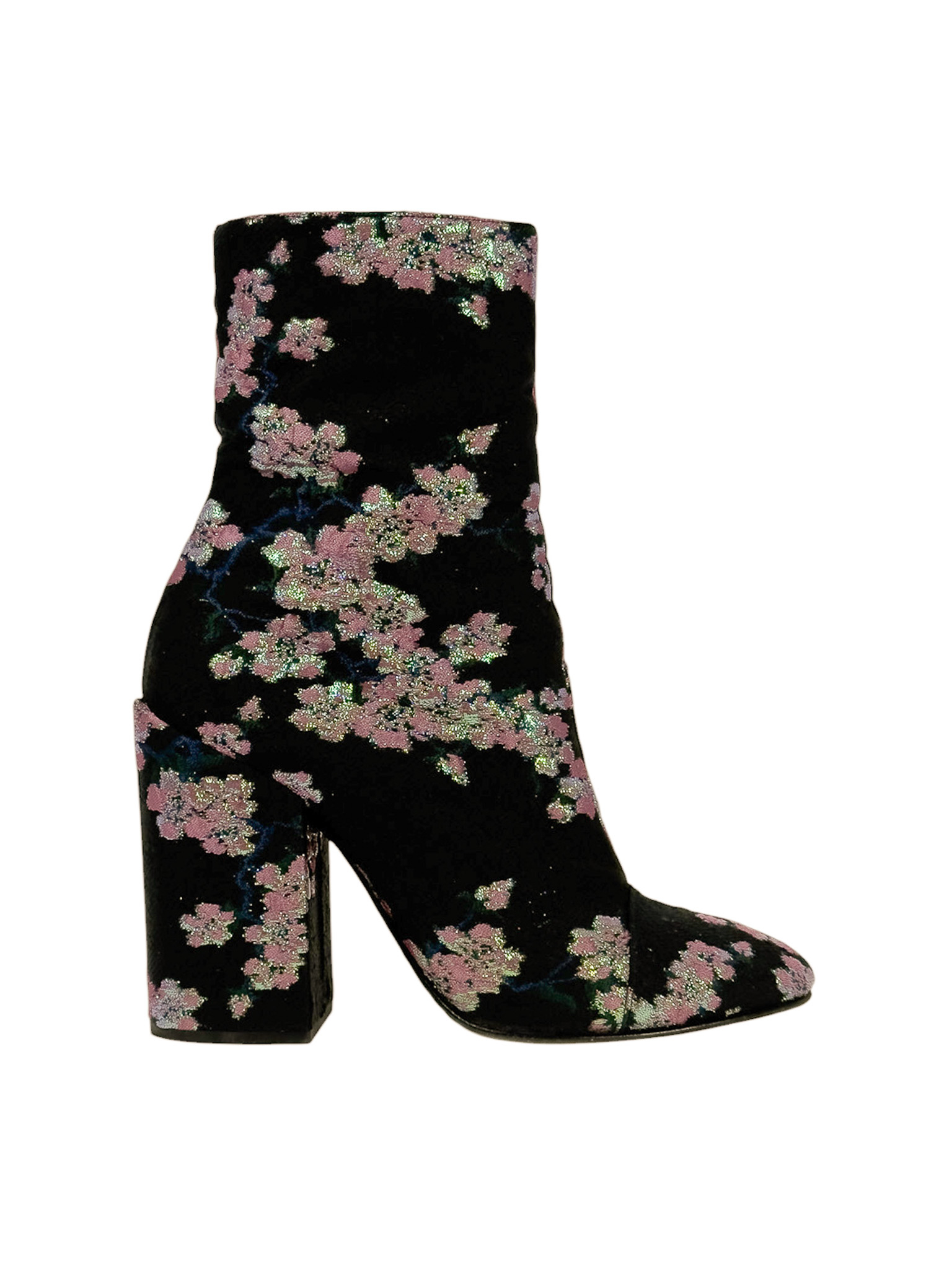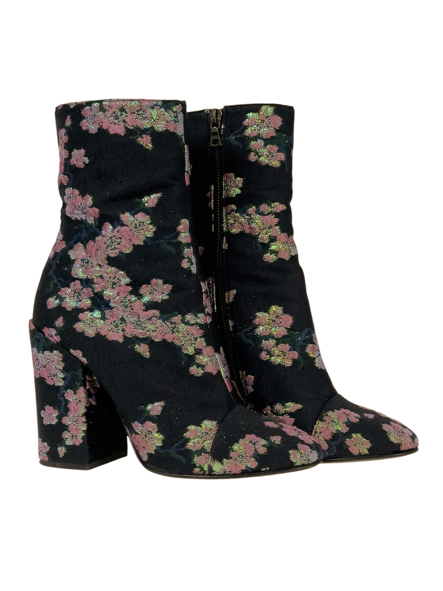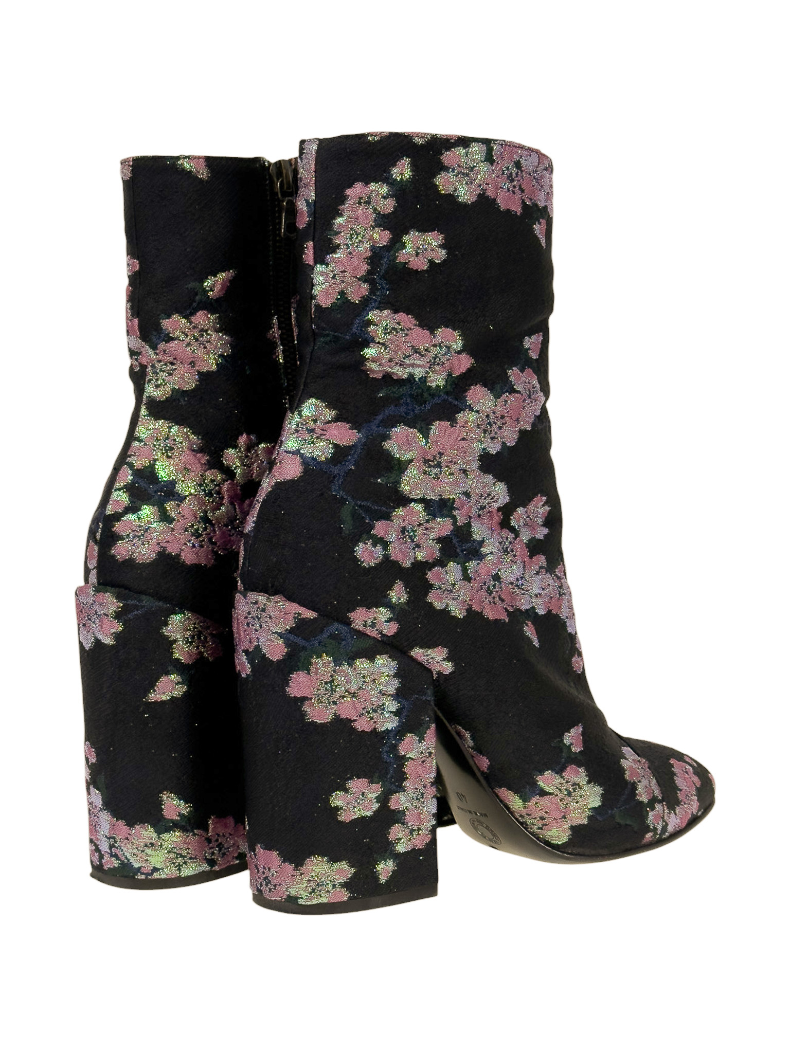 "Czarne botki na obcasie ozdobione wyszywaną różową grafiką kwiatów wykończoną błyszczącą zieloną nitką, zapinane od wewnętrznej strony na suwak, zaokrąglone noski, skórzane cieliste wnętrze. Stan bardzo dobry, posiadają ślady użytkowania na podeszwie. Rozmiar 40."