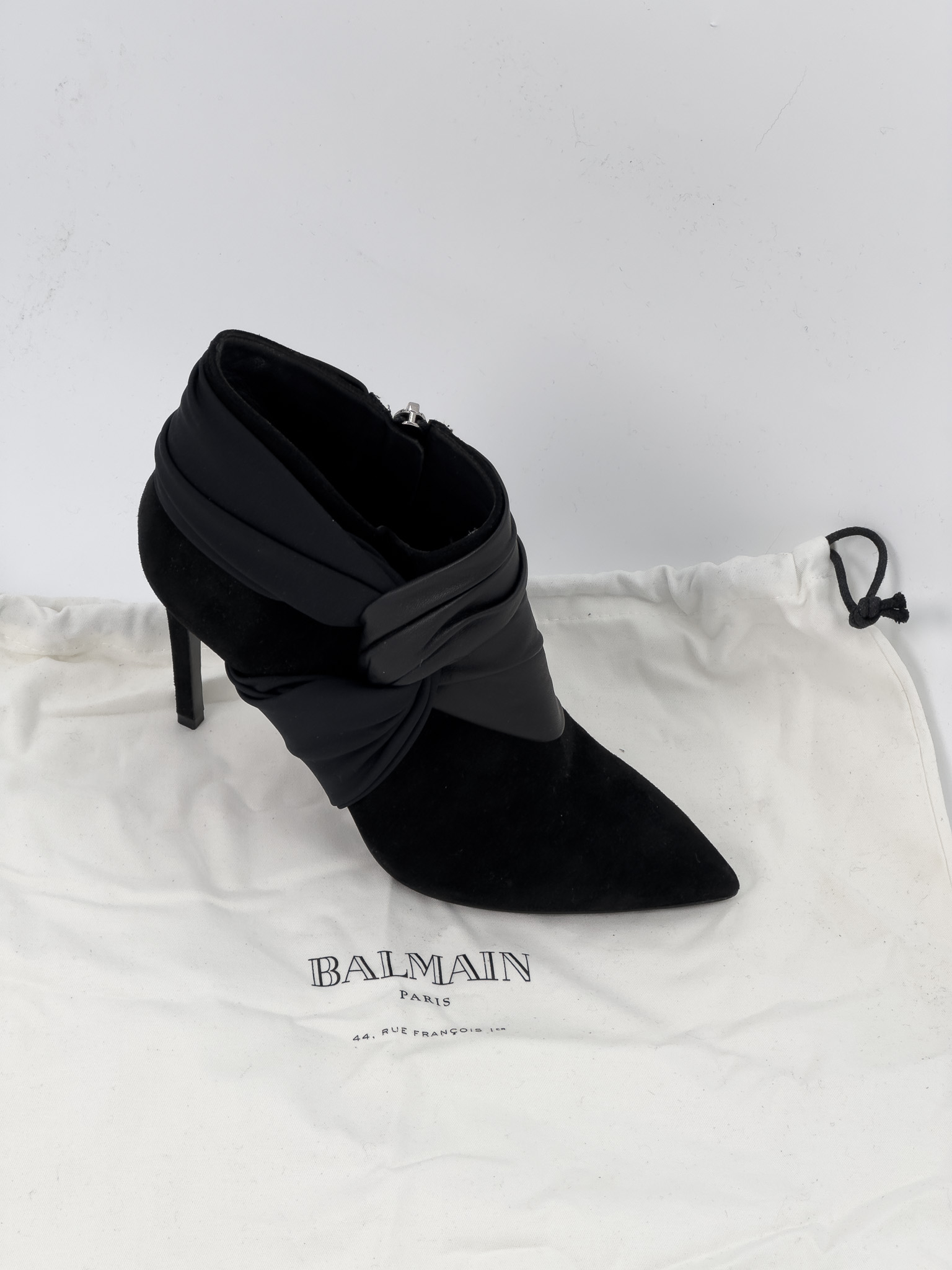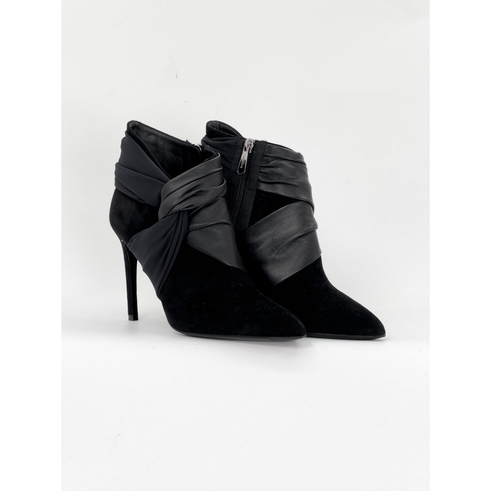 "Czarne zamszowe botki na szpilce z motywem przeplatanej skóry, zapinane na zamek od wewnątrz. Rozmiar 38. Worek przeciwkurzowy w komplecie. Stan bardzo dobry, jeden nosek posiada delikatne przetarcie."
