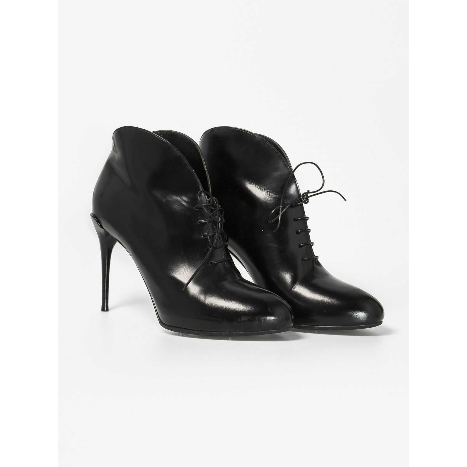 "Czarne skórzane botki na szpilce, gładka skóra, migdałowe noski, sznurowane, cienkie skórzane sznurówki, zaokrąglona cholewka, podzelowane. Stan dobry, marszczenia, rysy oraz niewielkie zadrapania na skórze, zabrudzenia na podeszwie oraz przetarcia na flekach. Rozmiar 38, wysokość obcasa 10cm."